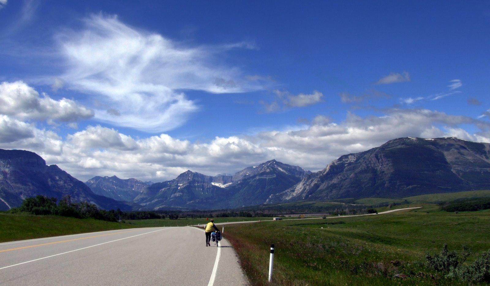 Salvation came, in a way, when we turned left on to a lesser road into Waterton Lake national park. Now the wind was less against us but far less predictable. The mountain edges sent it swirling in all senses, like a drunken man bouncing