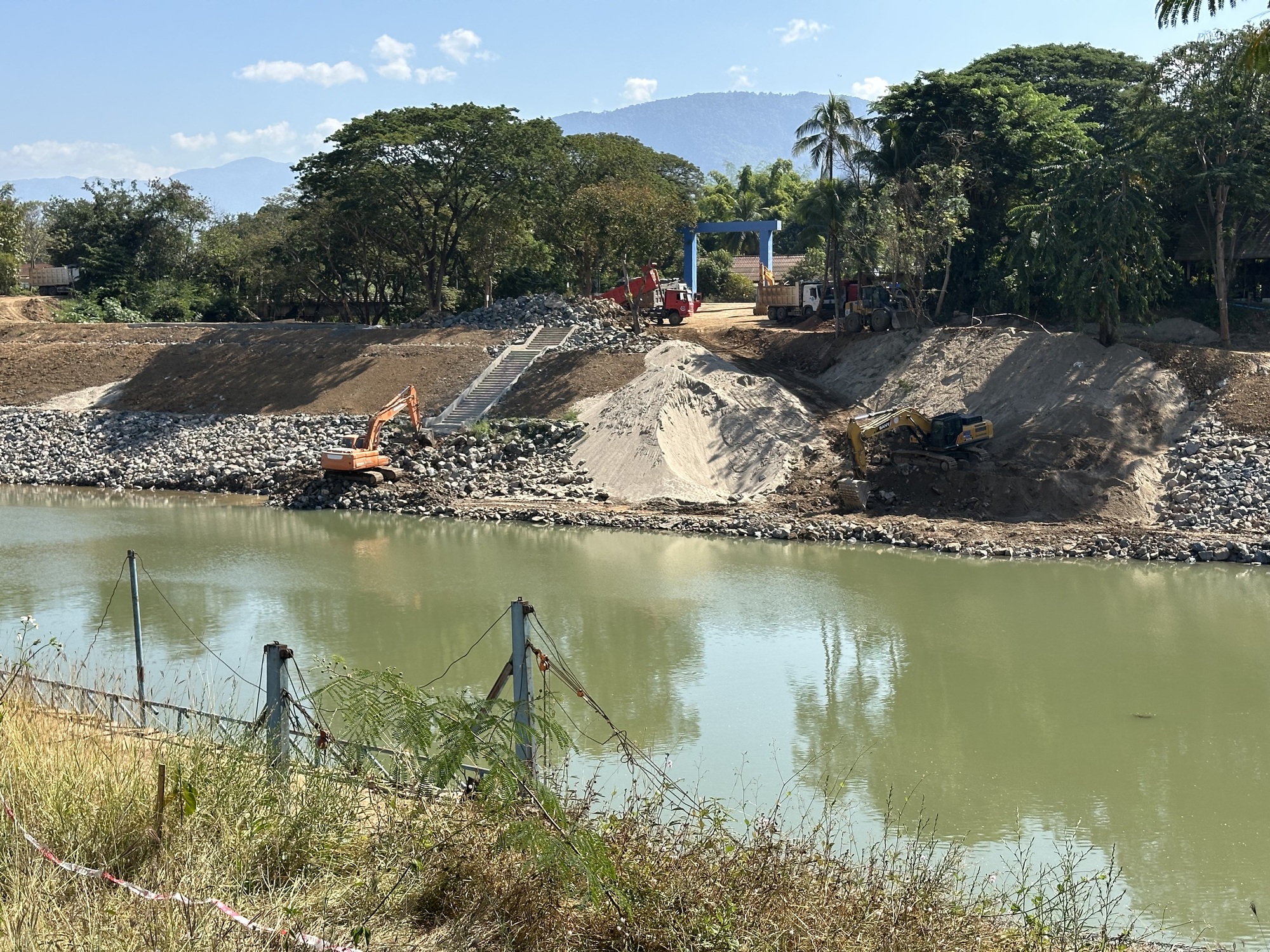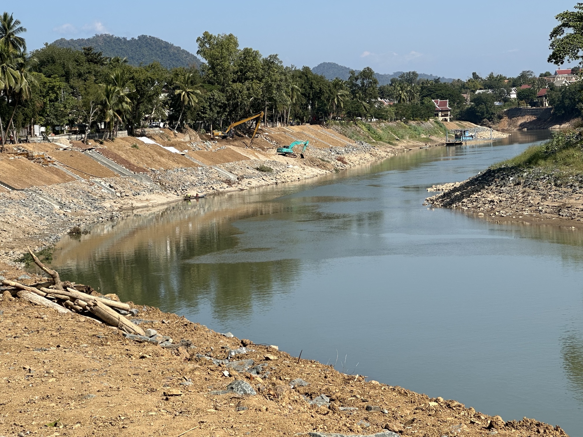 Along the Nam Khan during the day there was a lot of busy shoreline restoration/preservation going on, with Thai-style rock shoring up. There had been two years in a row with near disaster-level flooding and what used to be little winter vegetable gardens on the banks of the river had all been washed away and it was imperative that they keep it from undercutting it further and endangering riverside buildings. So the clank of equipment was going on every day but it was fine with us. We wished our grandson was there to watch the big machines do their thing with sand and rocks and a lot of satisfying noise.