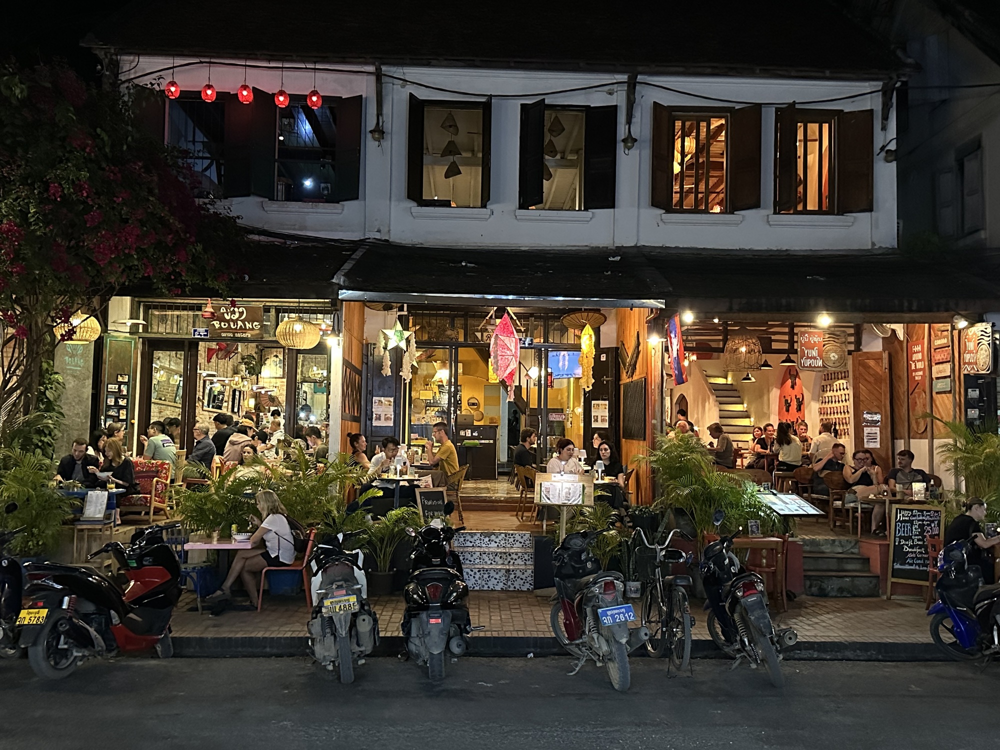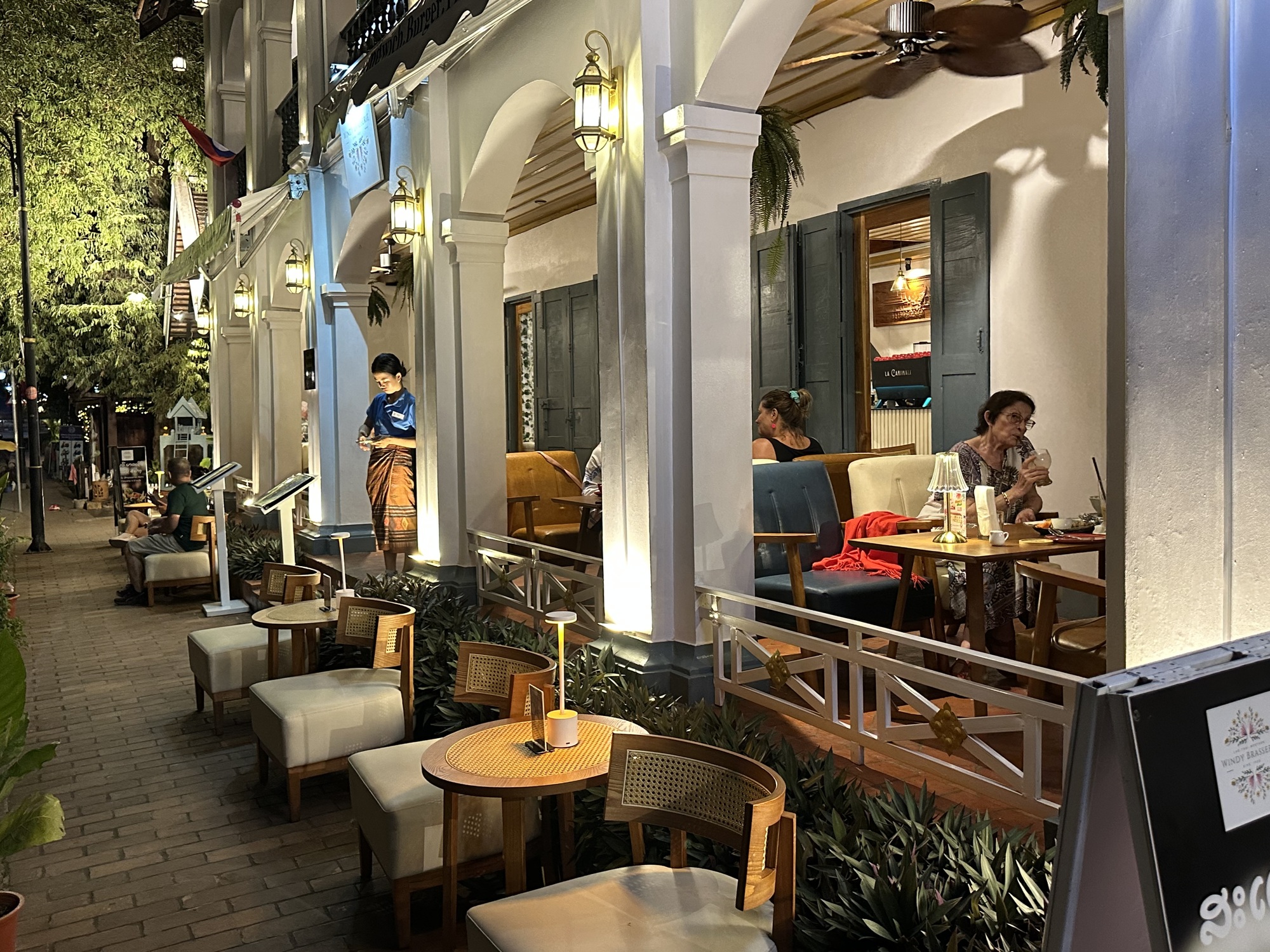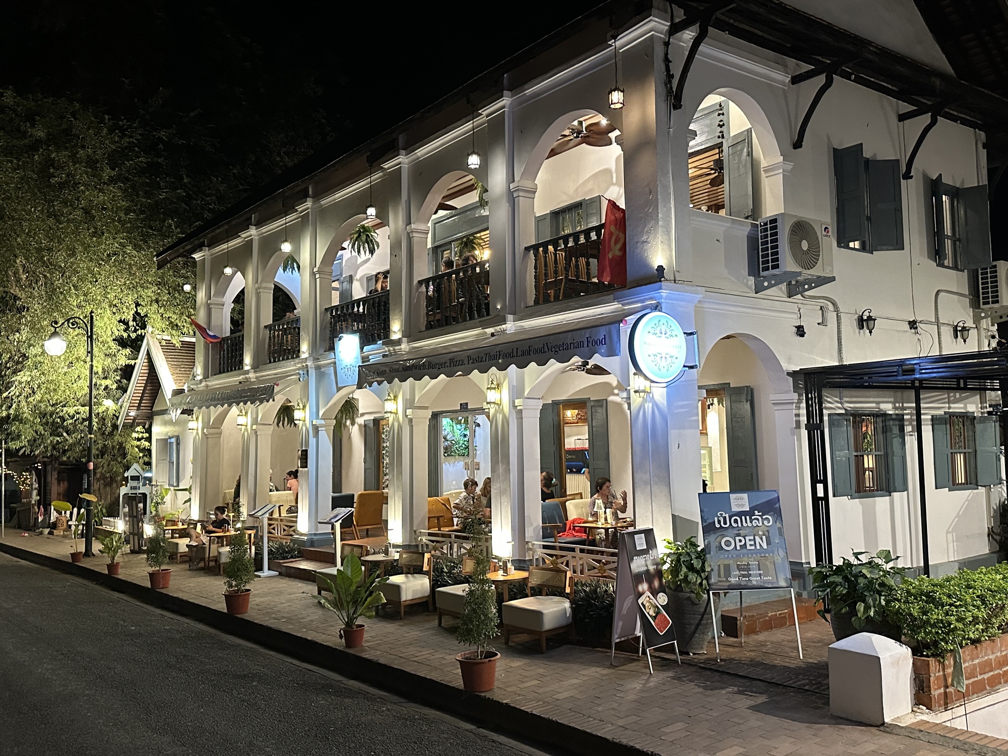 So, now, time to celebrate our last evening in Luang Prabang. We want to spend out our Lao kip because it’s worthless outside of the country, but do we have enough for two more hotel nights and some unknown transport costs and meals? We do. But not enough for a night on the town in Luang Prabang so we changed $20 and went to dinner in the most beautiful restaurant on the main street. There is upstairs balcony seating so we went early and grabbed one of those tables.