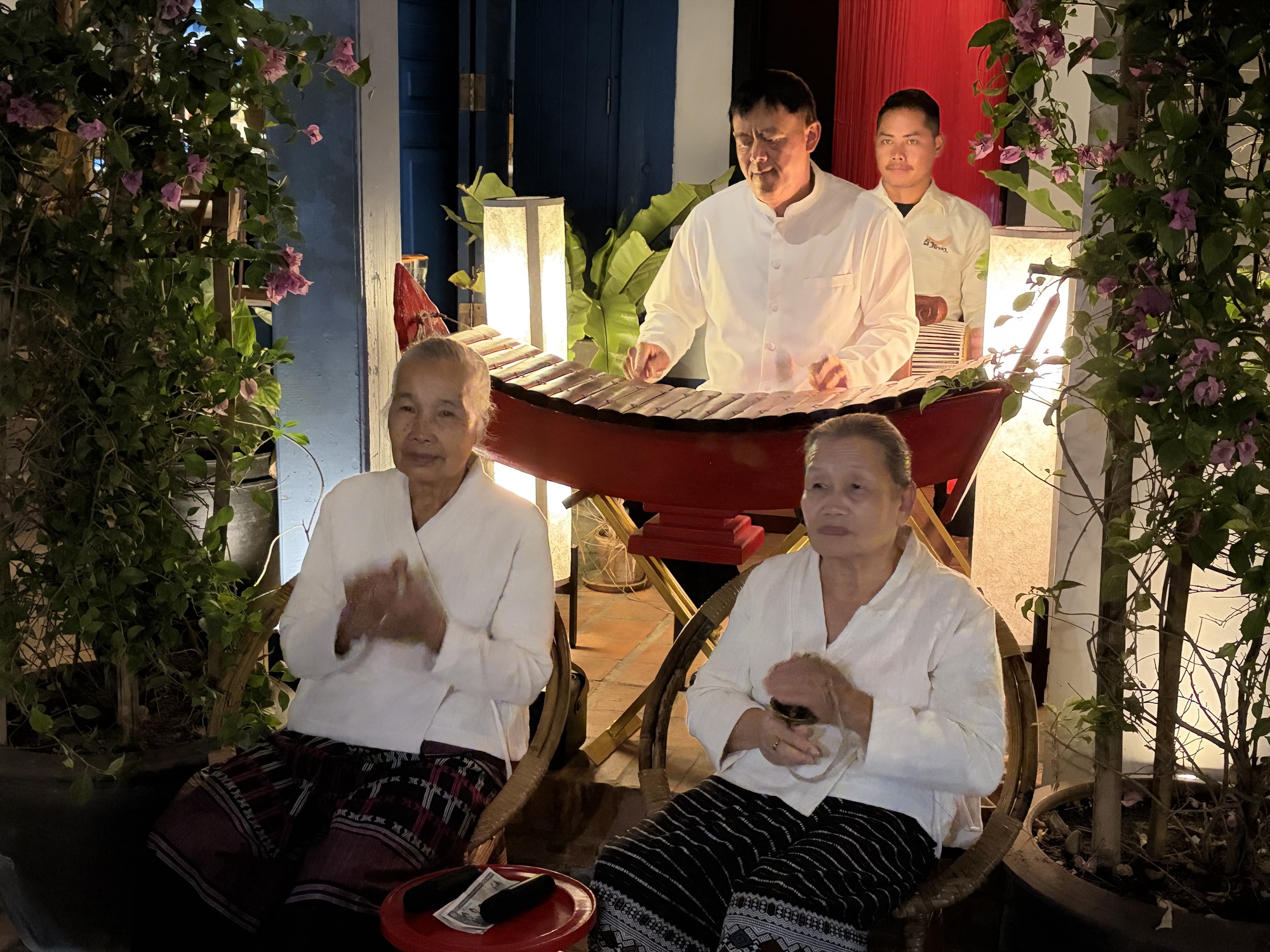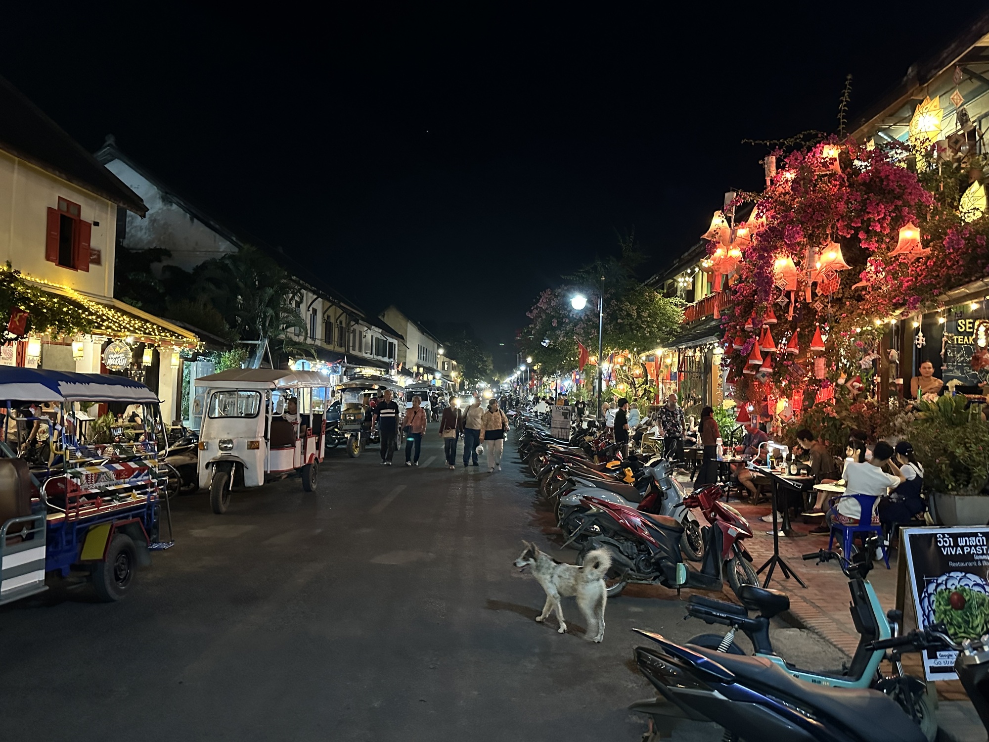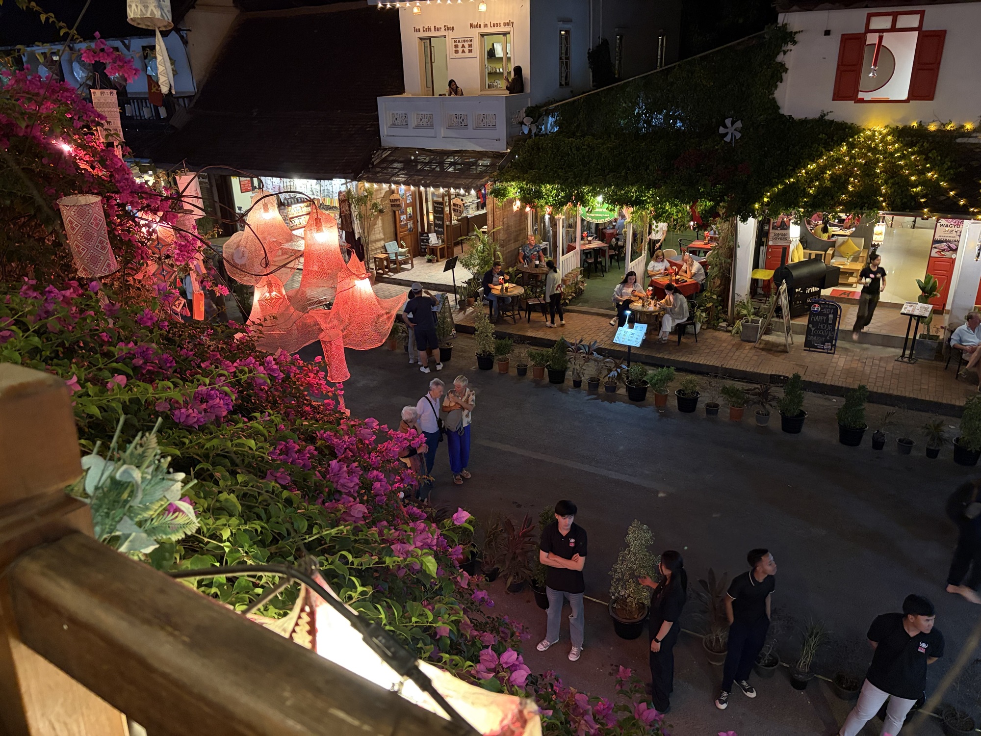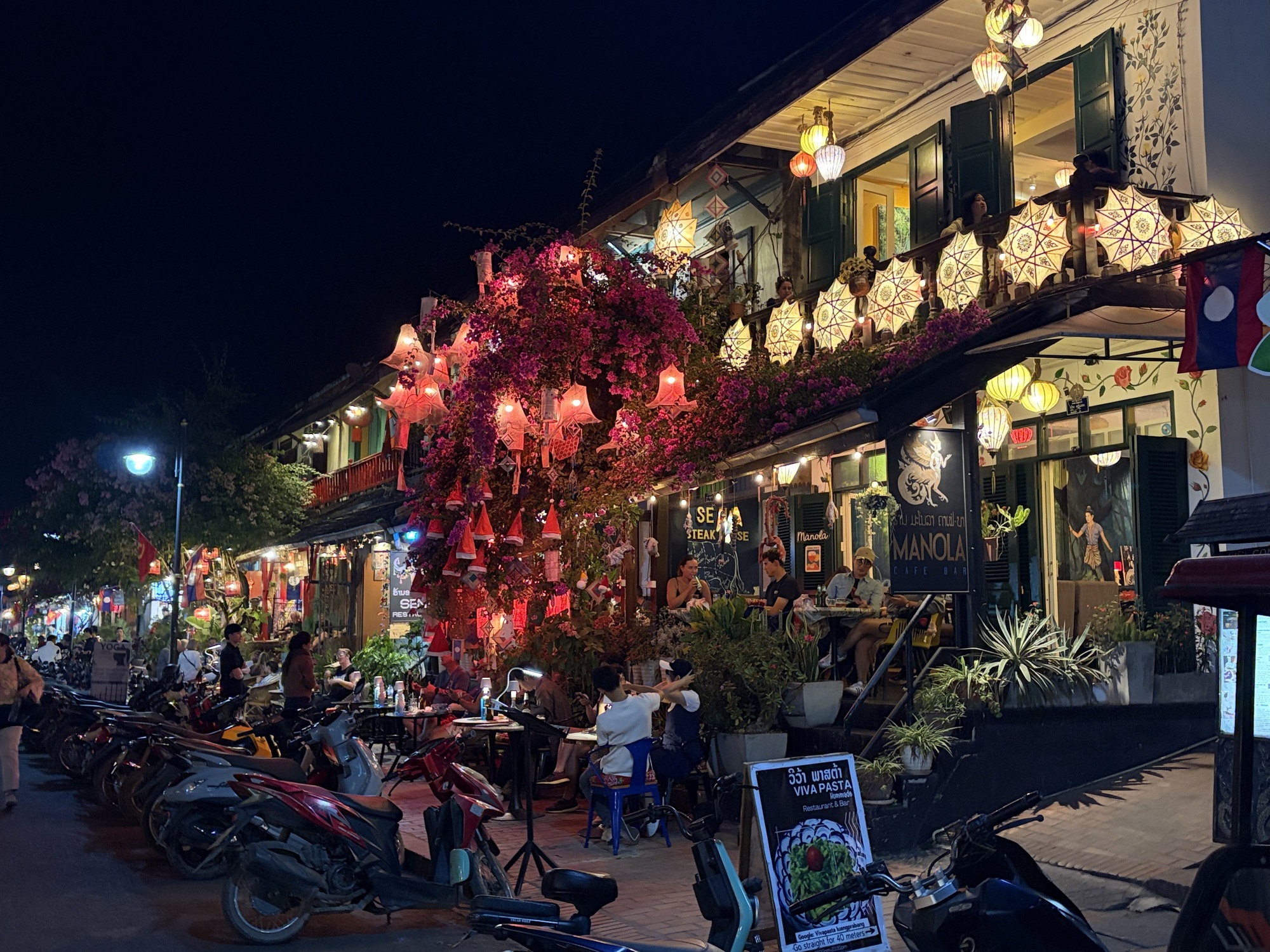 So, now, time to celebrate our last evening in Luang Prabang. We want to spend out our Lao kip because it’s worthless outside of the country, but do we have enough for two more hotel nights and some unknown transport costs and meals? We do. But not enough for a night on the town in Luang Prabang so we changed $20 and went to dinner in the most beautiful restaurant on the main street. There is upstairs balcony seating so we went early and grabbed one of those tables.