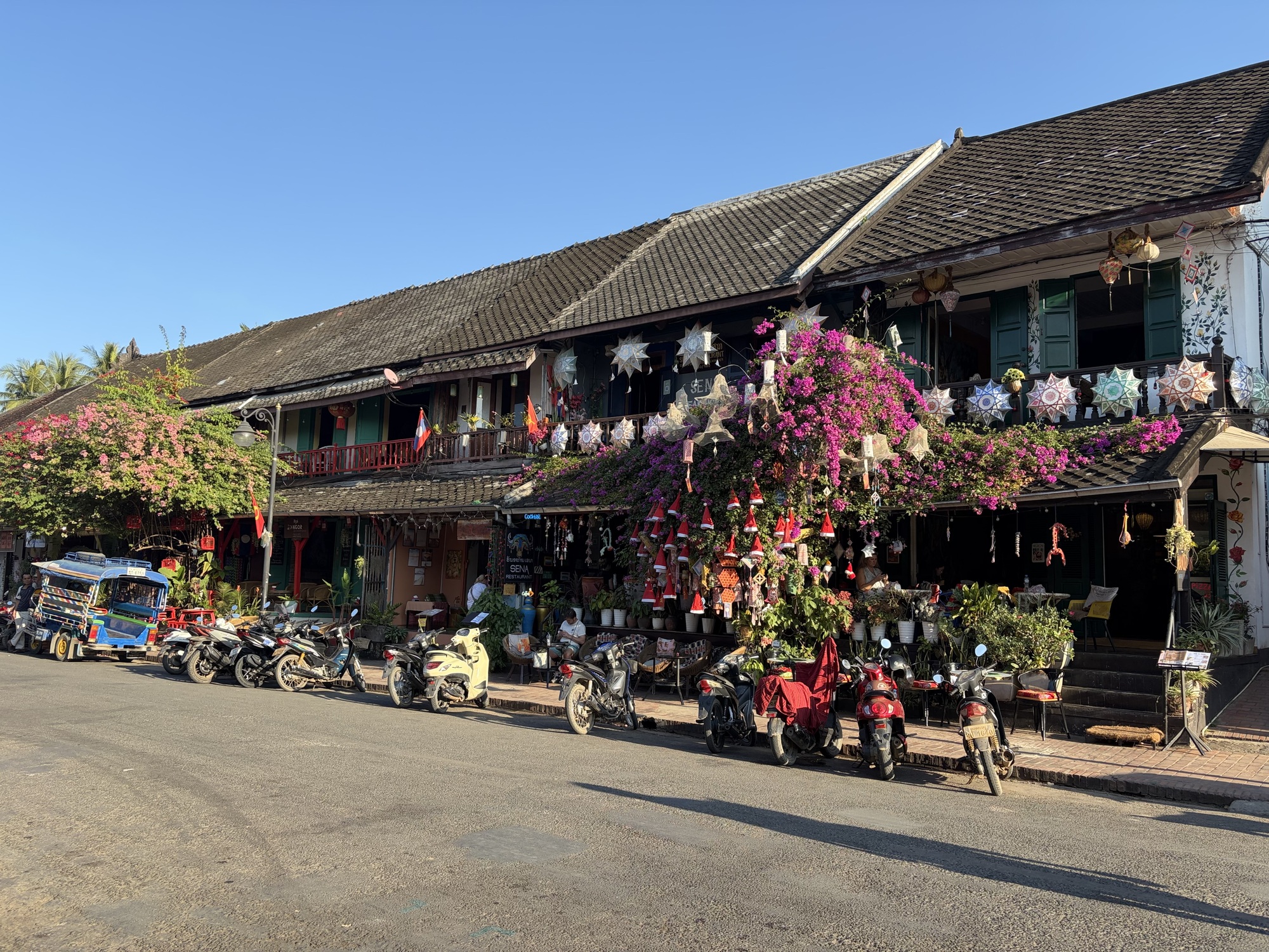 Our room at the Ouis Villa Namkhan was cozy, comfortable, and very quiet. Until 5:30 am, anyway. Suddenly the sound of engines humming by woke me out of my deep and happy sleep. What in the what for? I peeked out through the curtains where there was a small lane directly below, and also a view of the river road in front of the guesthouse.