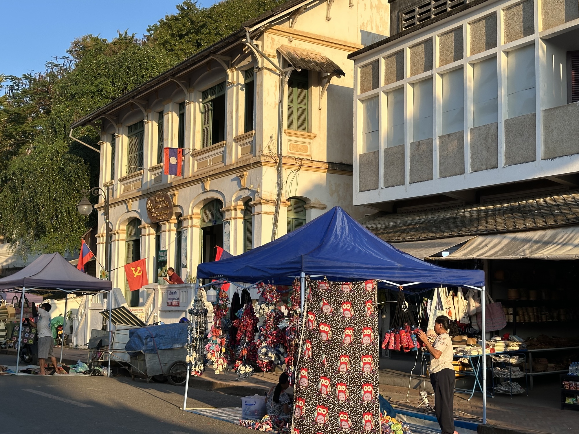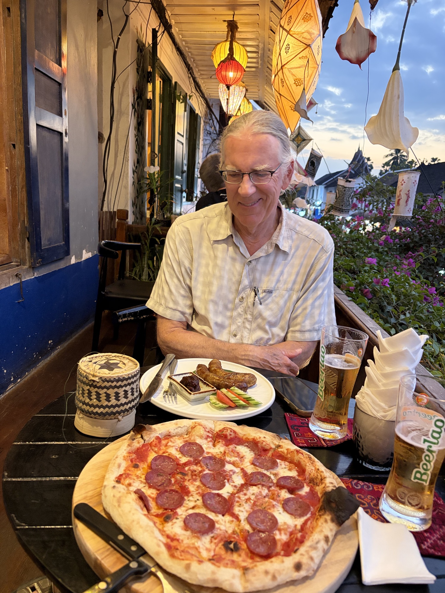 This is probably the most photographed restaurant in Luang Prabang, so we are in lots of people’s photos, eating my pizza and Bruce’s Lao sausage, drinking small draft Beerlaos, lingering over our food. We have a very strict rule about no pizza in Asia, by the way, because we’ve had some traumatizingly bad rice flour no cheese or tomato pizzas here. But I read the reviews and discovered that the owner is Italian so damn the torpedoes. My pizza was awesome. We spent precisely $20.
