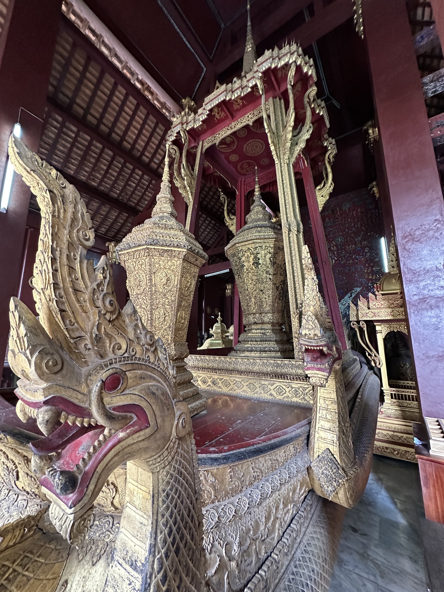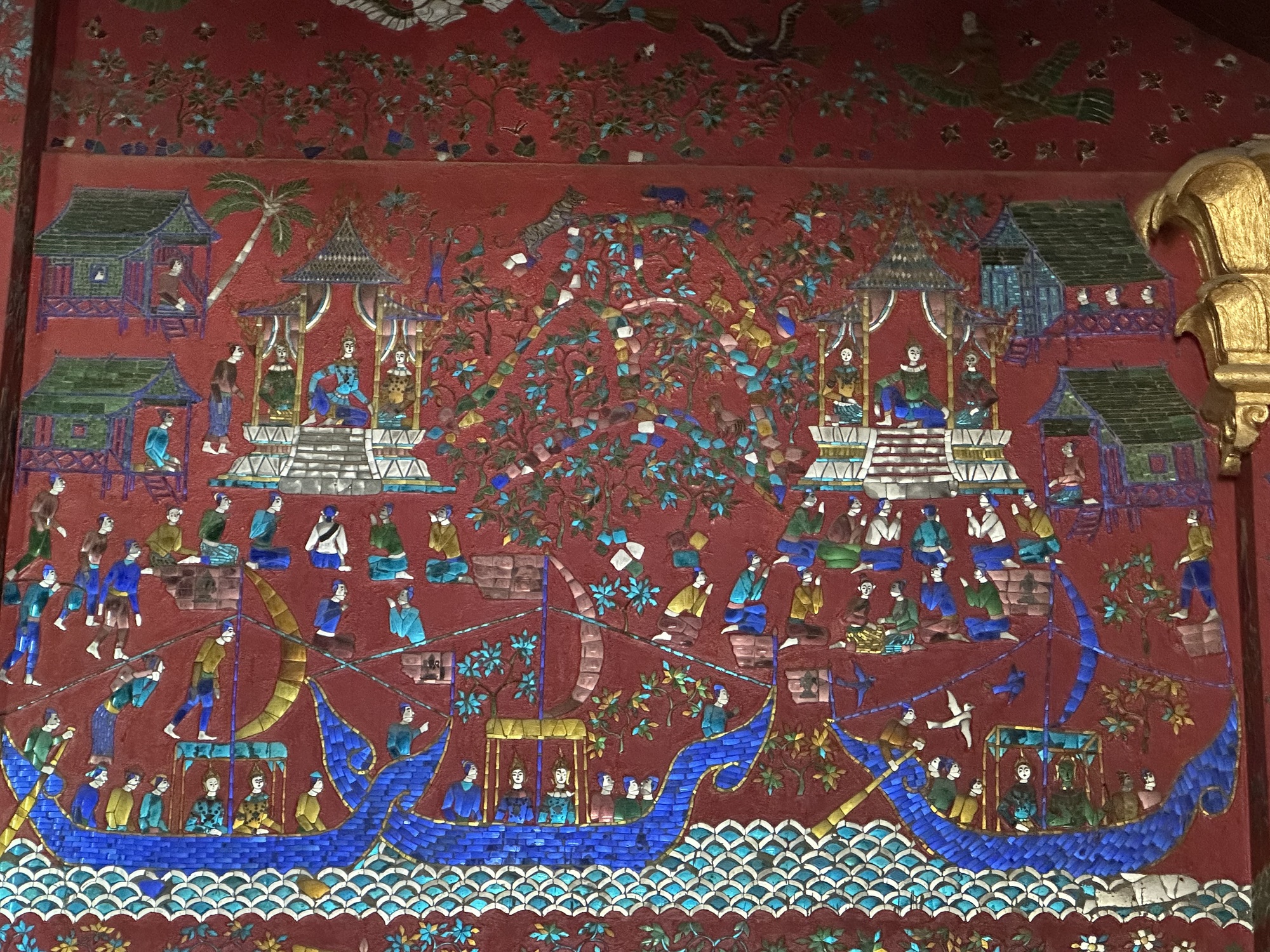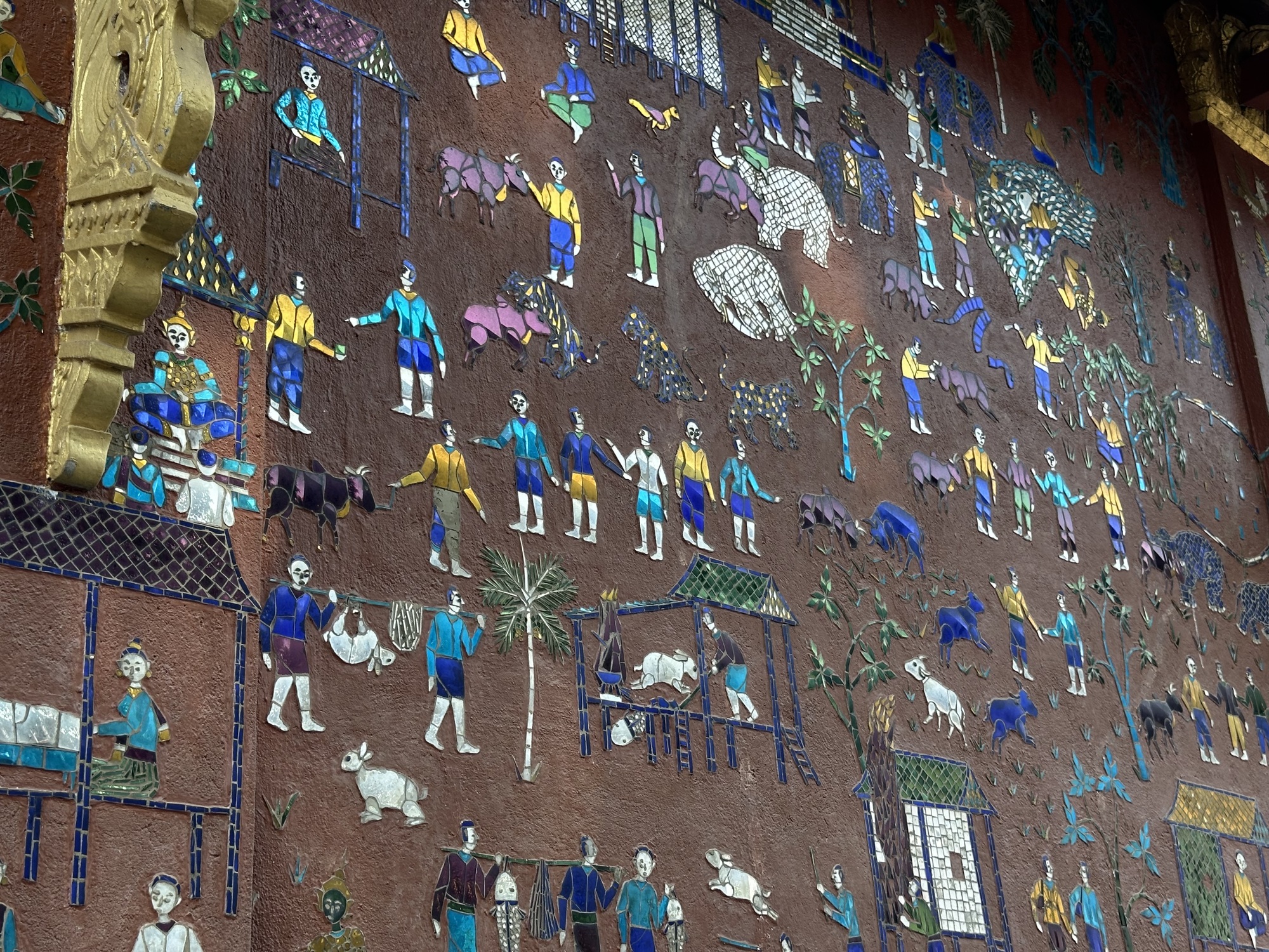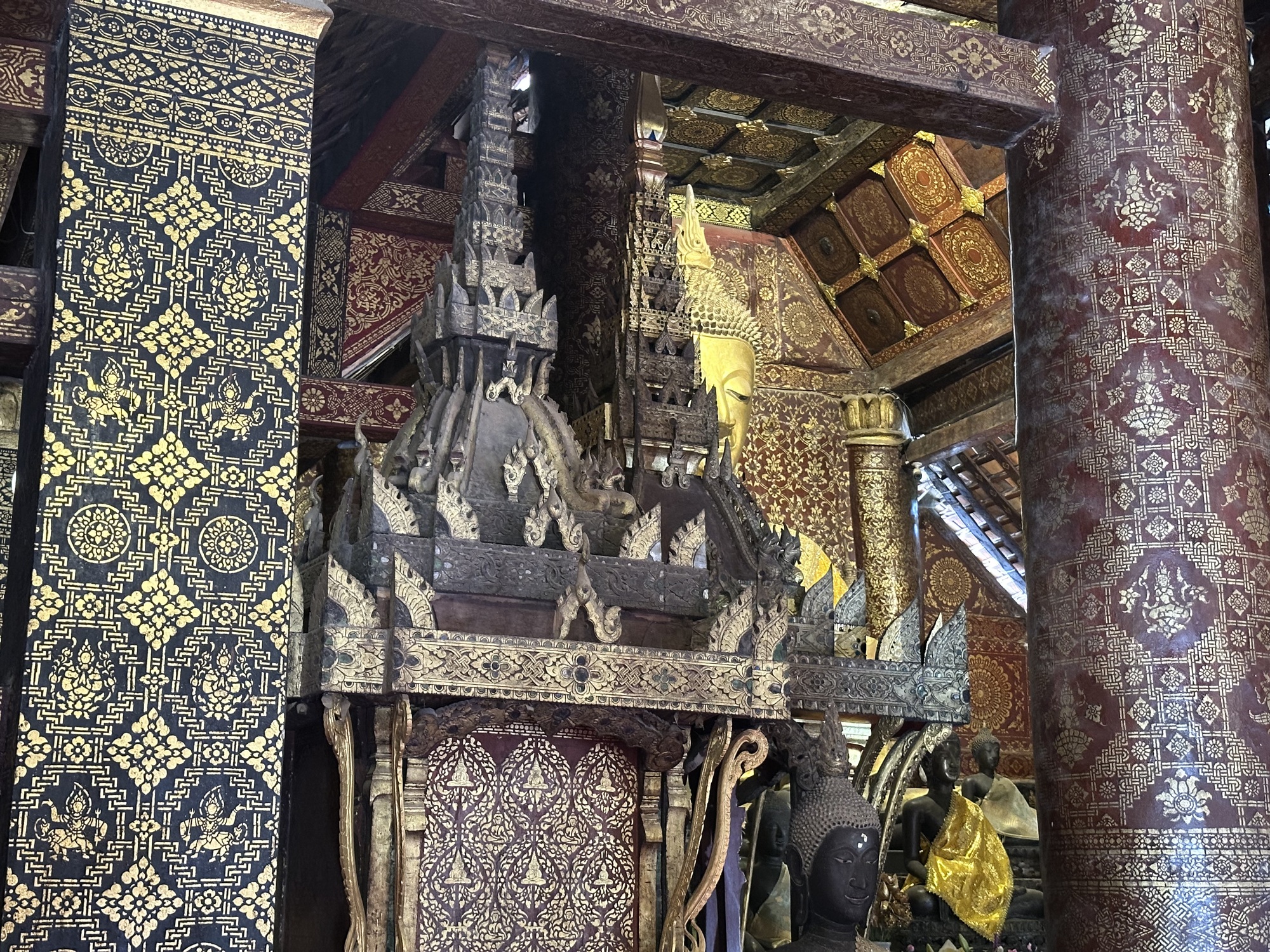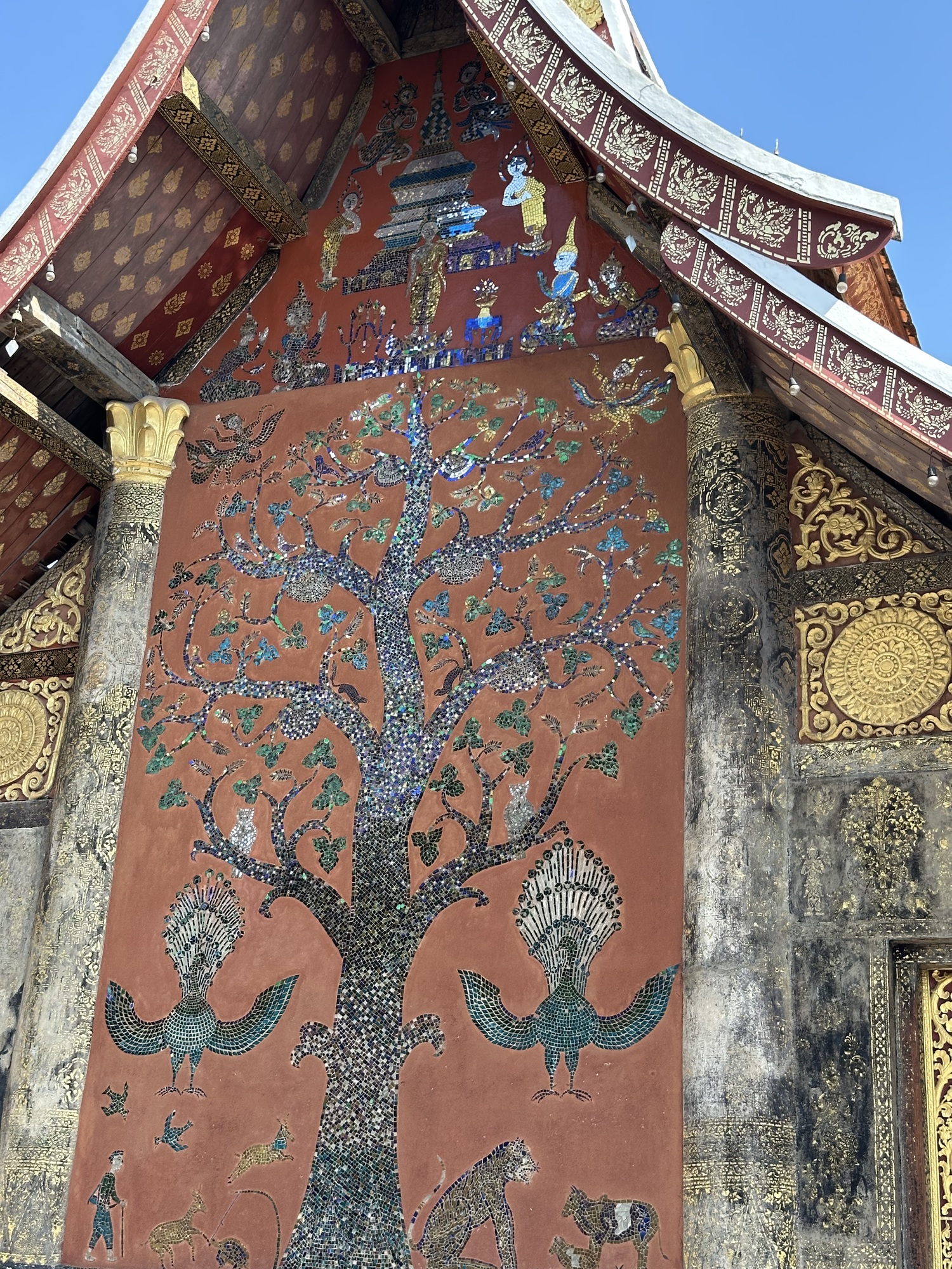 Wat Xiang Thong has many small buildings surrounding the main temple and are in remarkably good condition. Most have inlaid mirrors on the walls, inside and out, depicting life in Laos. One building is the royal funerary carriage house with a huge royal carriage to transport the container with the body of a deceased royal inside. So, the temple has a strong element of royalty. The former royal palace is just down the street from the temple.