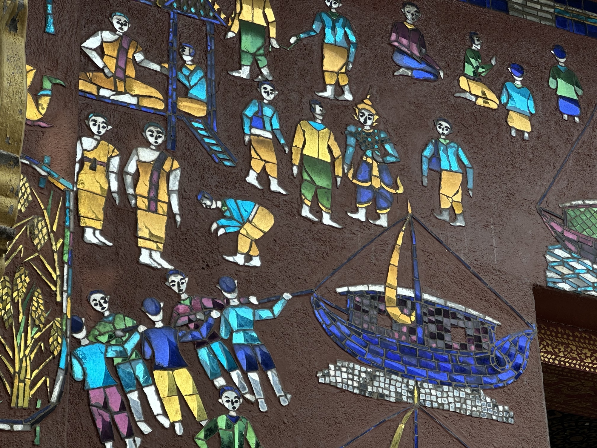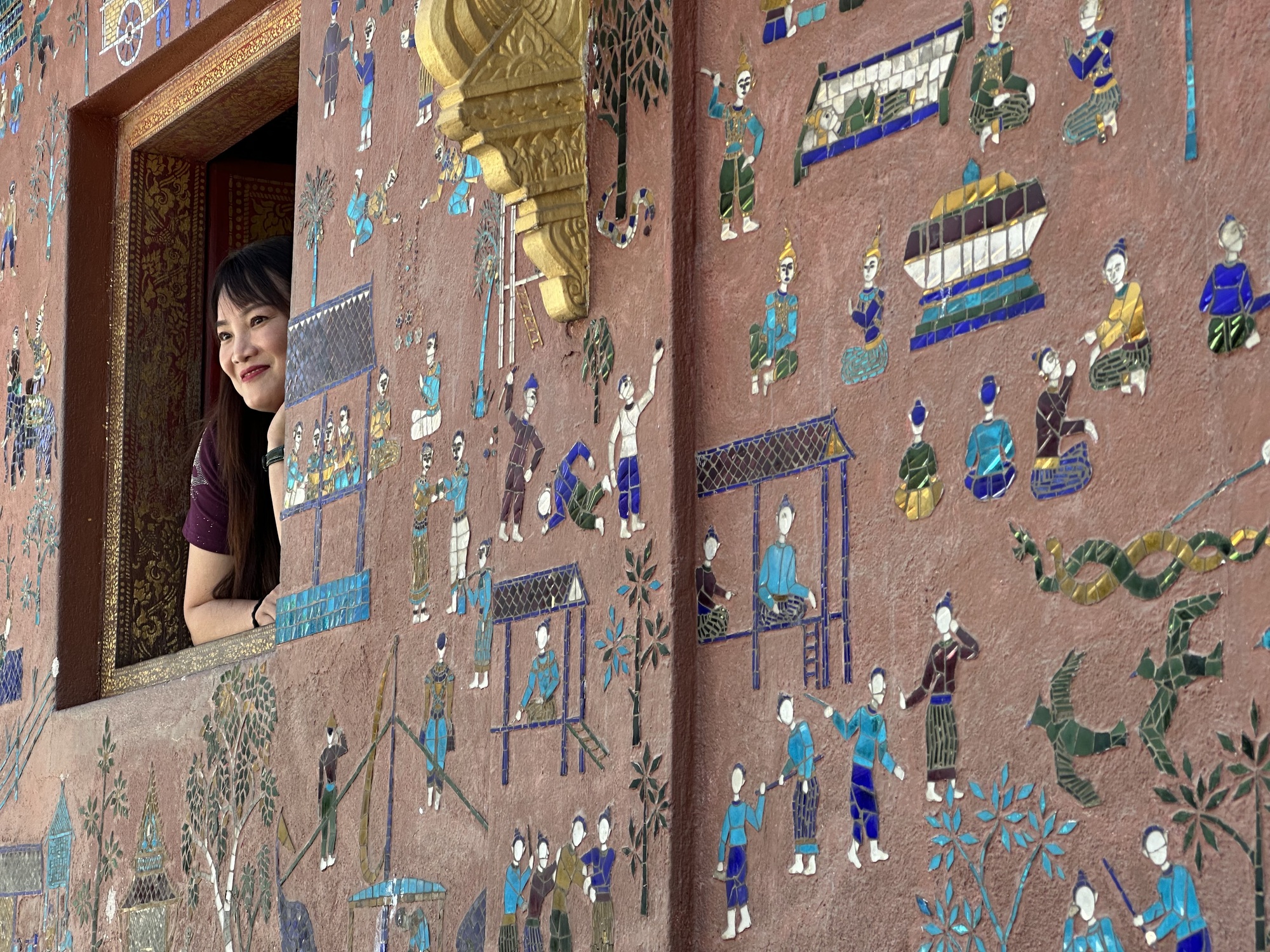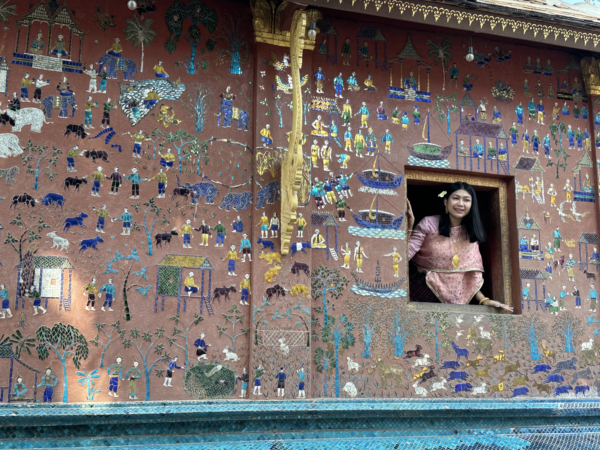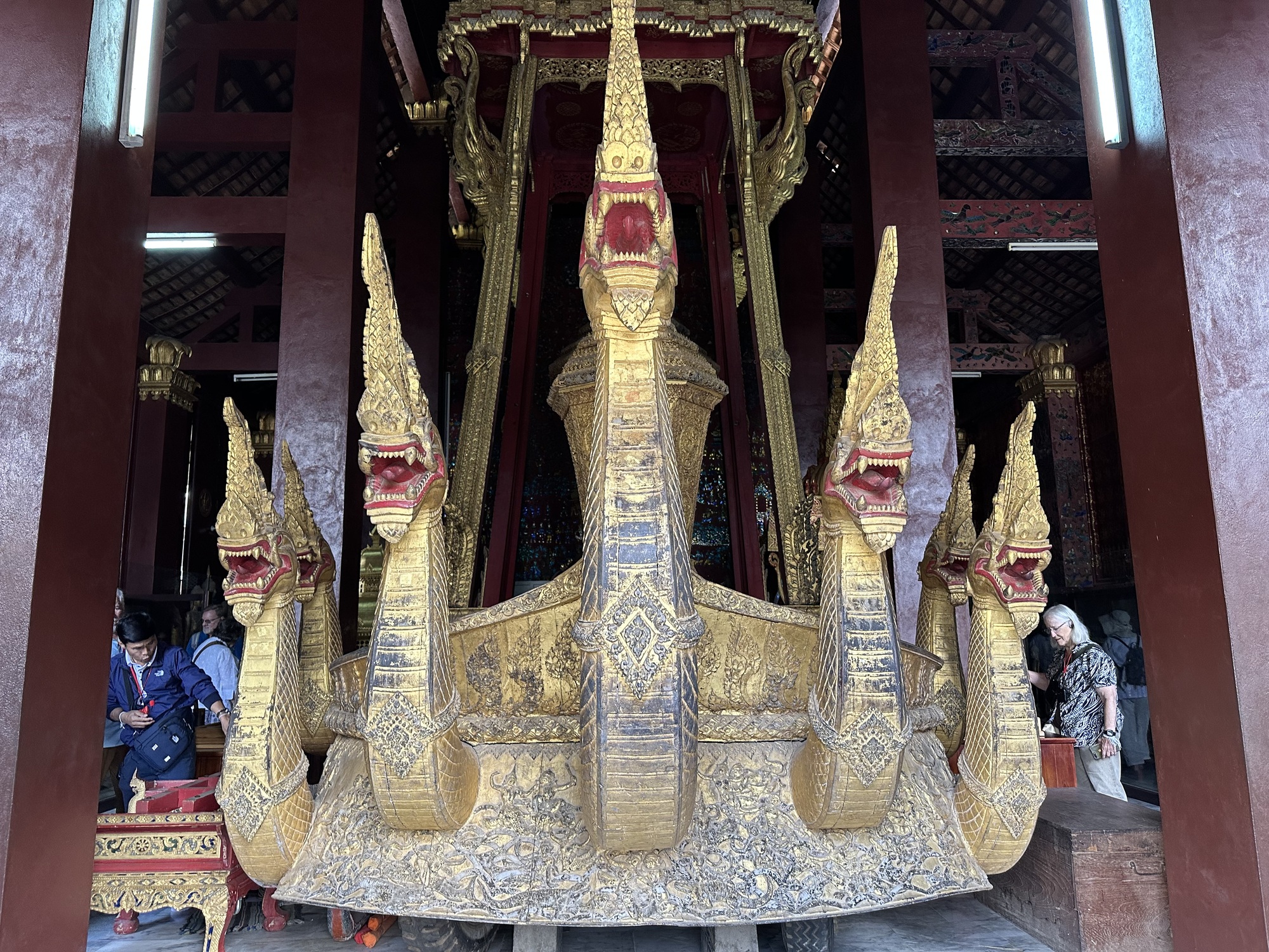 Wat Xiang Thong has many small buildings surrounding the main temple and are in remarkably good condition. Most have inlaid mirrors on the walls, inside and out, depicting life in Laos. One building is the royal funerary carriage house with a huge royal carriage to transport the container with the body of a deceased royal inside. So, the temple has a strong element of royalty. The former royal palace is just down the street from the temple.