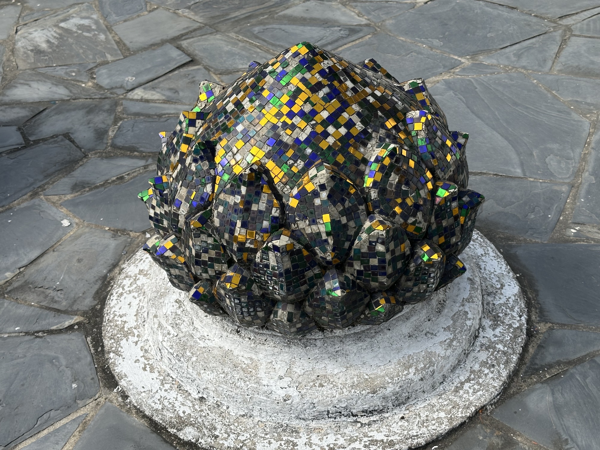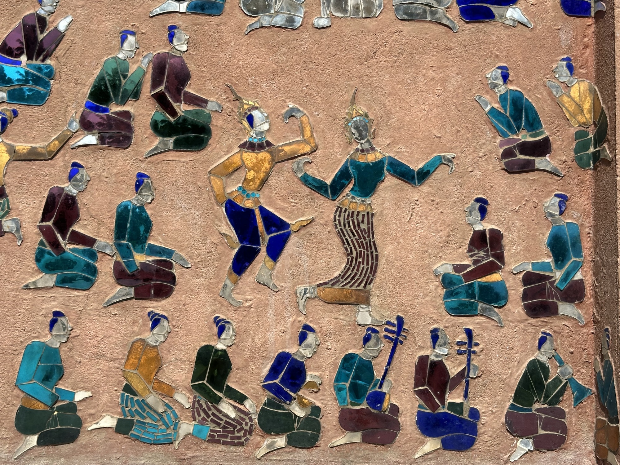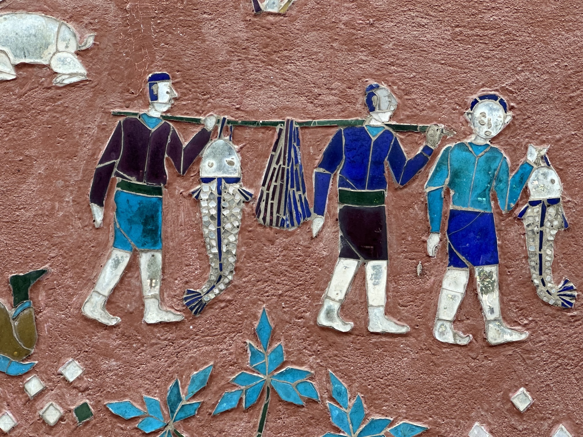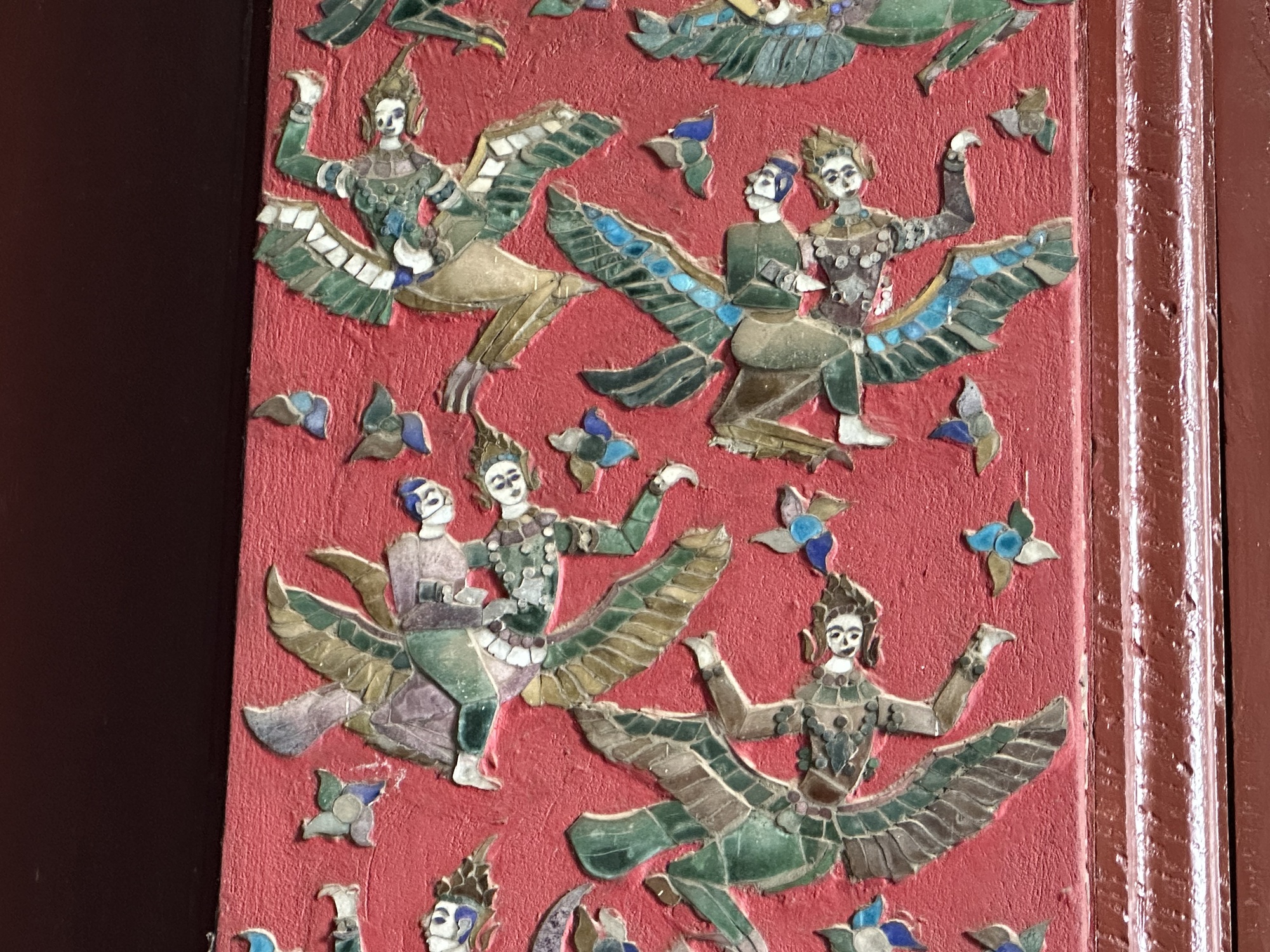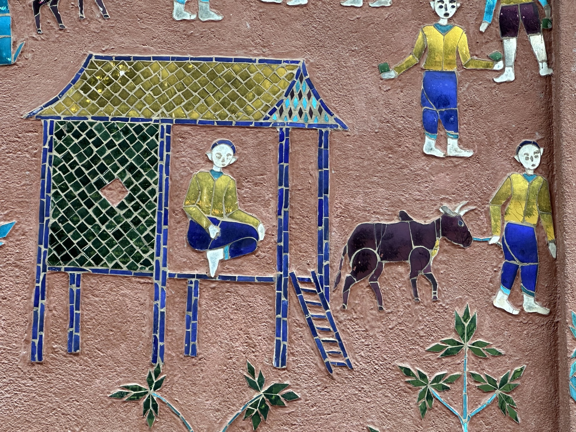 Wat Xiang Thong has many small buildings surrounding the main temple and are in remarkably good condition. Most have inlaid mirrors on the walls, inside and out, depicting life in Laos. One building is the royal funerary carriage house with a huge royal carriage to transport the container with the body of a deceased royal inside. So, the temple has a strong element of royalty. The former royal palace is just down the street from the temple.