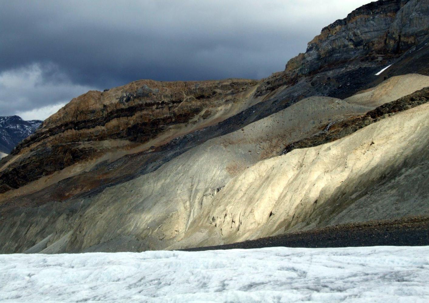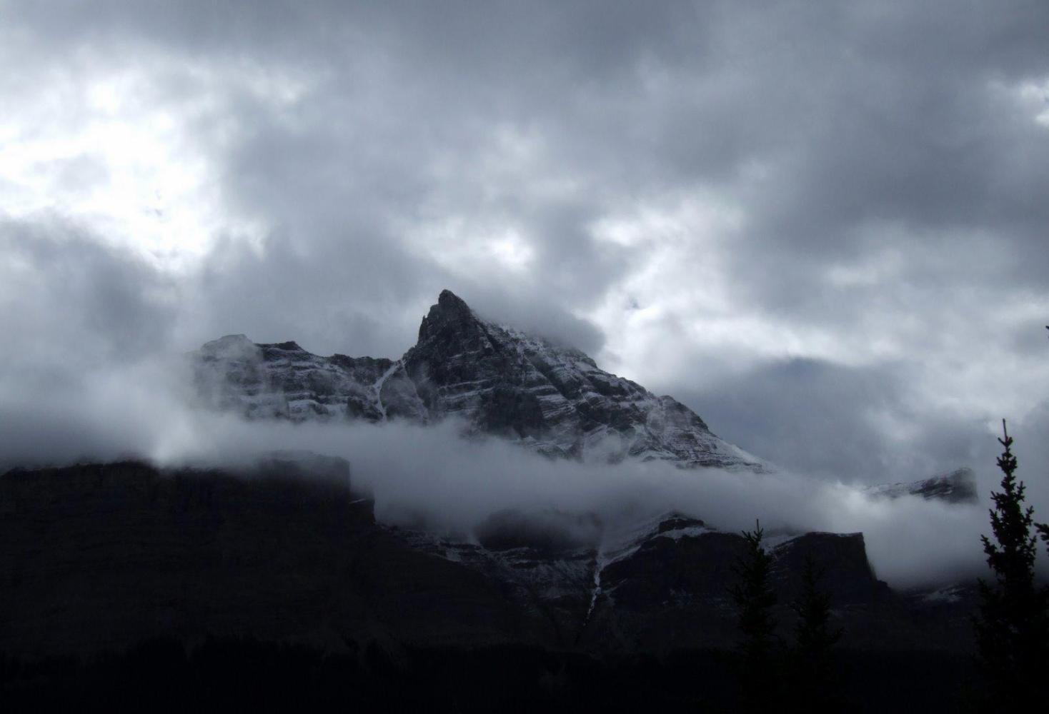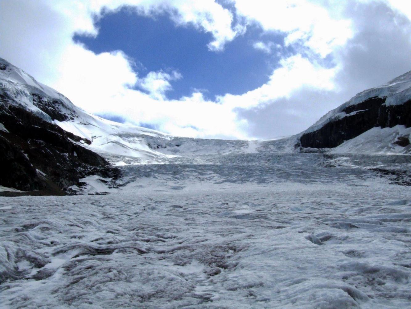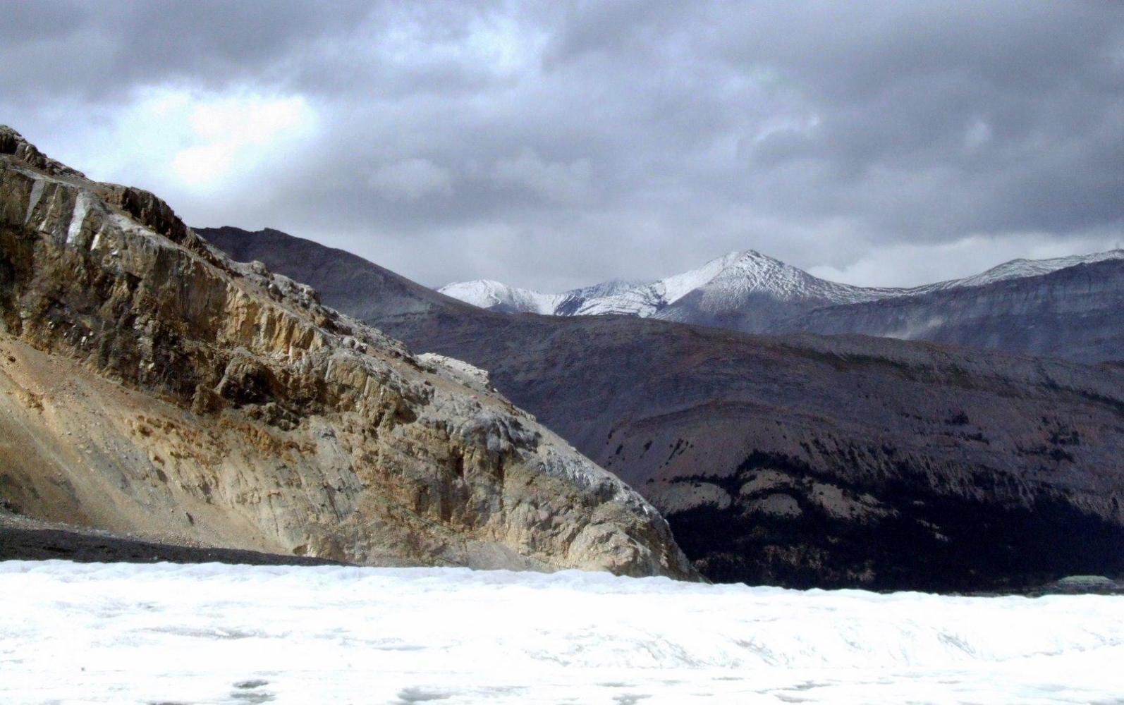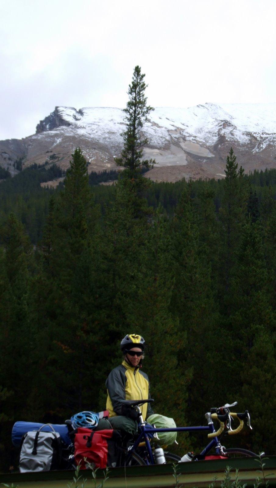 There was one big climb today and, unconventionally, the cloud lifted as we rose. Sunwapta pass rises to more than 2,000 metres, plenty high enough to feel the thinness of oxygen in the air. We gulped as we pedalled and the muscles around our chests began to protest. It is hard at that altitude and it is harder still when it's cold.