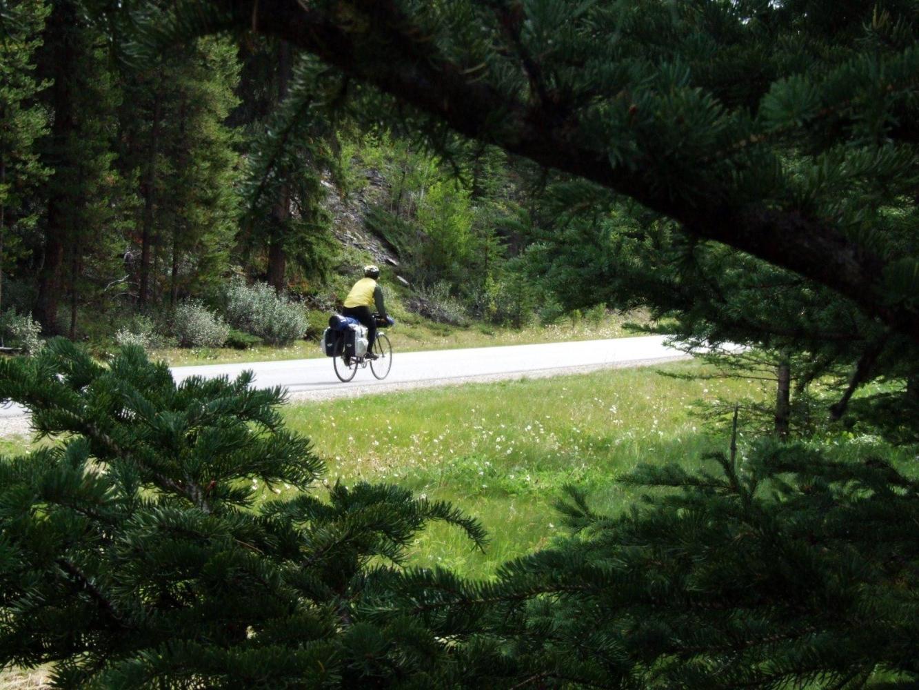 As soon as I saw our French-speaking arrival I knew that was whom they had been talking about. There were bags everywhere and at all angles. Nice chap, though. It's important not to judge folk by their appearance. He had met that French family heading for South America, for instance. He came across them on Bow's pass, in the afternoon when there was more traffic. A six-year-old can ride only so fast, as can a man pulling a four-year-old in a trailer, and they were being buzzed by unthoughtful drivers. The Québecois had placed himself at their tail, further out in the road, to act as a human shield.