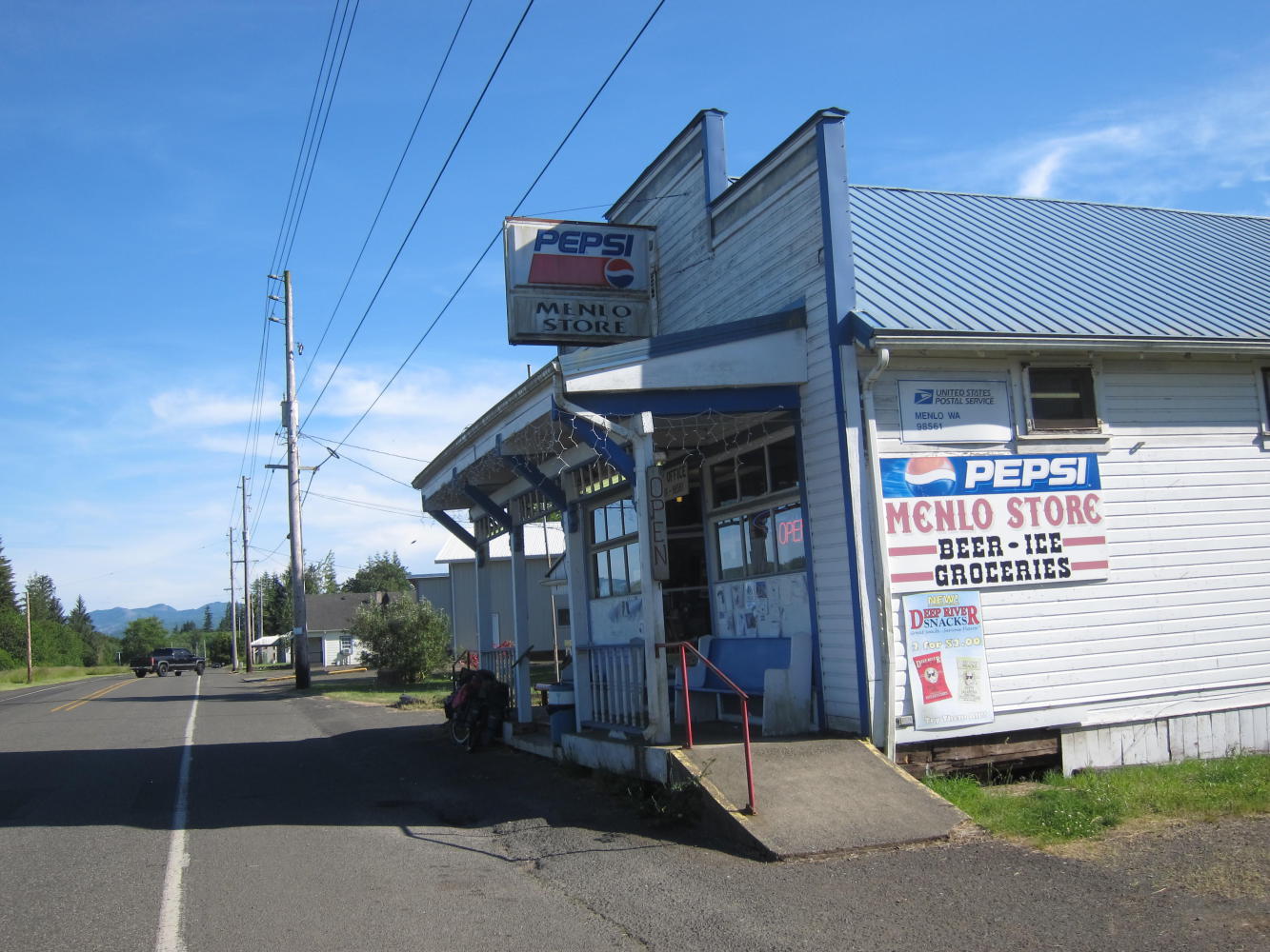 5:00 p.m. After a chocolate milkshake at the Dairy Queen it may have dropped to 98F, wow! I planned to get in about 36 miles before dark. The 7 miles to Menlo were fairly busy and exposed. In fact, I chose the Wallapa Valley because there were wide grassland meadows to make it warmer. Great planning! Stopped for a lemonade at the Menlo General Store.