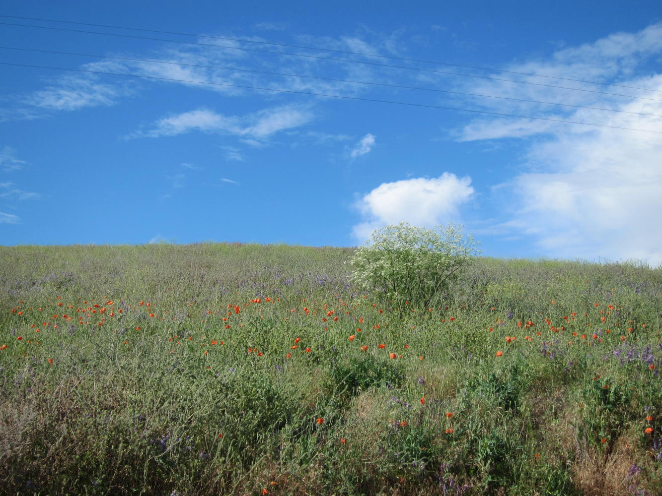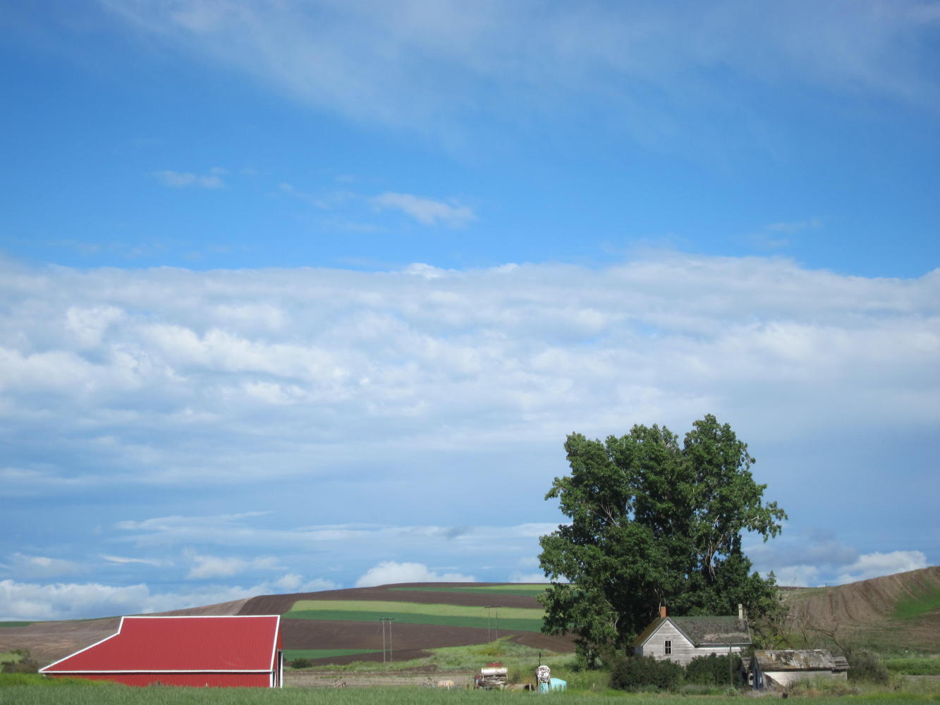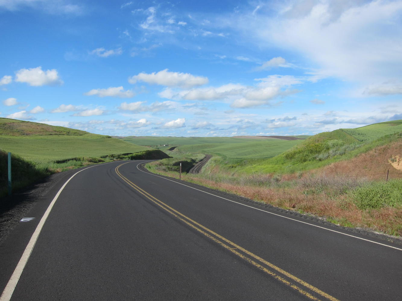 One of my goals for this trip was to ride through the Palouse in the late spring - and it was everything I had hoped for. The road to St. John was almost entirely empty - maybe 12 cars in 30 miles. Gorgeous hills and valleys. Wildflowers. (Actually vetch is a weed, but it filled the roadside with purple splashes.) And by the time I was halfway there, the sun came out.