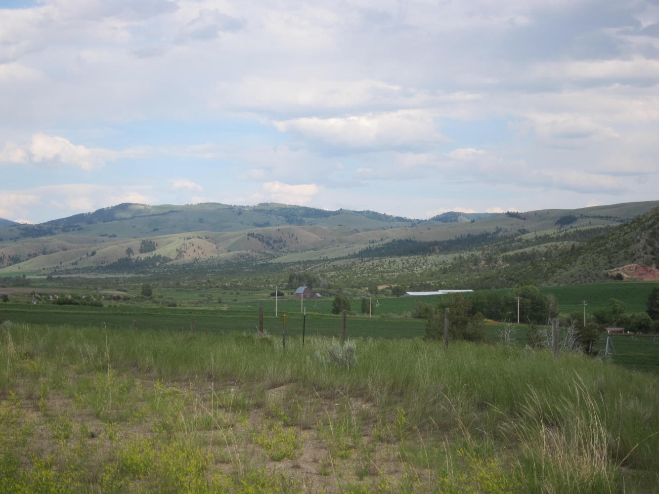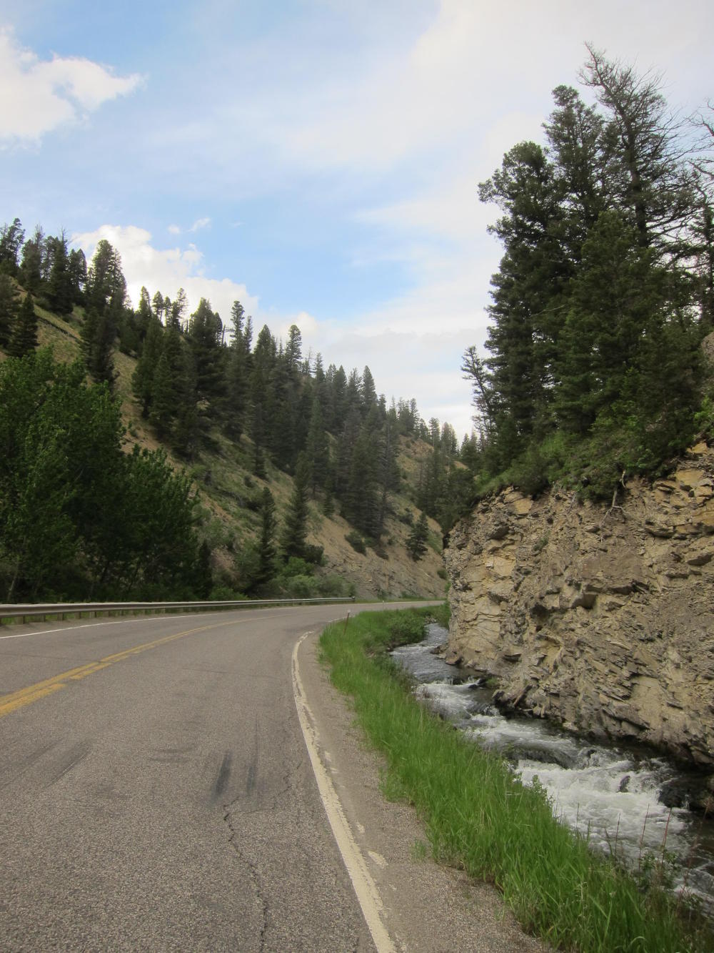 Finally it seemed to die down a bit. With the clouds, the temperature had dropped. Plus the wind seemed somewhat in my favor. The climb out of town is steep, but after that it dropped into the Deep Creek Valley with its small ranches. Then the valley narrowed into a canyon - with the narrow highway right next to the creek for miles. Almost no traffic, cloudy and cool, and a tailwind all the way up the mountain.