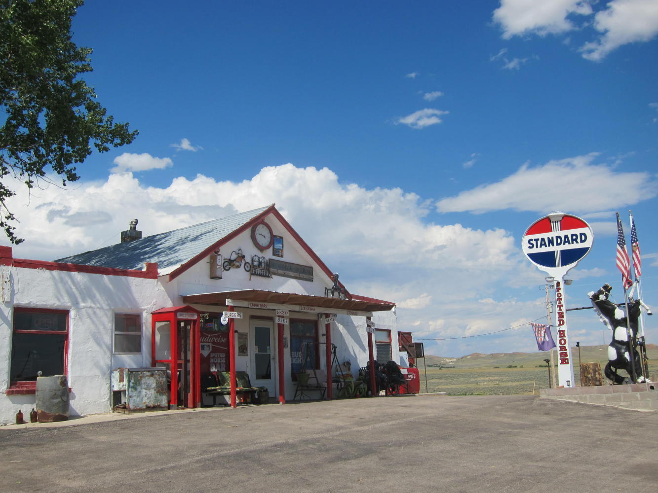 Mercy! I got to Spotted Horse in the nick of time. I was bushed. Wasted. I walked in like a drunk man. Pretty pathetic when you stagger INTO a bar. Spotted Horse - population 2 - is a funky, old bar, miles from anywhere. There is one precious tree out front for shade. An older couple ruin the place and took good care of me. I had a bottle of water and Coke for starters. Then I lurched over to a table and ordered a cheeseburger and iced tea. I laughed with the waitress/cook/bartender that her food made a lame man walk. I think I spend about two hours there, but we shared stories about growing up - making $2 an hour and thinking we had hit the jackpot.