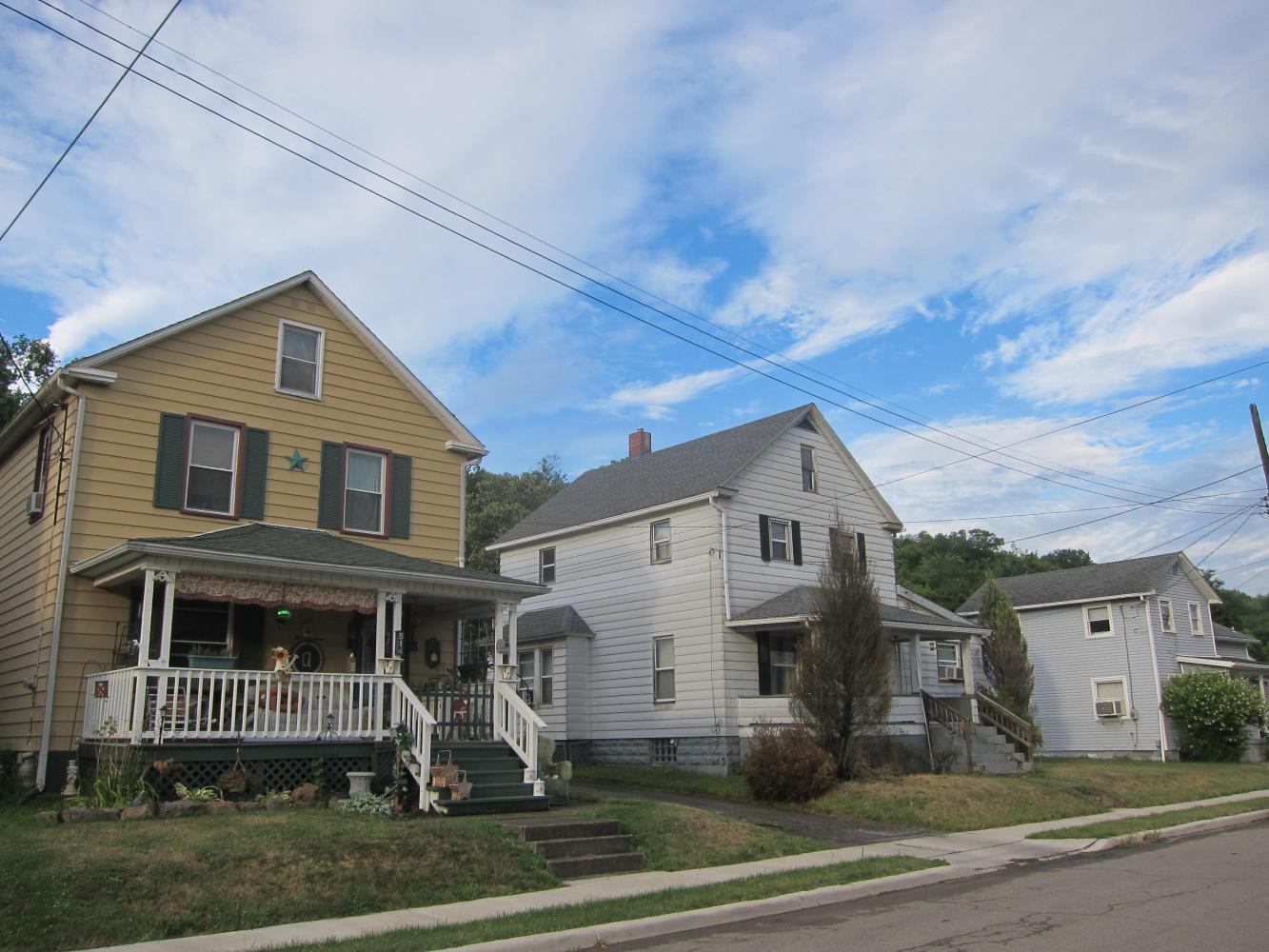 Derelict houses sit next to empty lots with stairs leading nowhere.