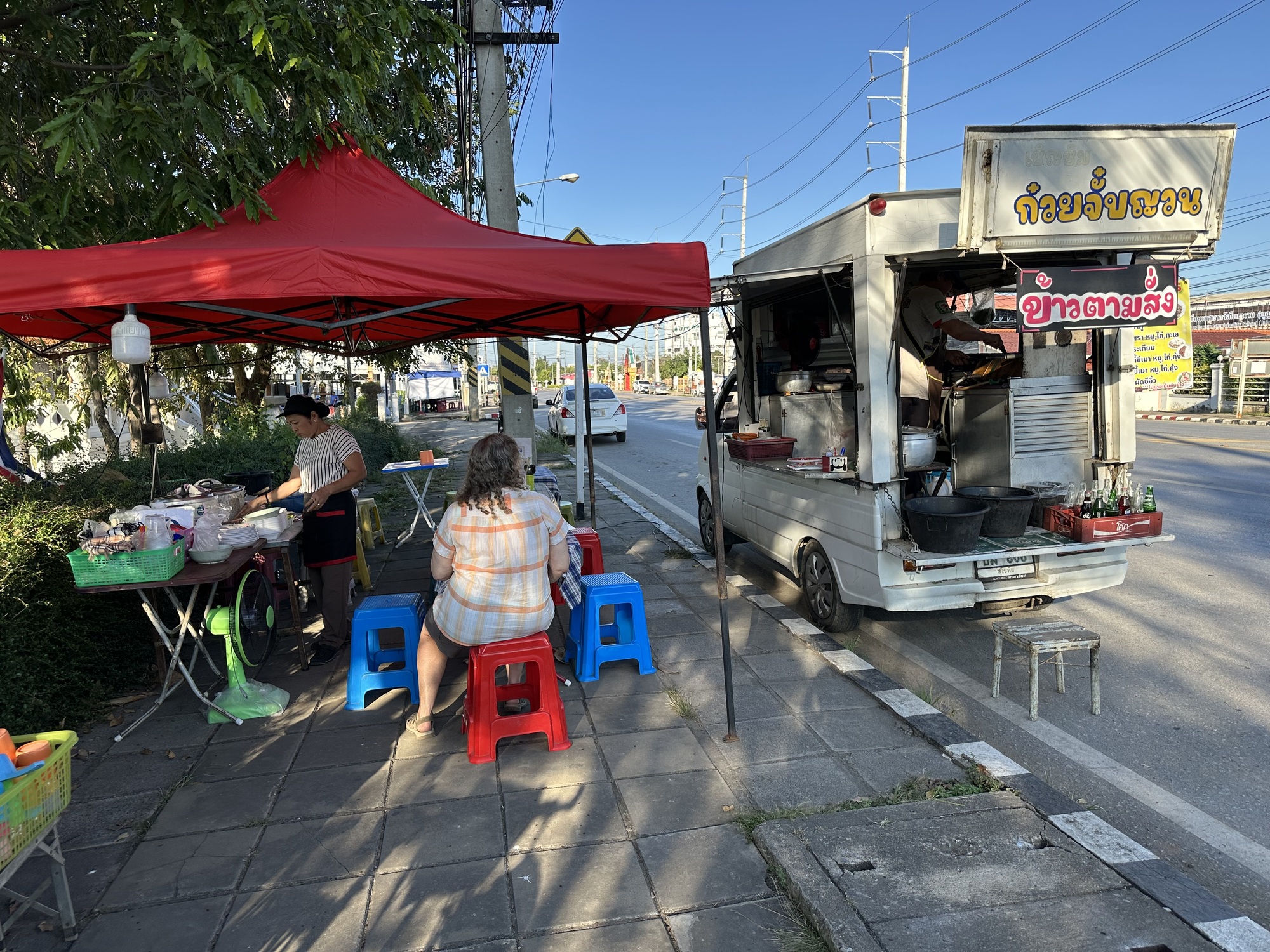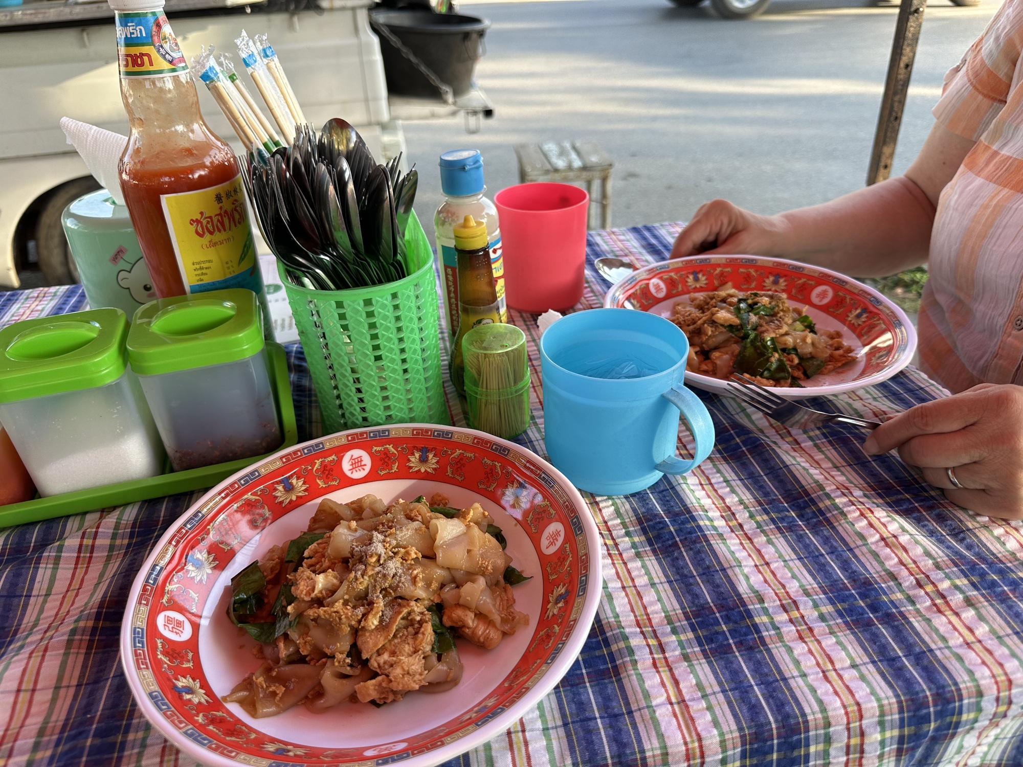 We found a food truck on the way back to our guest house and the guy inside the truck made us each some great pad siew (wide noodles fried with gai lan and chicken) for a dollar apiece.