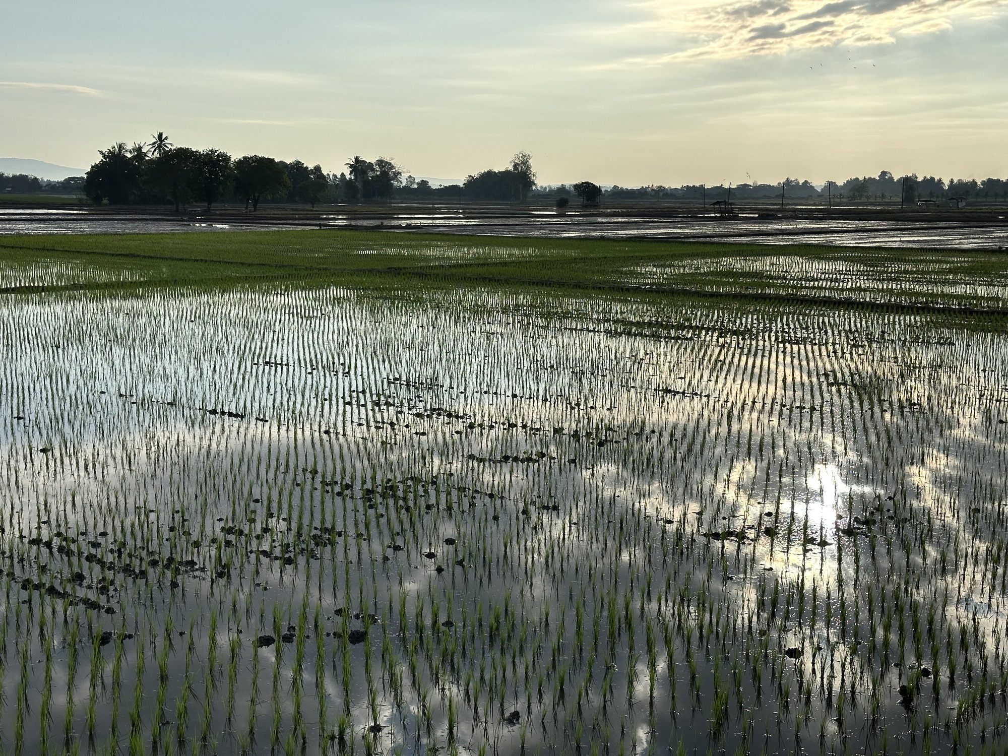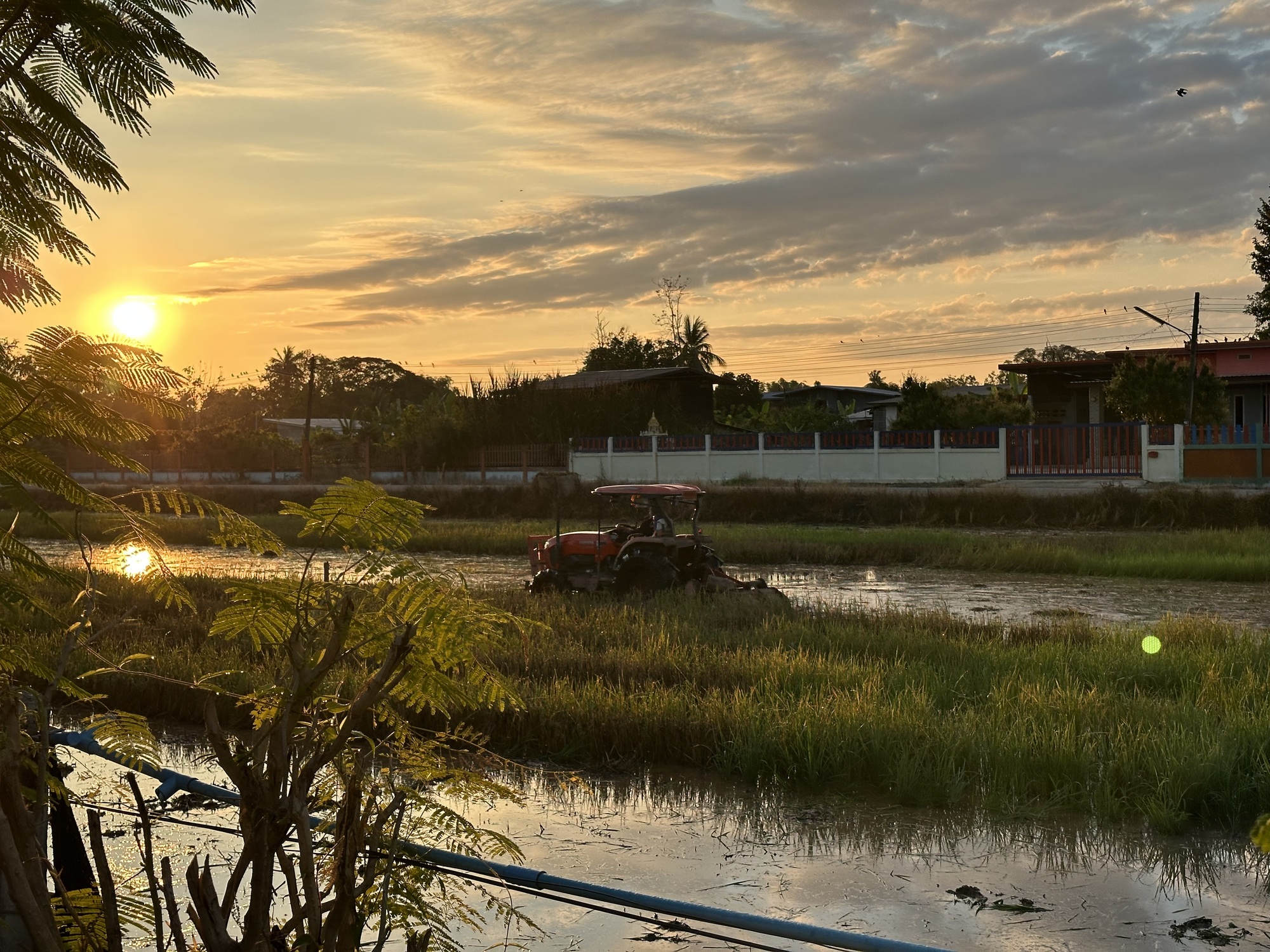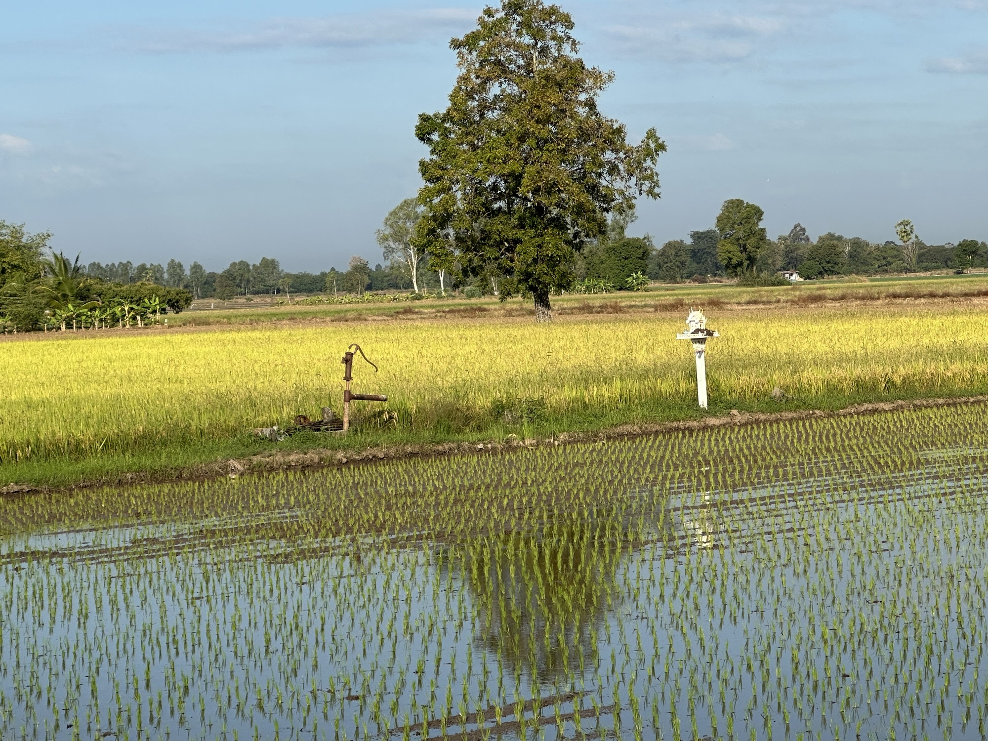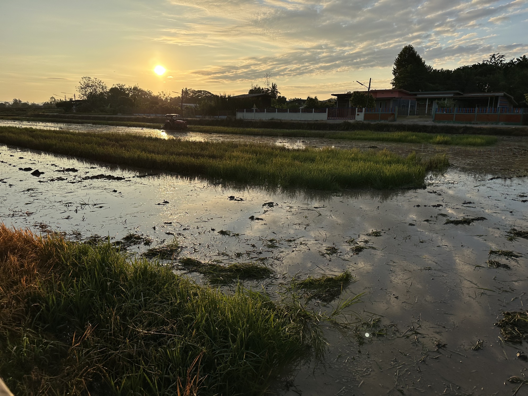 So, that's how the day started at 5AM. The farmer drove his very loud tractor back and forth as the sun rose. We did want to get an early start but not that way. It wasn't a swamp he was plowing but the last crop of rice, the tall stubble. He had flooded the paddy. He had not burned the tall rice stubble and a lot of it was still green so it did resemble a swamp and the frogs sure thought so too. I felt really bad for the frogs. They had been having such a wonderful party last night but then chaos, disaster, carnage. The white egrets will have a feast.