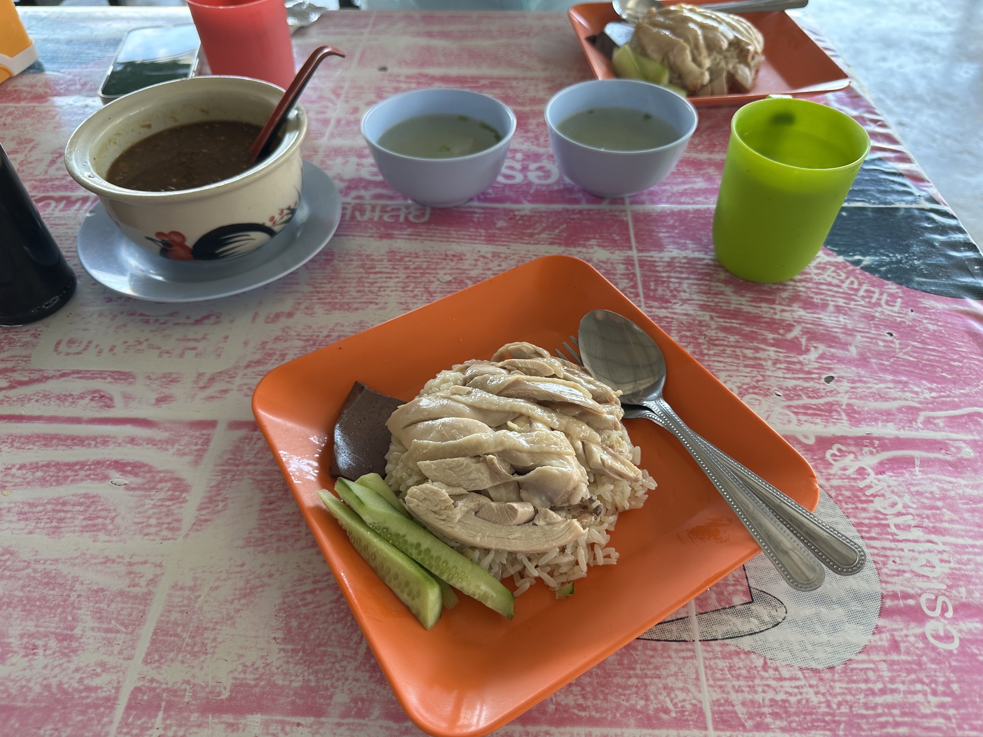 We had loaded bikes and had just arrived which meant we needed to find a guest house to dump our stuff before we could enter the market scene. But I spotted the first papayas I had seen in many days so I had Andrea hold my bike while I dashed across the road and bought not one but two papayas for less than a dollar total. That would be part of tomorrow's breakfast. It's the feeling of quickly catching a fish. You throw it in the bottom of the canoe and paddle on. It's just like that. We rode on but on the way to a possible guest house we came across a nice clean restaurant. It was a khao man gai restaurant meaning that all they sold was that tender, boiled chicken on a pile of rice. Maybe some cukes on the side. But the sauce full of ginger is the deal. You scoop that all over the chicken and rice and it sends you to heaven, (way better than a falling teak leaf might).