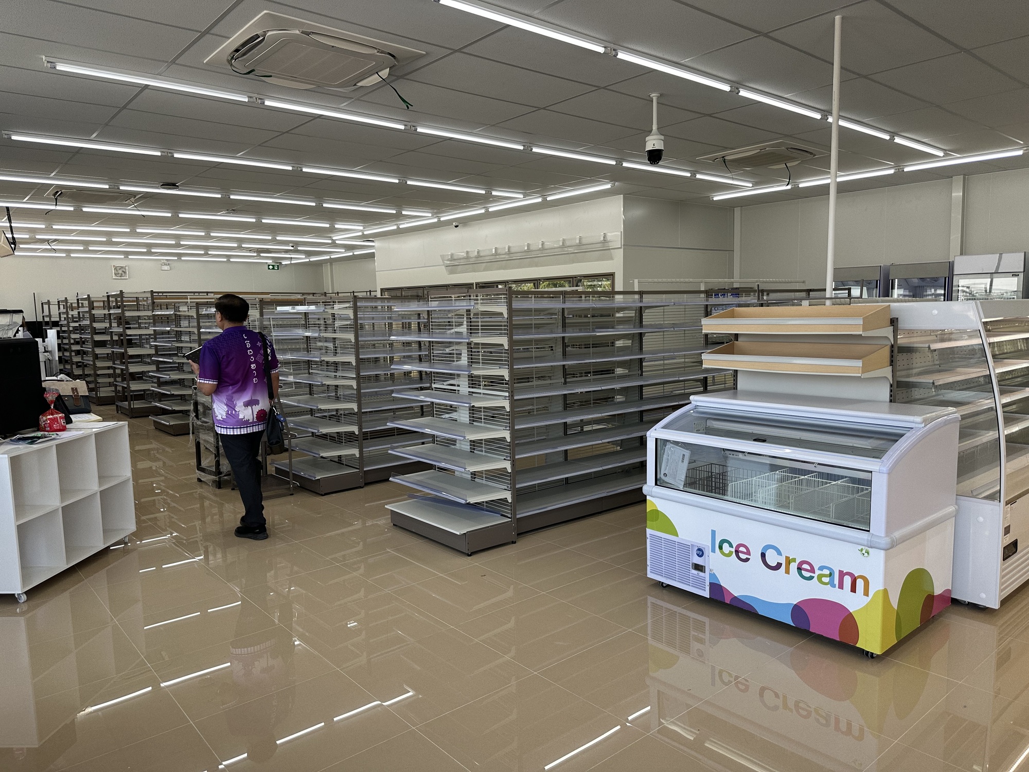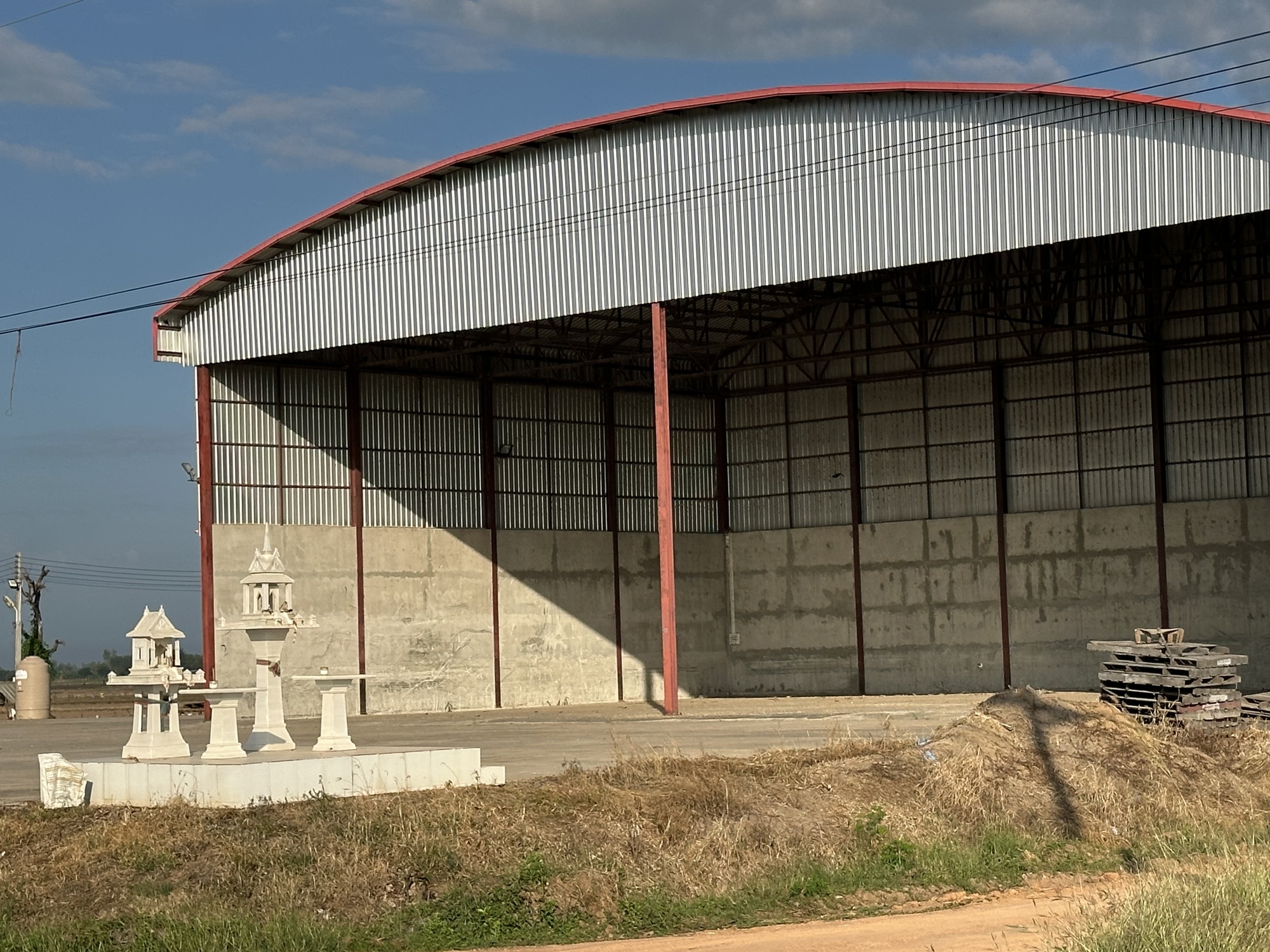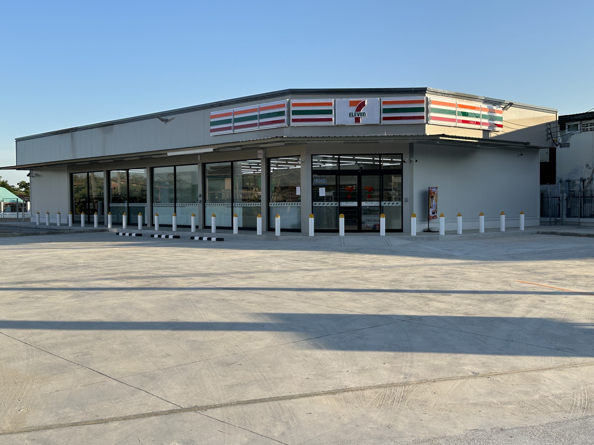 Since we now had two papayas we did need to stop at a 7-Eleven for a small box of soy milk to soak the muesli and papayas with, as in breakfast. There are 7-Elevens everywhere in Thailand and sure enough, on the way to our guest house we found one. It looked very new. They were even still painting lines in the parking lot. We parked our bikes as some workers on break snickered. It was a very uncharacteristic thing for Thais to do because it felt directed at us, the farang. Andrea stayed with the bikes and I went to the door of the store and to my surprise saw that it was VERY NEW. The shelving was in the store, but that was all! No wonder the workers were snickering. They knew a big surprise was about to befall us.