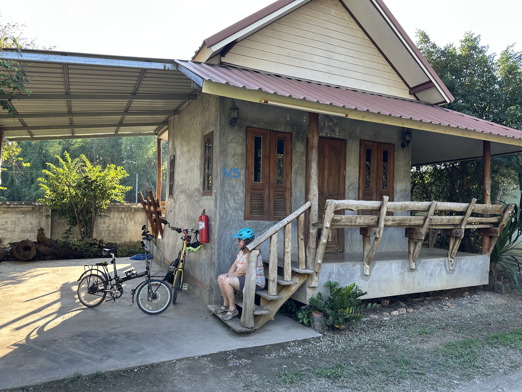 Back on our bikes we went to find a guest house but along the way stopped at a little store that did have soy milk. The bungalow we got was down the line of bungalows, maybe the third one down from the office area. The wifi was not working so we went to tell the two women working there. I'm sure they were sisters but they were not owners but probably the maids. There hadn't seemed to be an owner anywhere when we pulled in and secured a bungalow. The women were very nice but no English whatsoever. They were the type of Thais who just spoke Thai to you as if you could somehow instantly become a polyglot. But they were very nice too. They were concerned. They called the tech people to tell them the internet was not working.