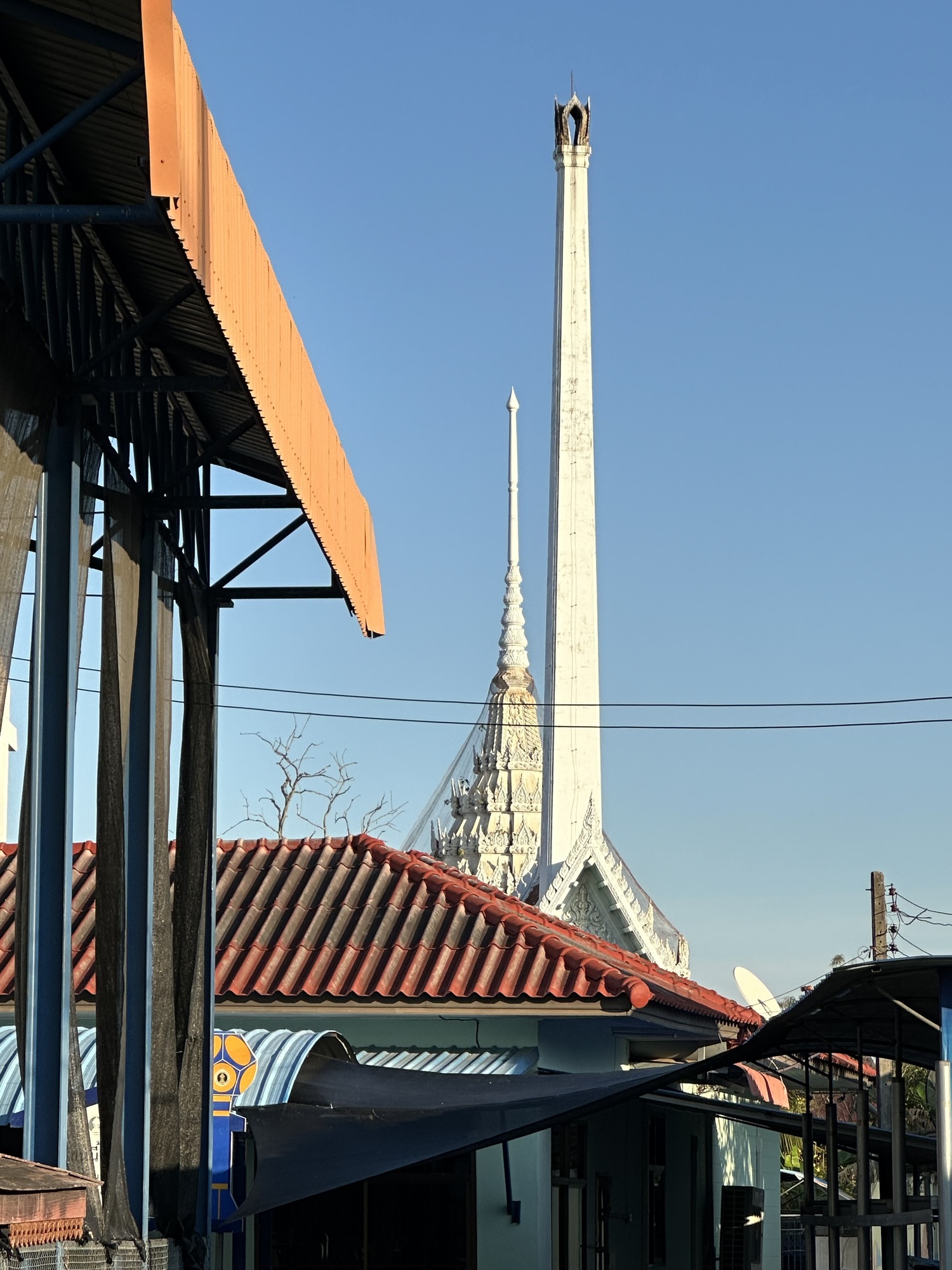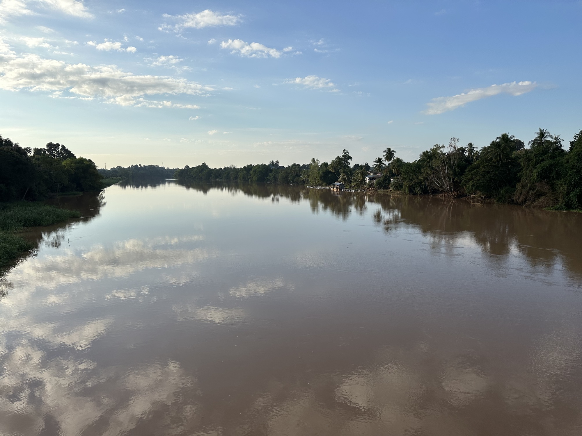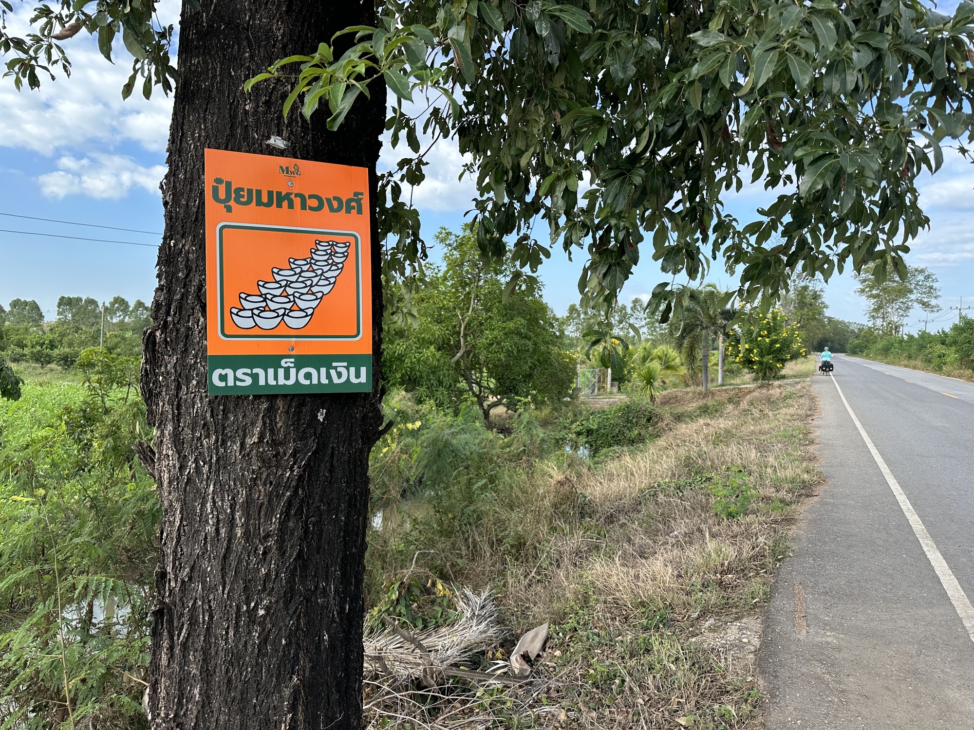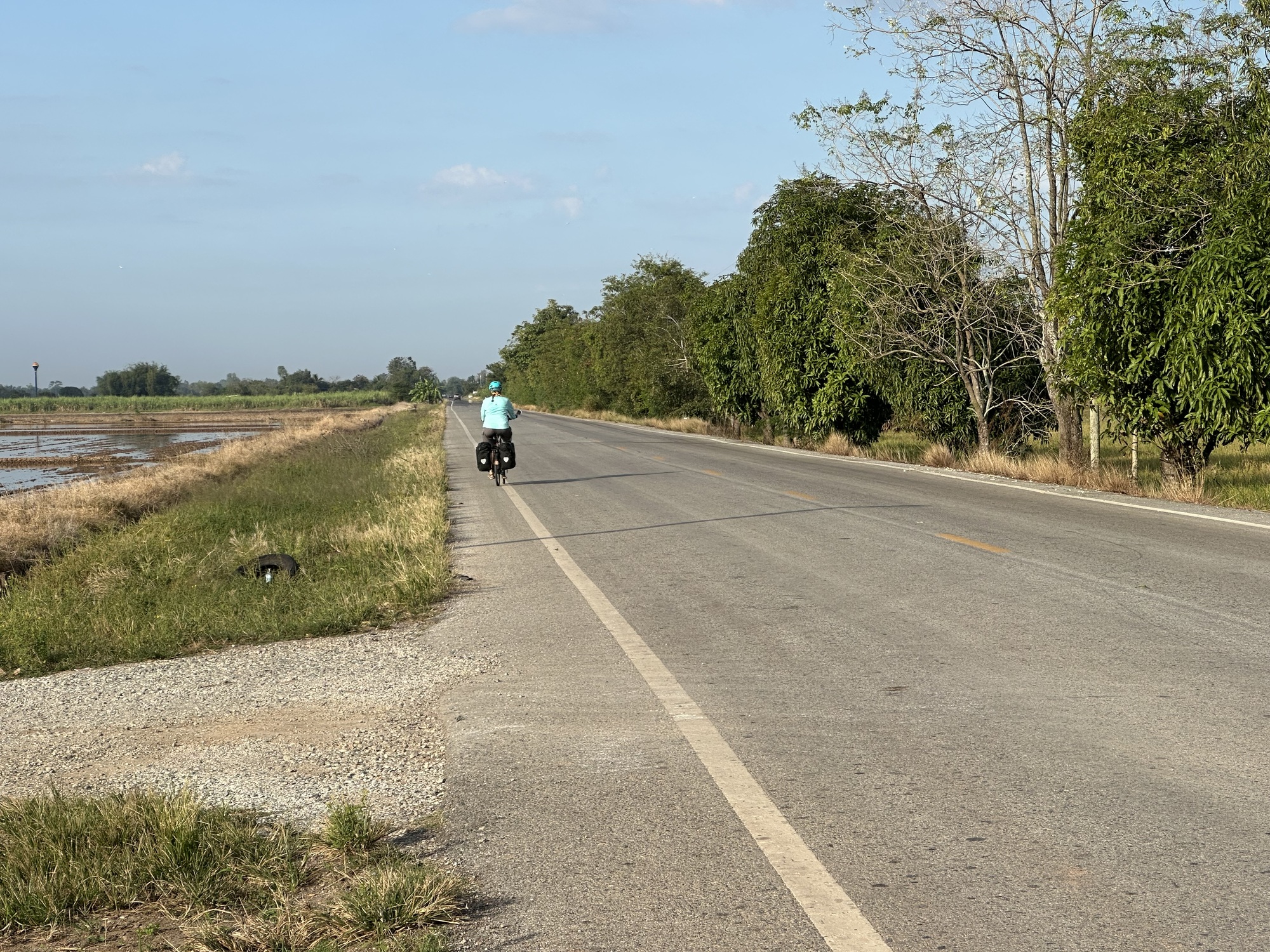 We crossed the Nan River which seemed very full. We were in the town of Nan early in our trip as I'm sure you remember. Whenever we cross a river we have been following upstream earlier in our trips I always wonder if some of the water we saw then is now just swirling around here. OK, it's a stupid thought but when one is just riding along rice fields in various stages of rice and we are constantly dodging clay clods in the median and birds that were singing on the electric wires until just as we pass and then they stop and just stare down at us, I start thinking about a lot of things. I wonder what those birds are thinking when they stare at us. Is their first thought the same thought the Thais have? 'Hmm, Farang.' (Foreigners) Farang on bikes. Is that why they stop singing? They are a bit dumbfounded as they look down on the foreigners with all their panniers and funny looking bikes? These are just a few of the thoughts I have. So, you can imagine how an enormous brown teak leaf falling quickly, transported by what had been a really beneficial tailwind, was projected to smash me full on in the face and how that can suddenly end my normal thought processes. Cycling is serious business! There is a lot going on!