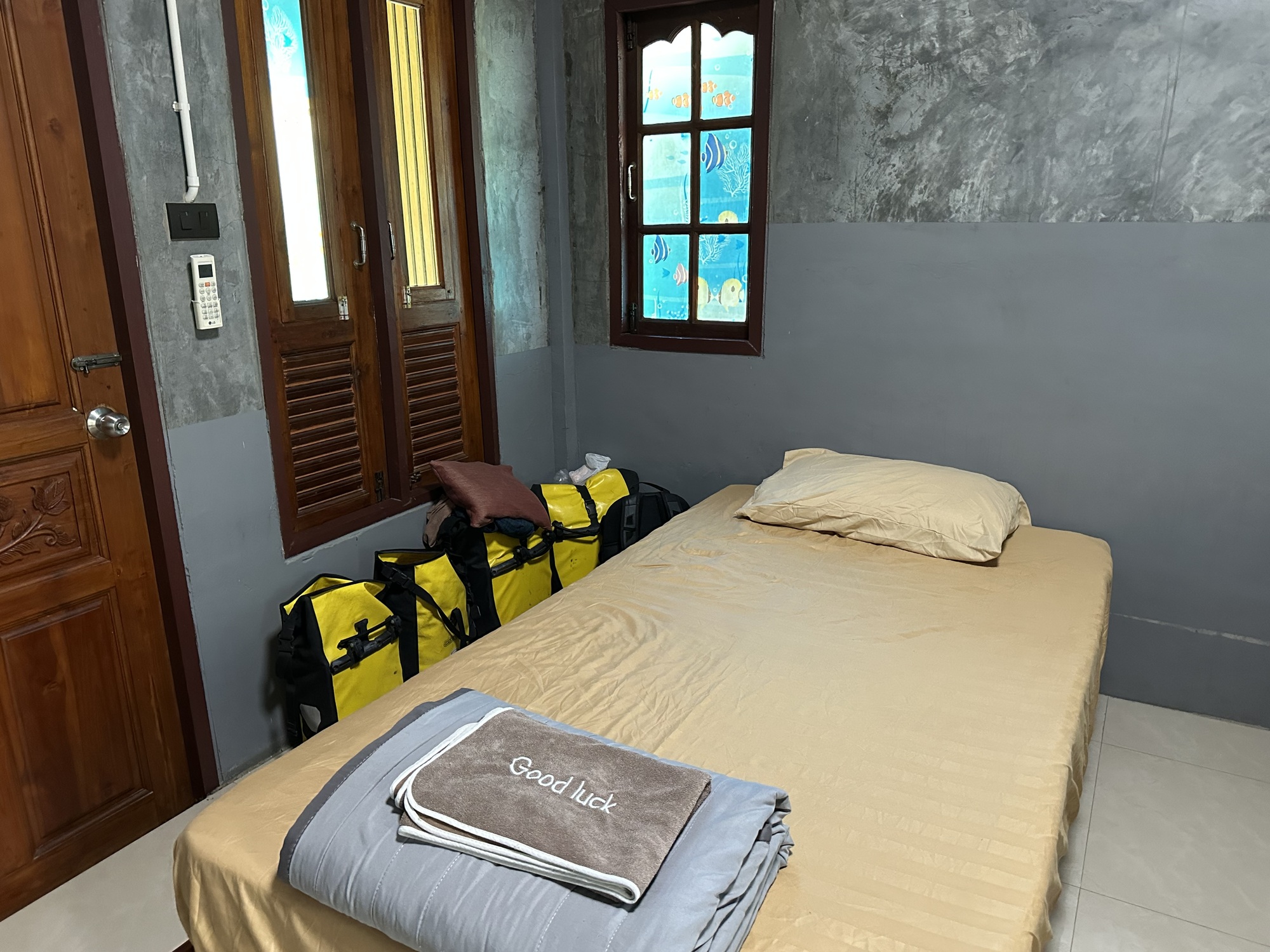 But when we went back to our bungalow it still wasn't working back there. The two women got very concerned and I heard them repeatedly say the word for 'tonight'. They were worried that even if it started working in our bungalow it might not work later in the evening. They didn't want to deal with it so they offered to move us to a bungalow closer to the office area where it seemed to be working. We said sure. We had sort of unpacked and Andrea had even taken a shower but no problem. The two women quickly helped us move all of our open panniers and scattered items to the new bungalow. It all happened very quickly and when we were finally ensconced in our new bungalow we realized it was a major upgrade as well. It was a really beautiful and spotlessly clean bungalow. And the internet was working. Problem solved. Everyone was all smiles. So funny how things happen here. Those women were the best.