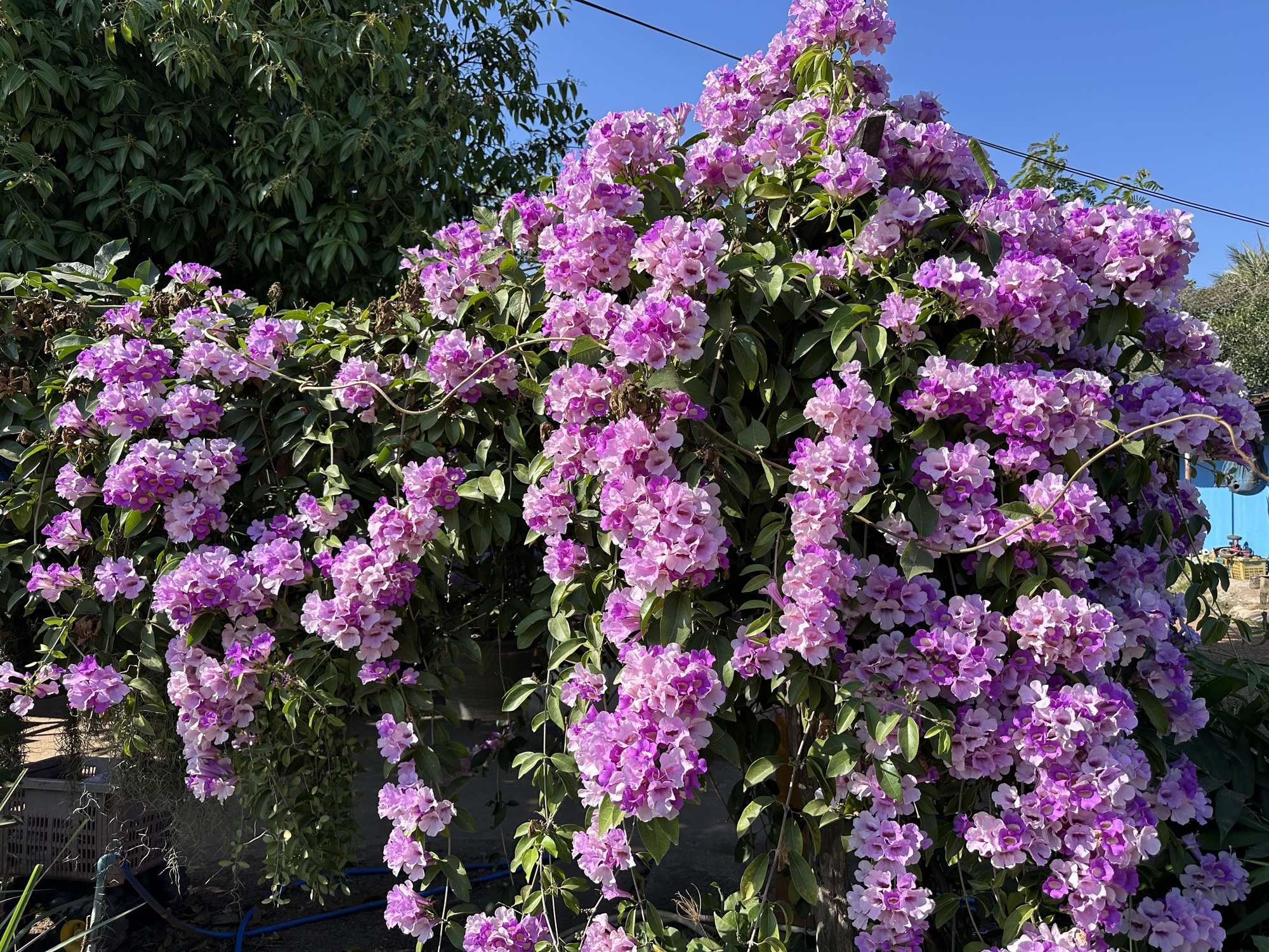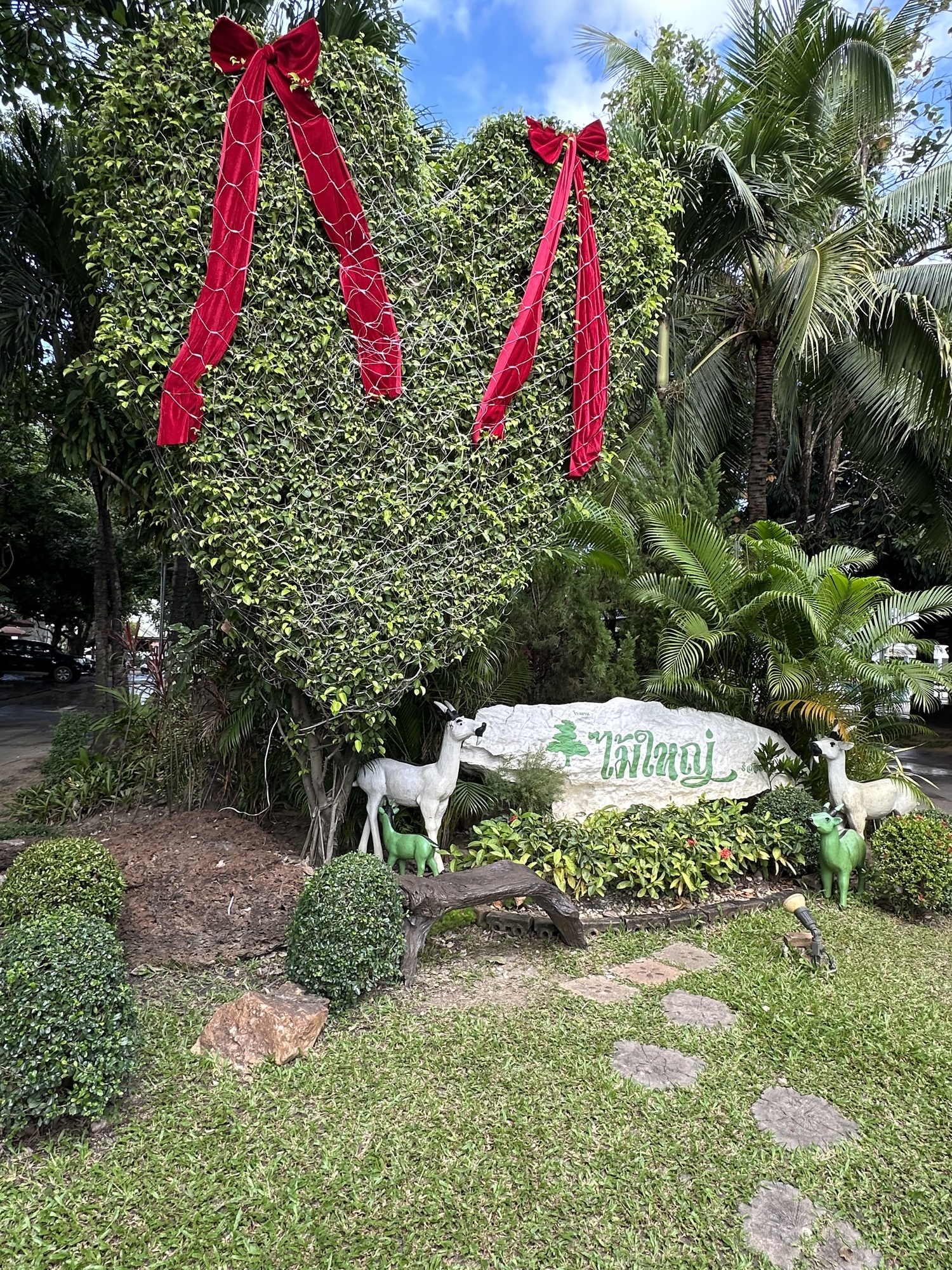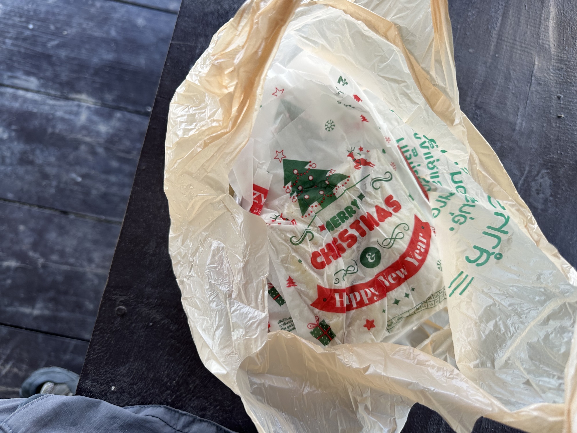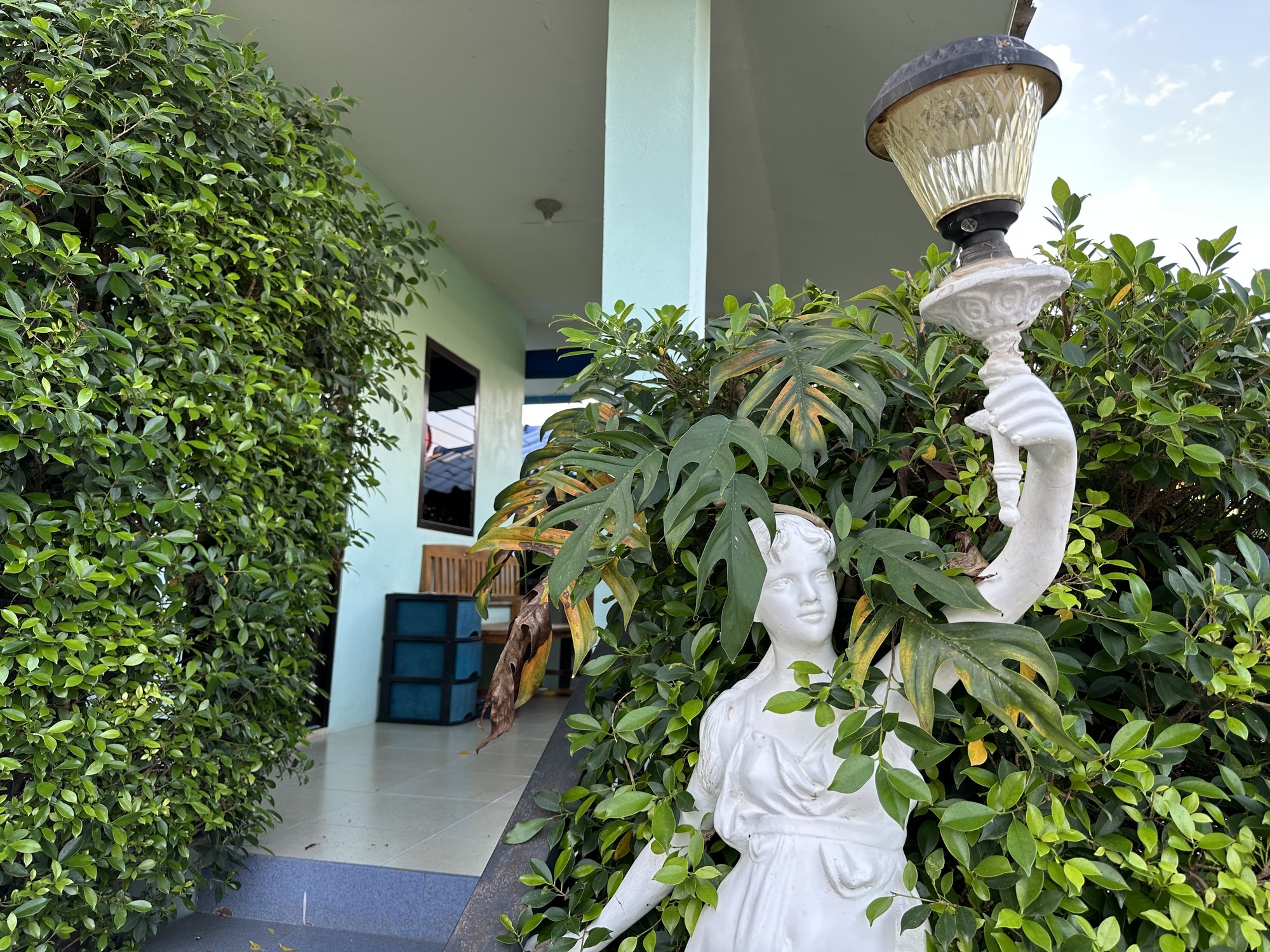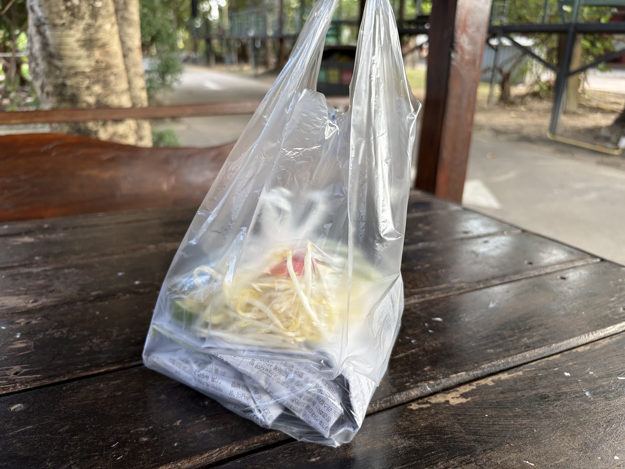 Except that it didn’t come to us. The poor Grab guy used our location back in the trees behind the Big Tree and sent us a photo of our food hanging on the gate of a residence on a nearby street. He tried calling us but doesn’t speak English and so I sent him a photo of the guesthouse entrance and we saw him whiz by and retrieving our food and arriving all flustered. He deserved the tip we gave him, we should have been near the front when we ordered it, Live and learn.