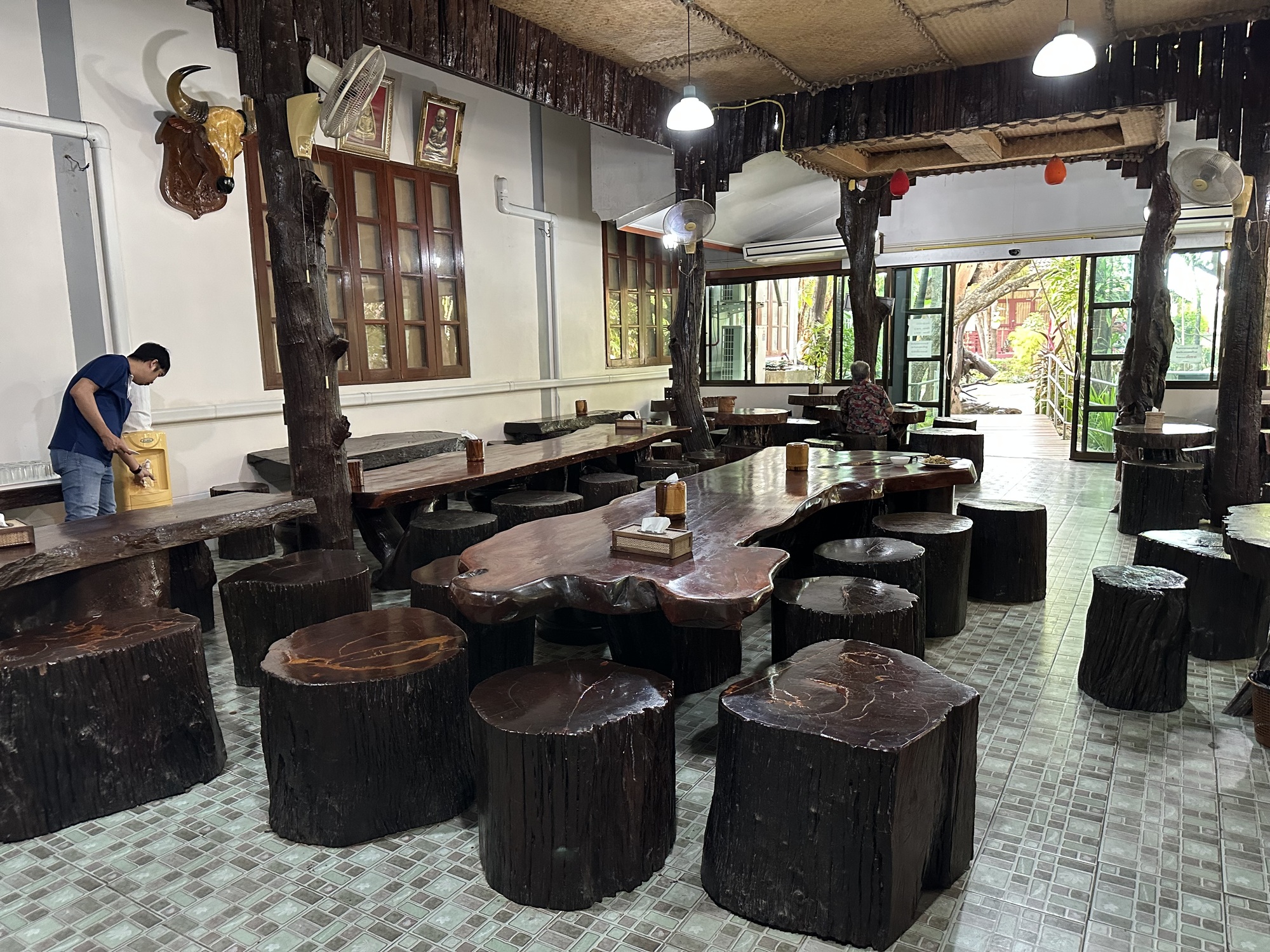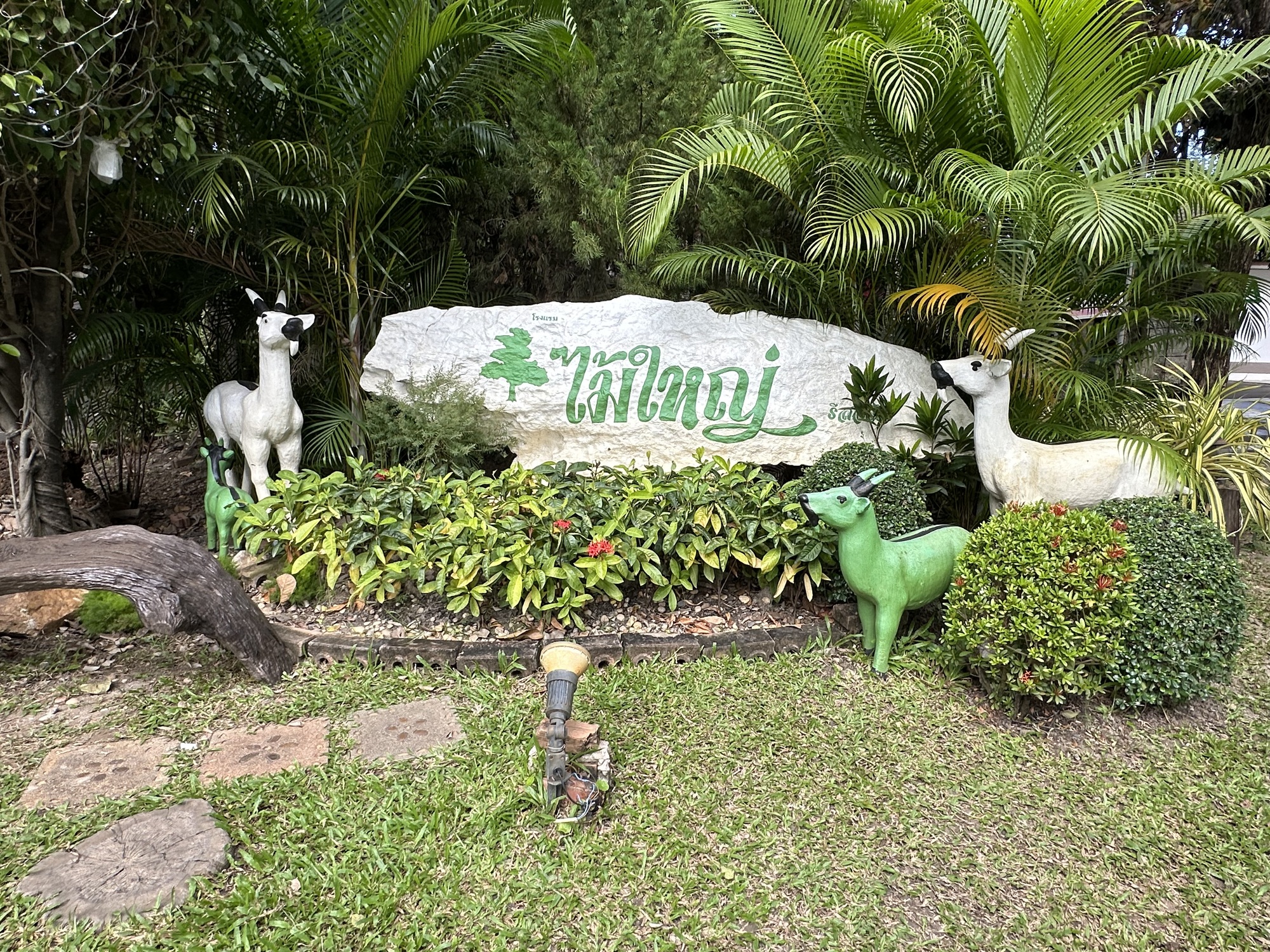 So the tailwind was our pal as we charged into Kamphaeng Phet, screeching into the guesthouse we stayed at before that has a big free breakfast in a room full of huge log furniture. It’s called The Big Tree Resort in English, and there used to be a gigantic teak near the entrance that we think died and turned into the log furniture. The grounds are shady and cool with tons of plants. And yes, they had a room for us, for four nights, 500 baht/night with aforementioned breakfast for two, $16.