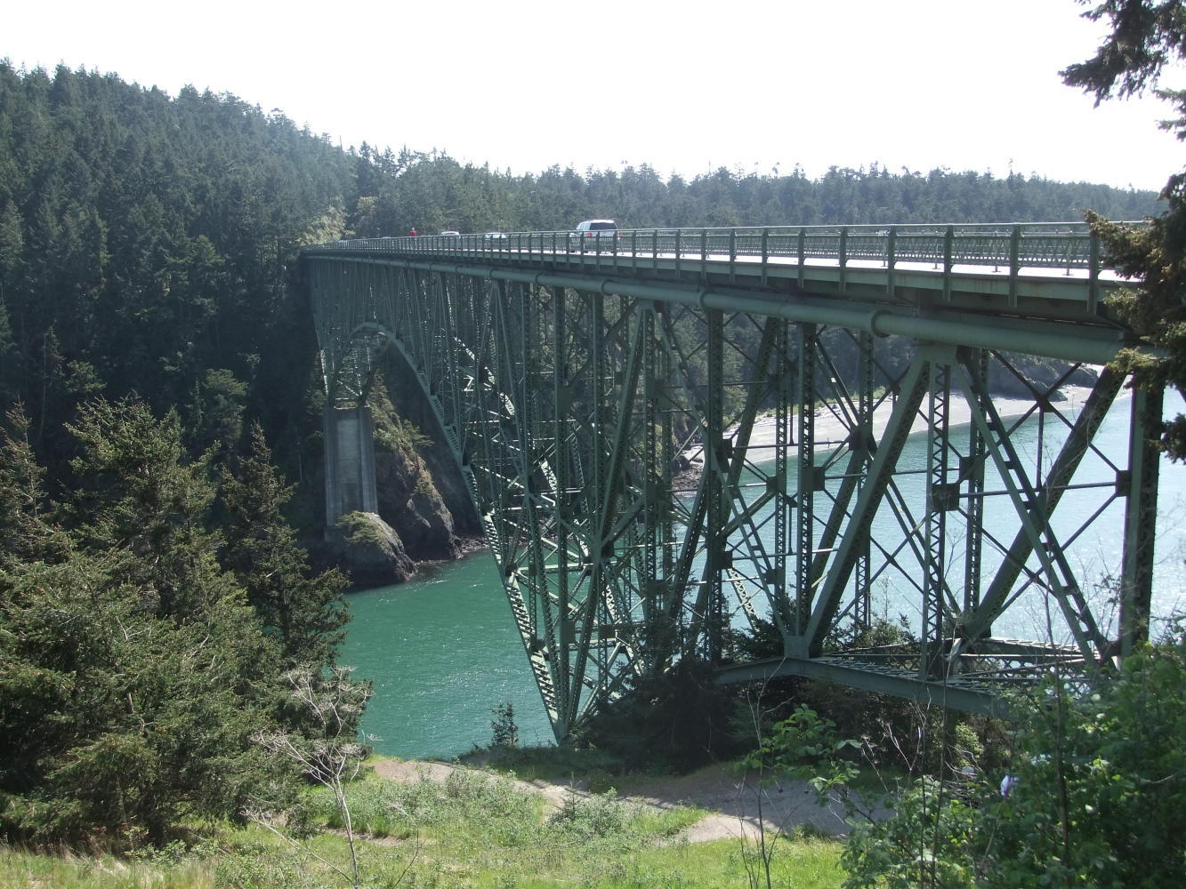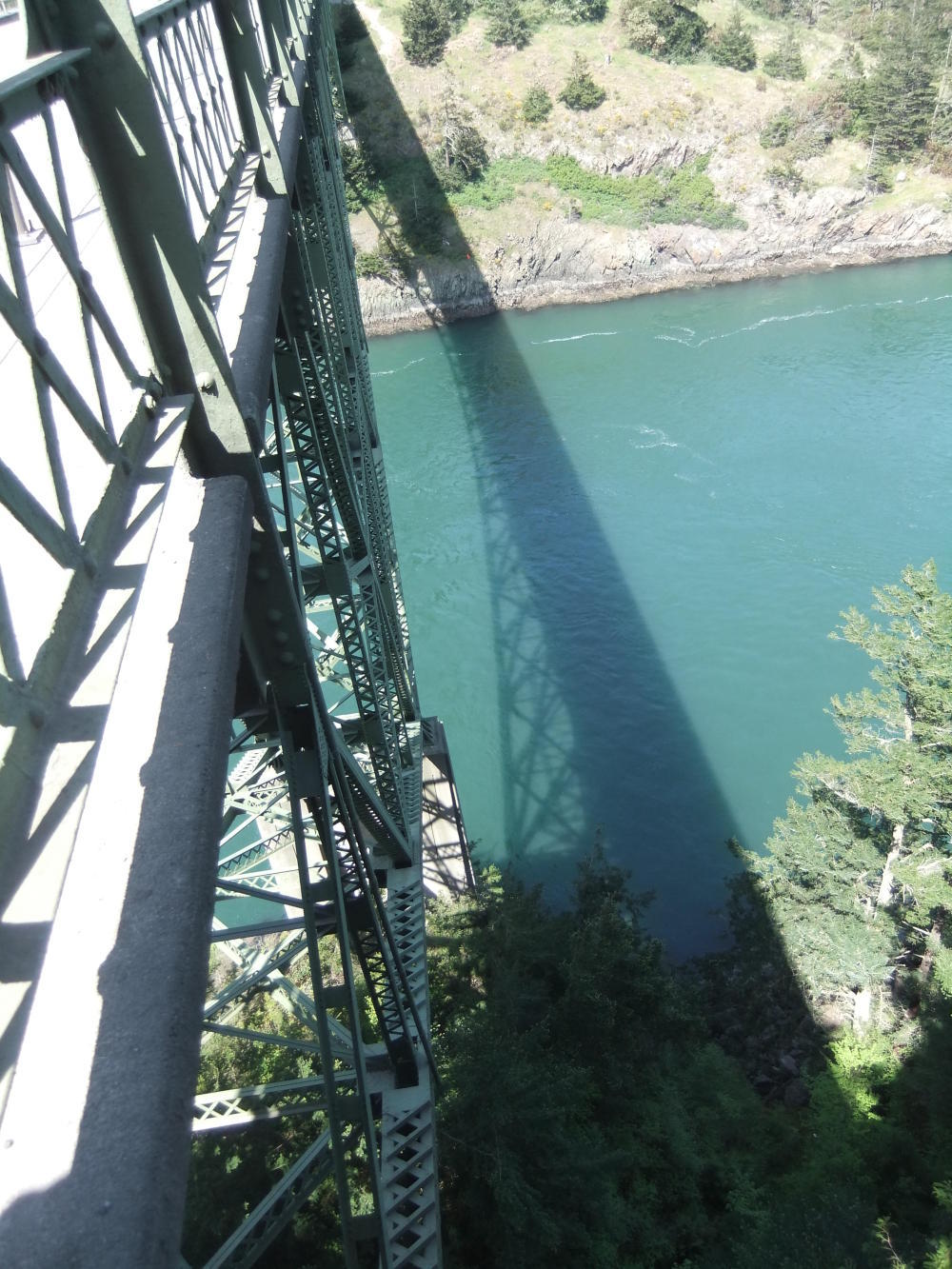 Since seeing pictures of Deception Pass a while ago, I knew it was a place I just had to go to, and being there in person did not disappoint. It was built during the big road building phase of the 1920's and 1930's, and spans 2 large high gaps over turbulent waters with it's riveted steel construction. There is no shoulder for cycling, just a very narrow footbridge, so you can battle with the other pedestrians or wait for a large gap in the traffic and pedal like your arse is on fire. Just past the Pass is a shop serving ice creams. Today has been a lovely day without a single cloud in the sky, just right for eating one. I wasn't paying attention when the lady prepared it, and I nearly fainted when I saw the size of the monster she had prepared. It nearly took 2 hands to carry it. I did manage to polish it all off though.