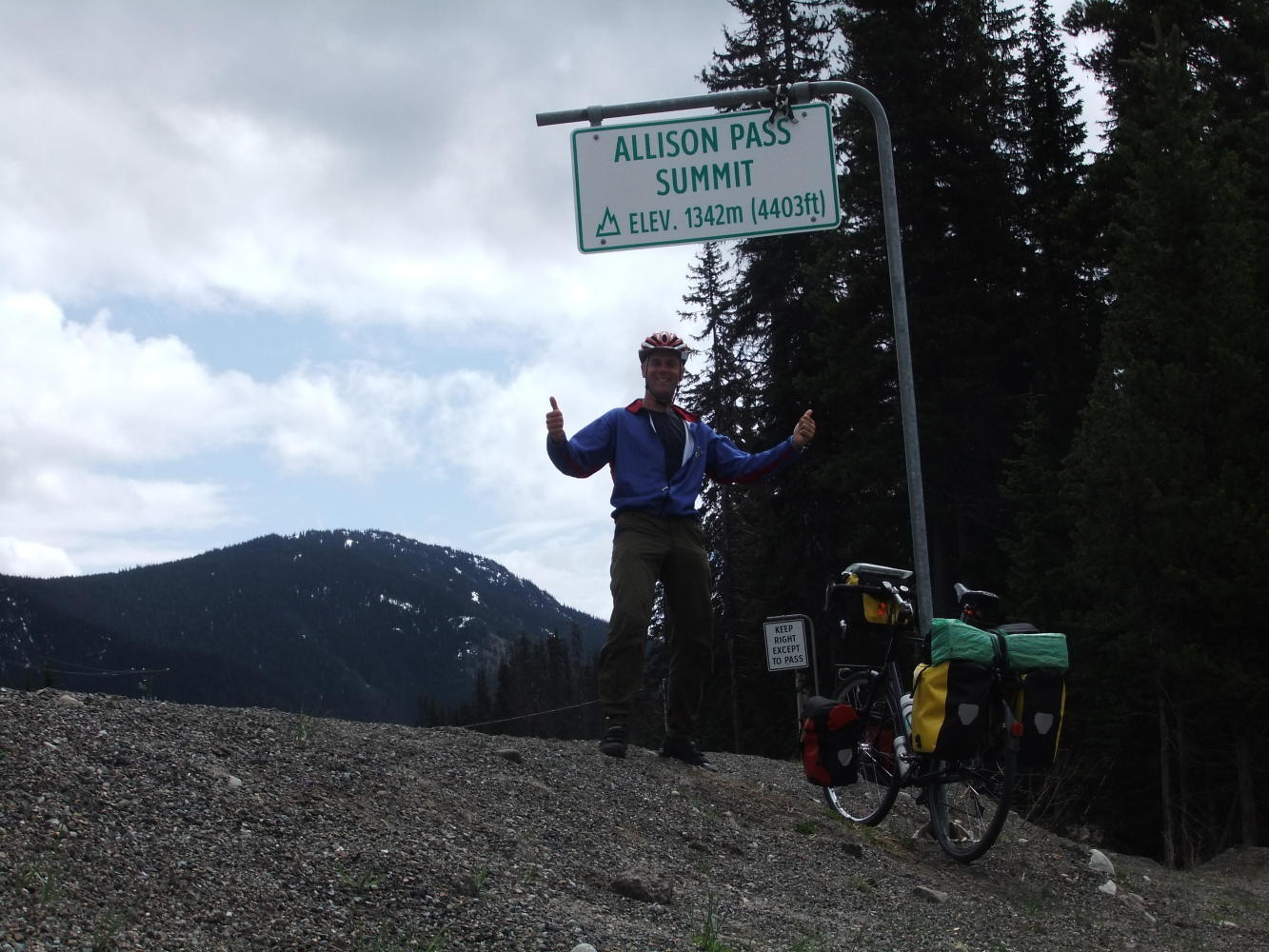 4 hours 45 minutes of cycling time since leaving the campsite at Hope I finally reached the summit of the Allison Pass, which at 1342 metres is disappointingly 2 metres lower than the summit of Ben Nevis (the Scottish one, not the rather dwarflike cousin on Shaw Island at only 385 feet).