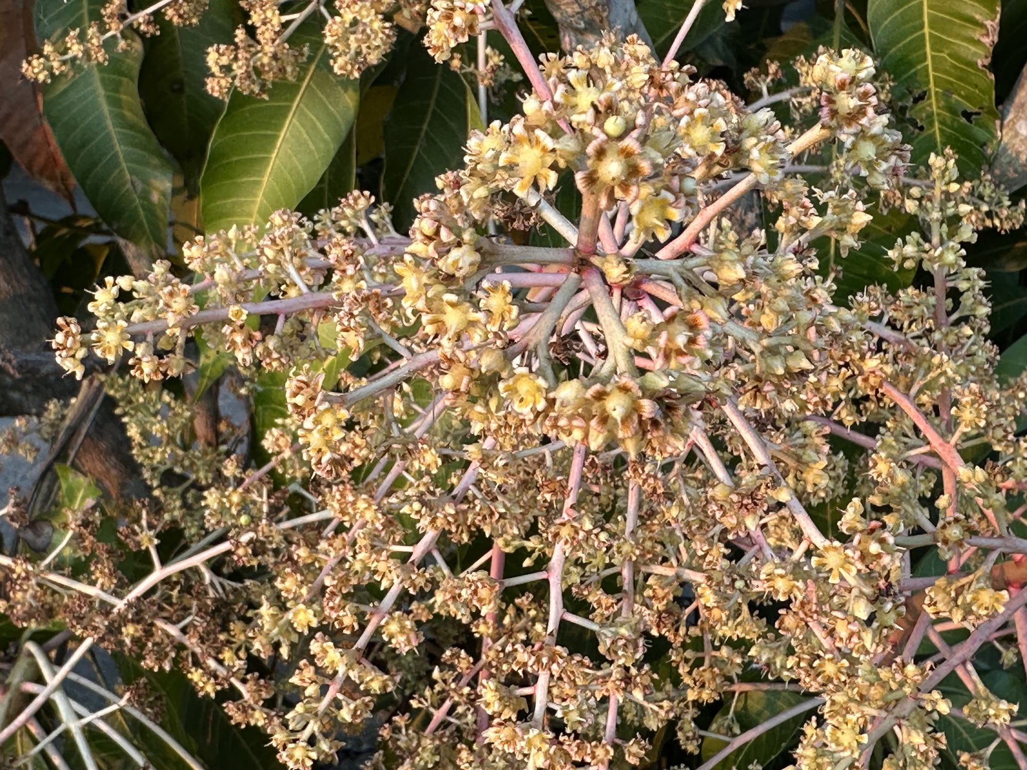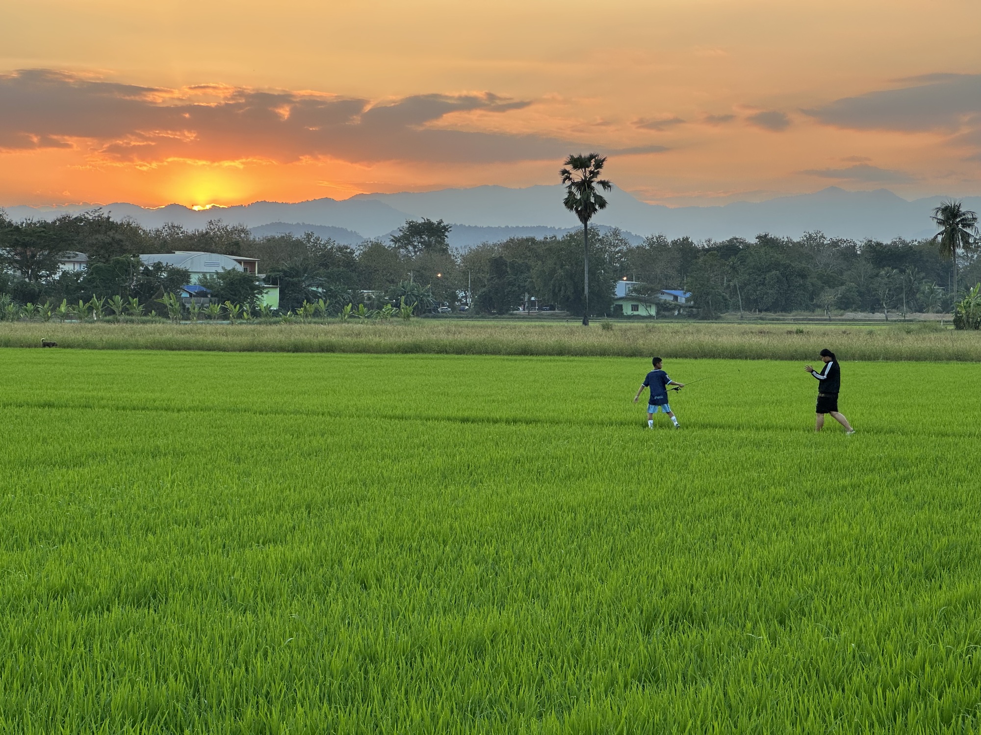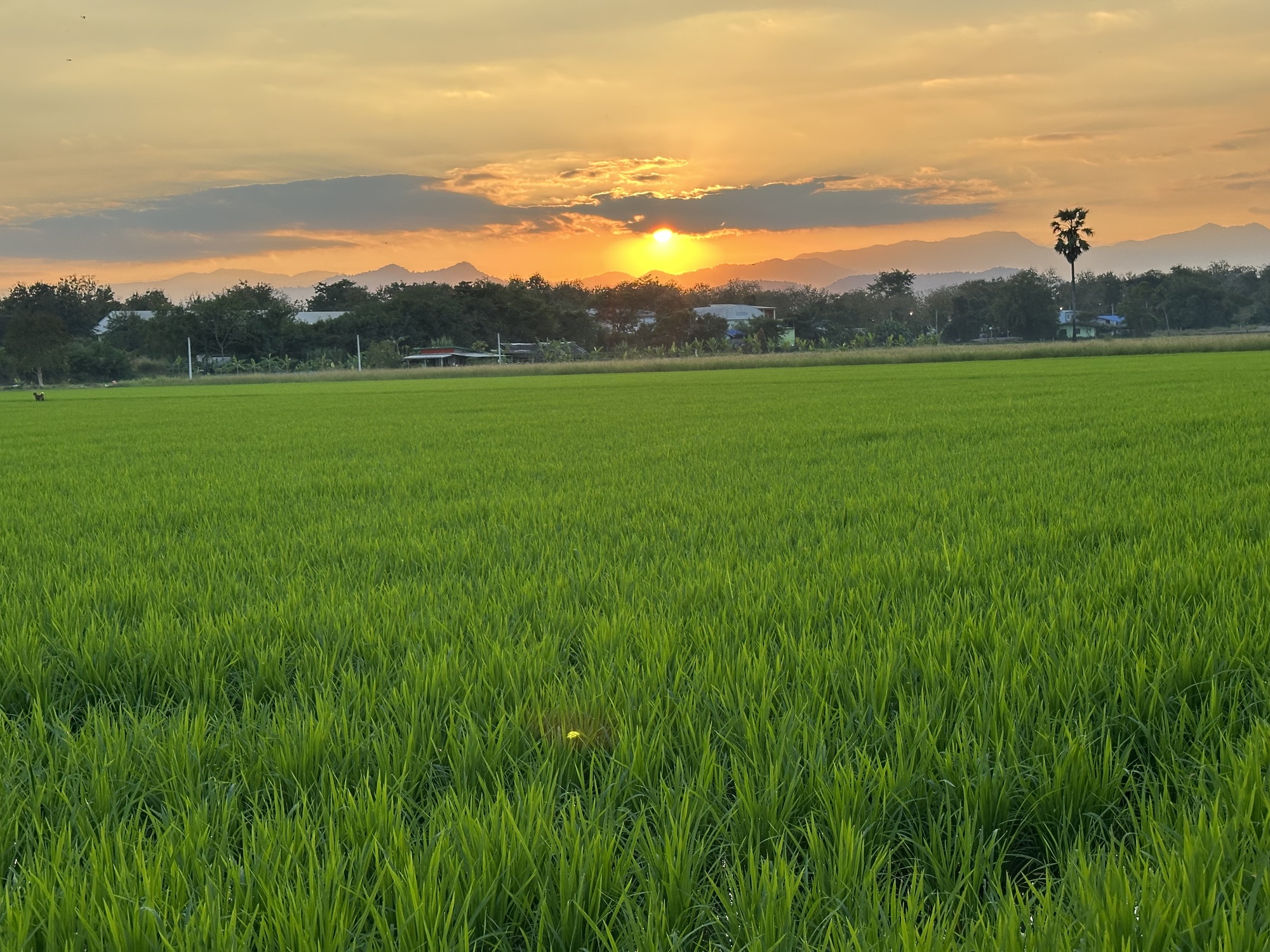 The restaurant is next to a rice field and the food was good. There is a little platform to stand on and watch the sun set over the mountains. Mango trees blossom with tiny fetal mangoes. We’re having more fun than a sort of bad day would warrant. That can happen too.