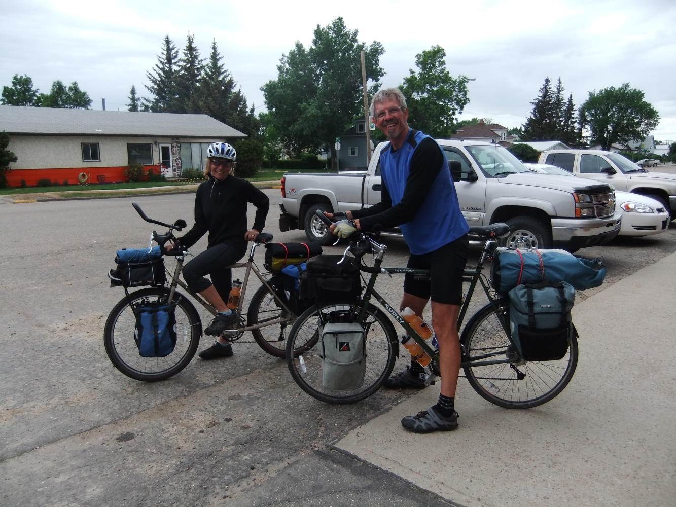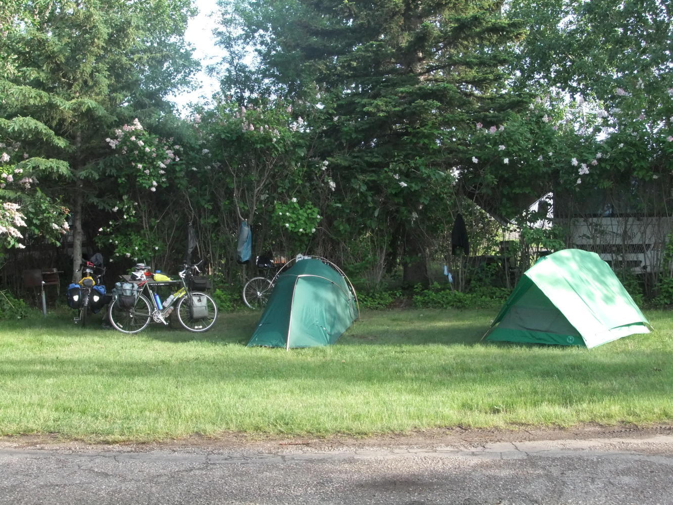 On the way out of town I saw 2 fellow bicycle tourists at the grocery store drinking a coffee, so went over to say hello. Kim and Debbie are also heading for St Johns, Newfoundland, having set off from their home at Grand Forks, B.C. Having stood around for maybe 45 minutes talking to them, we set off and rode together. They are very good company, and before I knew it the day was done and we had arrived at the campsite.