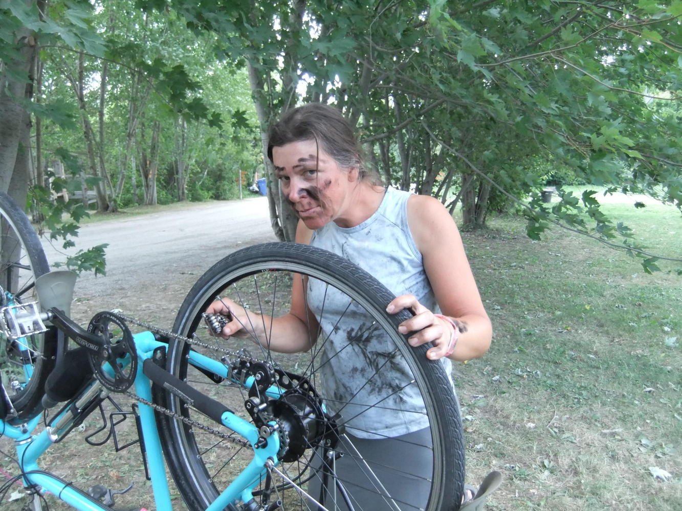 When with Bob at Orillia we went to his local bike shop where I bought a new cassette, chain and middle chain ring, as mine were all showing signs of serious wear (despite my smug thoughts when in Winnipeg), and I decided that I could wait no longer to fit them, so did that today. I also swapped the front and rear tyres again to help even the wear. Whilst cleaning and inspecting the bike, I noticed a break in the front rack - the steel tab holding it to the bottom of the fork had sheared on one side.