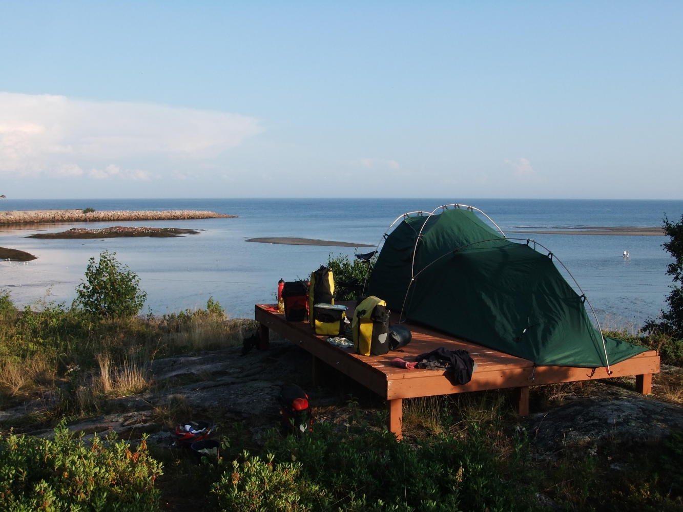 By the time I reached Forestville I had had enough, and found the Camping de la Baie-Verte. I had a great spot on a raised wooden deck, surrounded by wild blueberries, and with a lovely view of the bay, and all this for $12! Needless to say I had a swim in the bay before attempting to fill the bottomless pit that is my stomach.