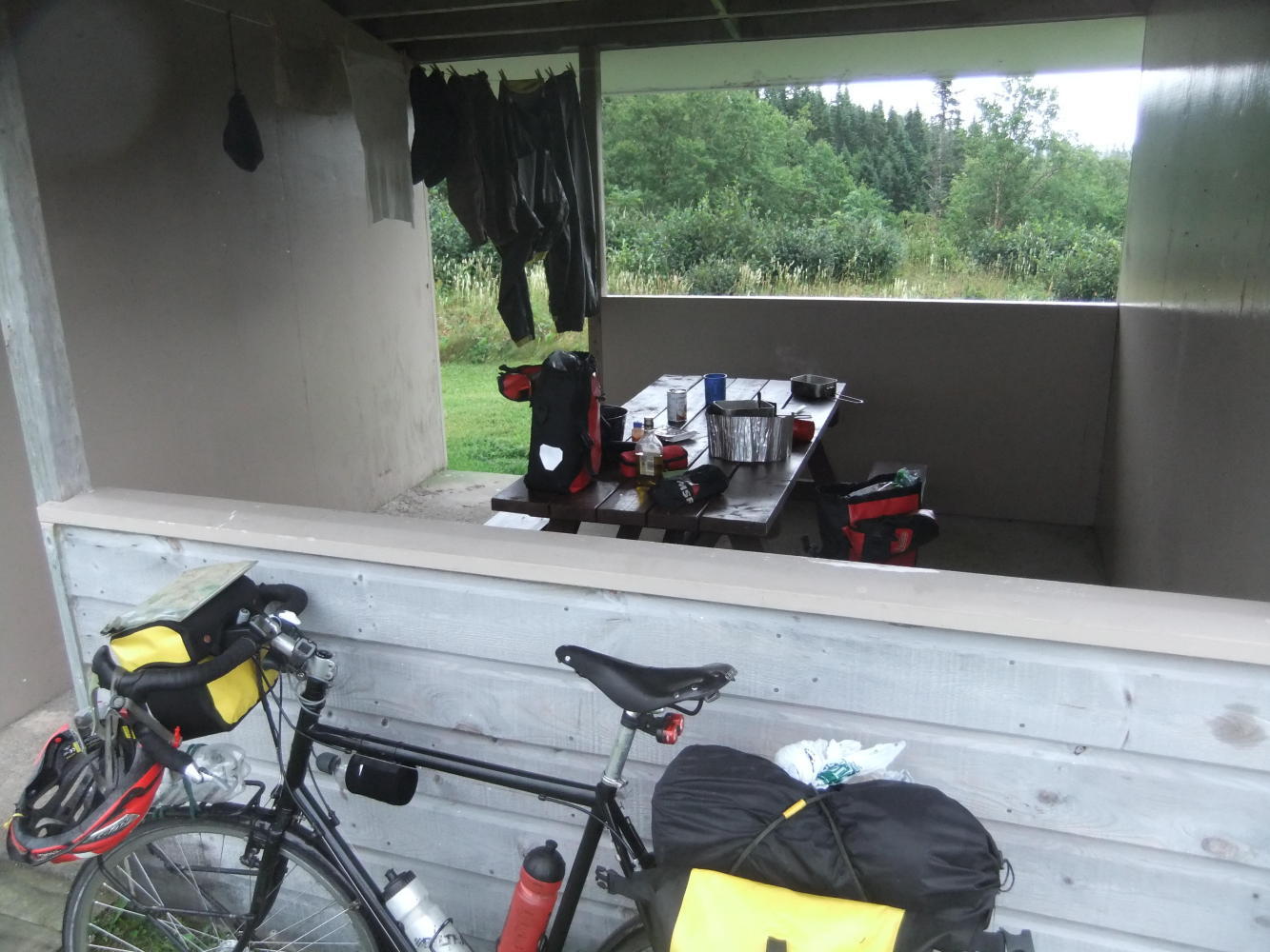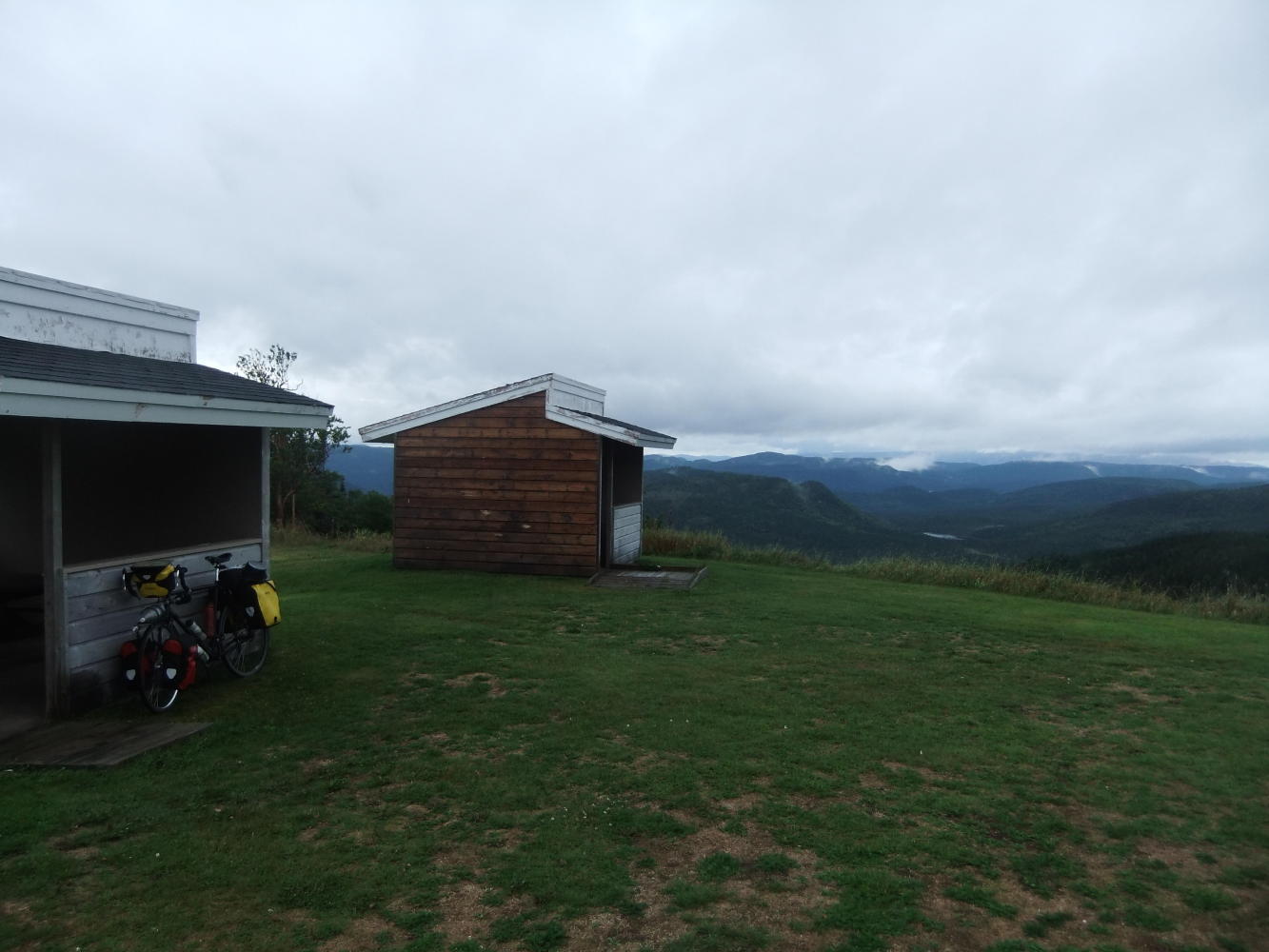 The road south out of the National Park was now at it's hilliest, which encouraged some side trips to look at waterfalls and viewpoints on the way. When I got to the top of the final and highest climb I saw signs for a lookout with covered picnic areas and toilets. Was I hallucinating? No, it was real, a campsite from heaven, all to myself. That was until two motorcyclists from Quebec turned up to occupy the other shelter, but this turned out to be a blessing as they were such good company, with many funny stories to tell.