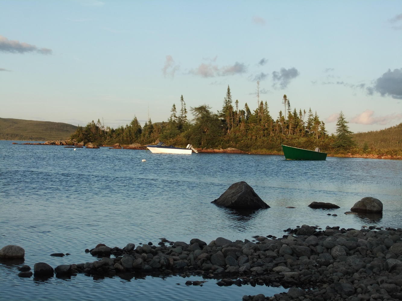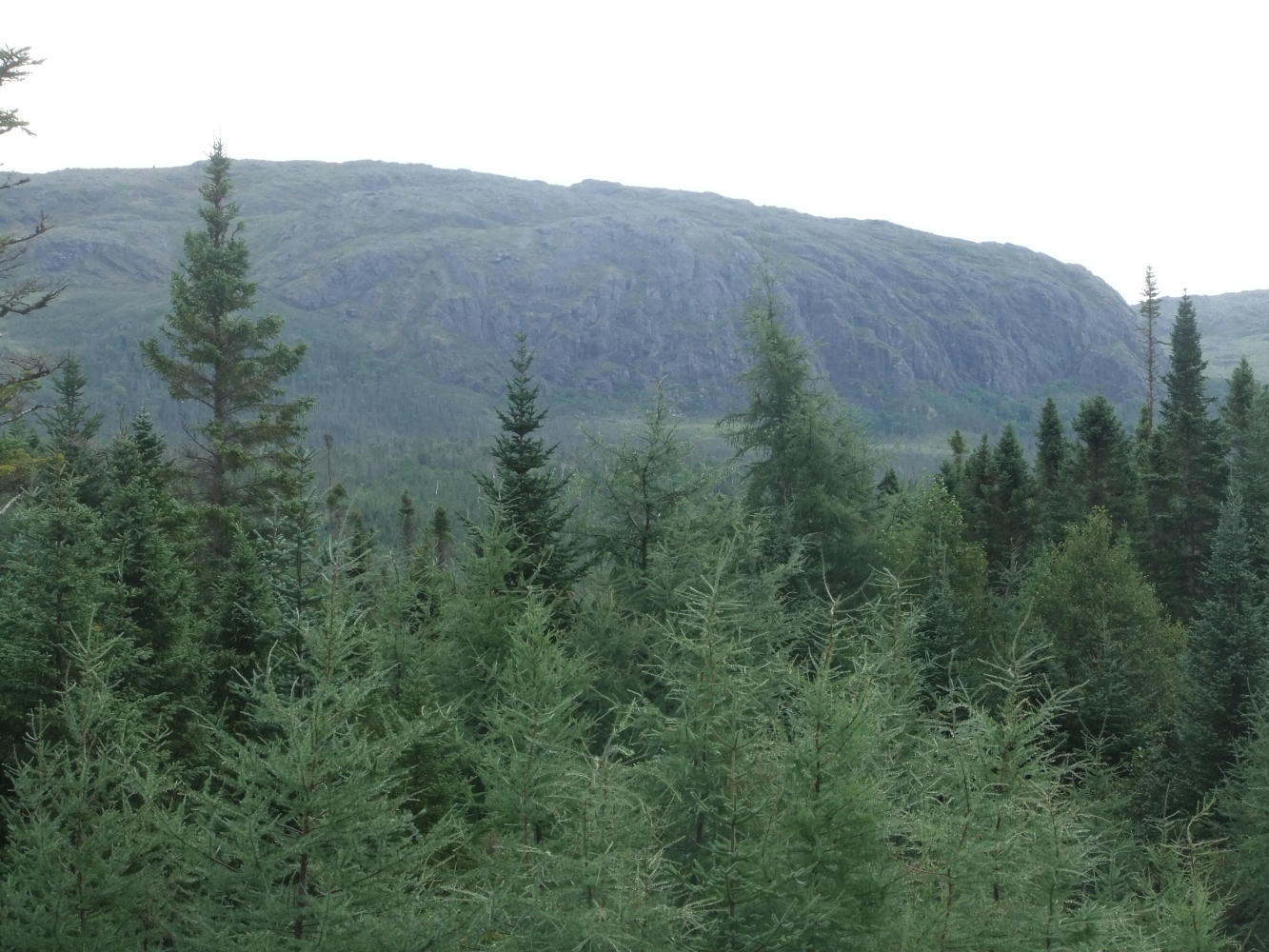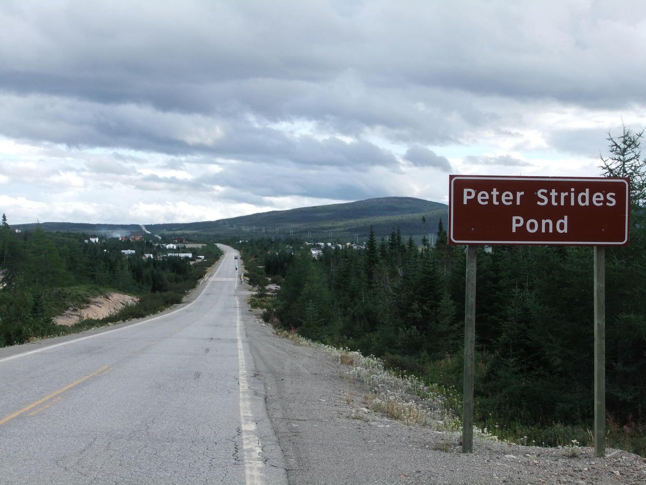 There was some very heavy rain as we headed south on the almost deserted Burgeo highway, but it didn't distract us from the beautiful views. The land was mainly forest and rolling hills, but we passed close to the Annieopsquotch Mountains which are outstanding. When we came to Peter Strides Pond, an area which a few Newfies have built their "cottages" and the first sign of habitation since leaving the Provincial Park, we ate dinner by the shore of a lake, and a local we were chatting to showed us a place to put the tents which was flat, not too rocky, and wouldn't be in anybody's way. It was time for an early night.