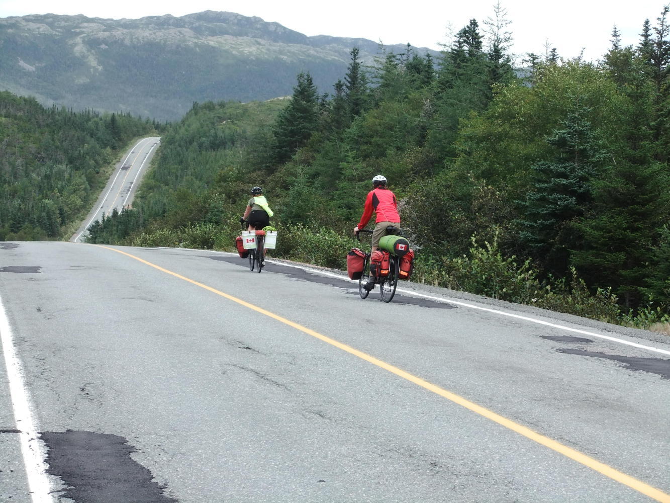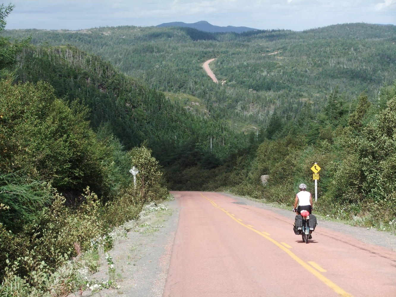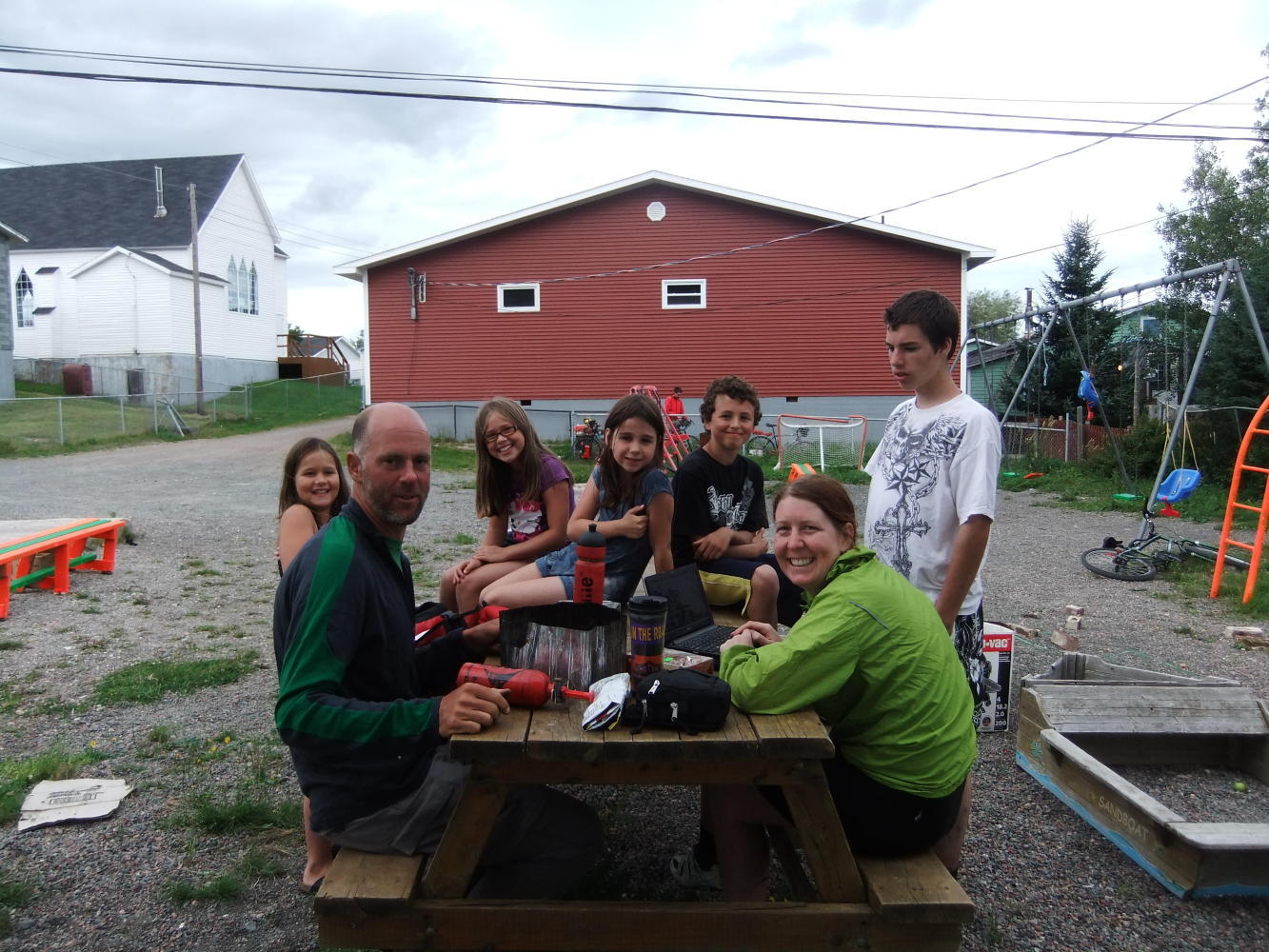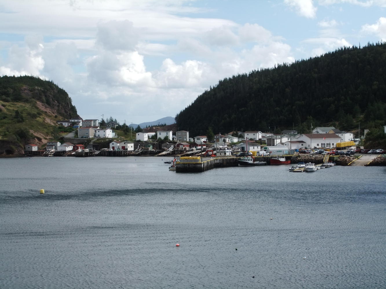 The ferry dropped us at Hermitage (after first calling at McCallum), and there were strong tail and cross winds, which together with some great hills helped me smash my previous top speed of 52mph, and replace it with an even more credible 56mph (90kmh). Pools Cove was the end of the road for us today, as the next ferry we need doesn't leave until tomorrow, and we were offered camping between the Town Hall and the Rec Centre (Youth Club).