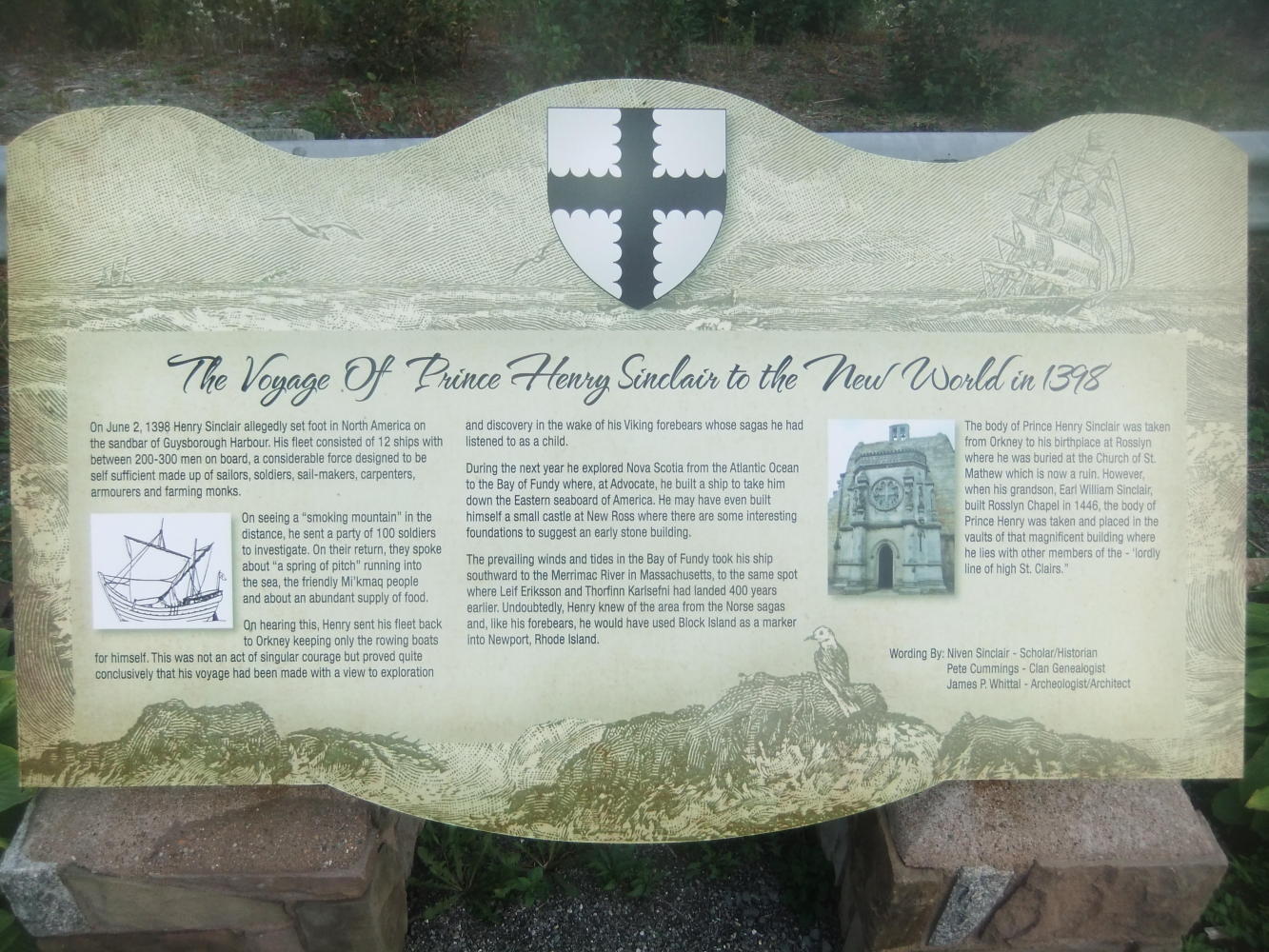 At the Chedabucto Bay Look Off there is a plaque commemorating the controversial discovery of the New World by Scot Prince Henry Sinclair in 1398 (assuming of course that you ignore the previous discoveries by the Vikings 400 years earlier, and the Native Americans many thousands of years earlier).