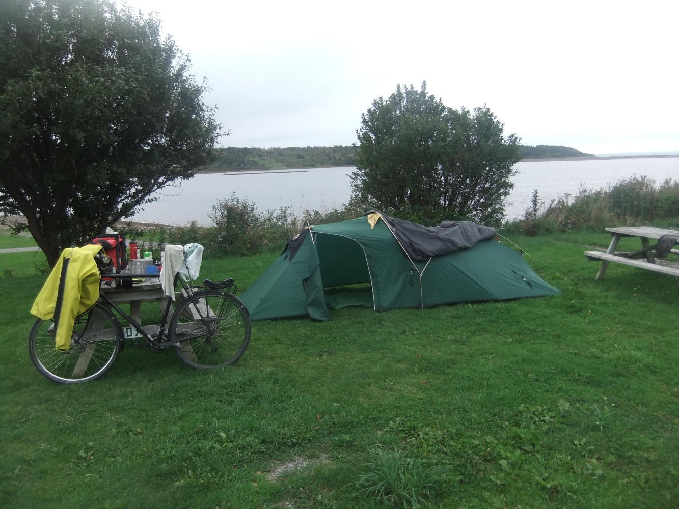 Unfortunately Nova Scotian campgrounds seem to think it acceptable to charge for showers after having already charged an entrance fee. Even though the Hyclass Ocean Campground follows this trend, they do offer a special cyclists rate (even if like me you are just an ordinary cyclist, you still qualify) of $17.25 including tax, which is cheap round here! Now that everywhere is wet following all the rain, there are so many mosquitoes around that there is a danger that if they all landed at the same time they would knock the planet out of its orbit.