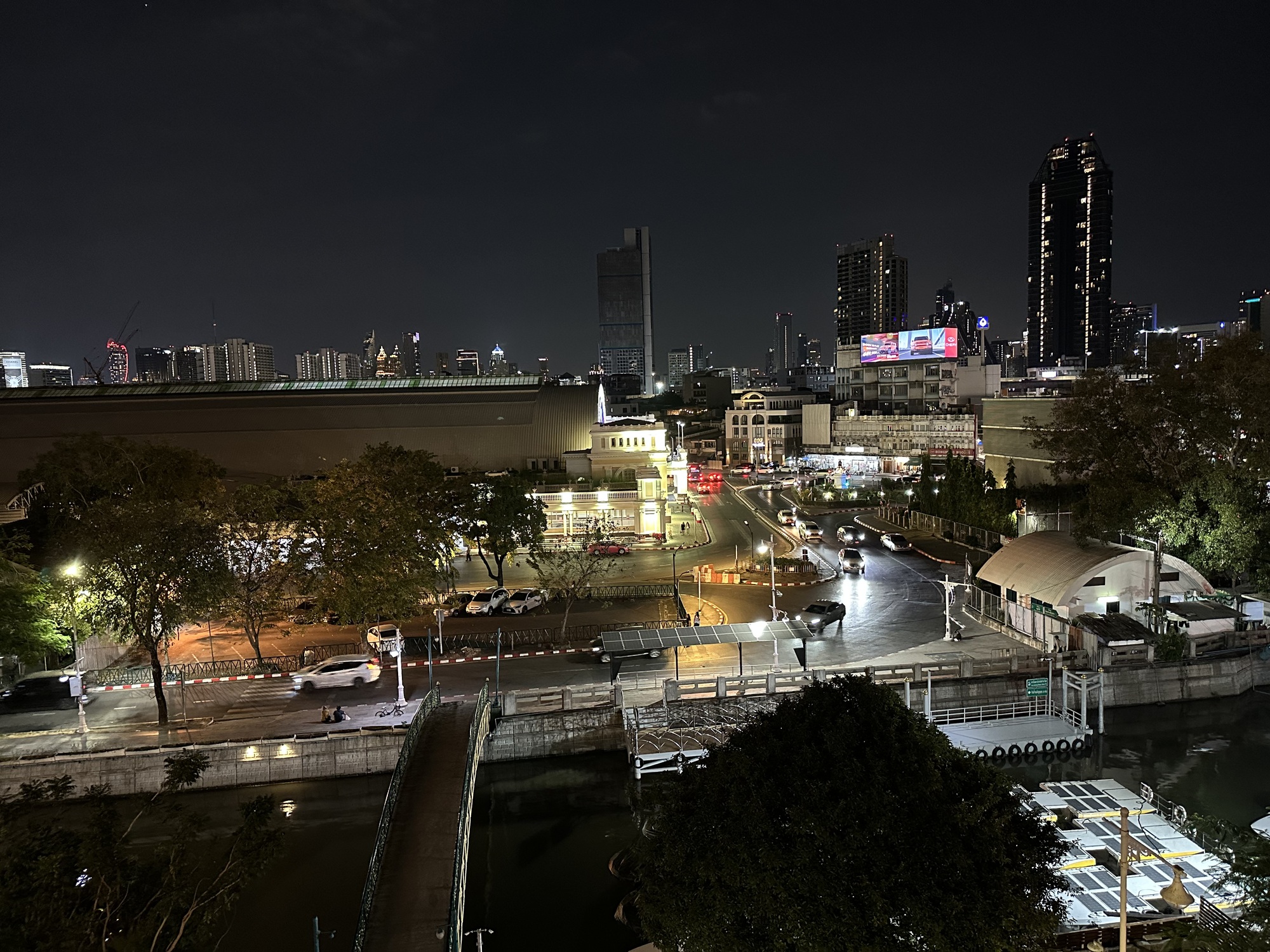 We were on! We were moving! The sun was setting through the windows, and then the sudden darkness of a subtropical evening, and eventually the edges of the vast metropolis were upon us. It was very exciting, after all of our stress about this train trip. When we arrived at Hualomphong it felt like a real triumph. We unfolded the bikes and tightened them up, loaded them, rode out of the deserted station, around the curve, over the khlong bridge, across the street, and lifted them up onto the sidewalk in front of our hotel door.