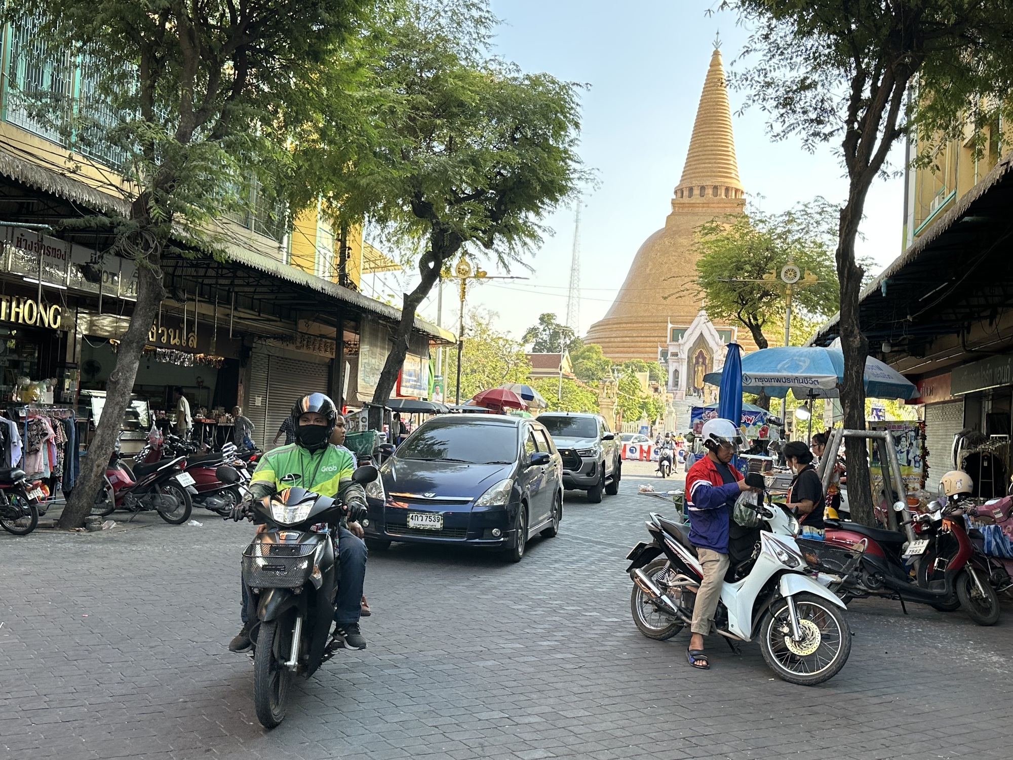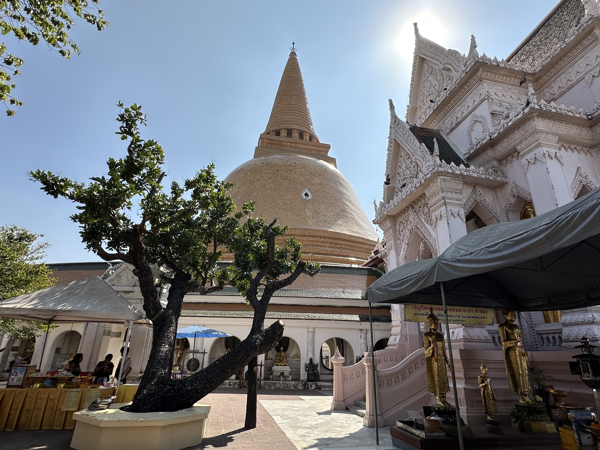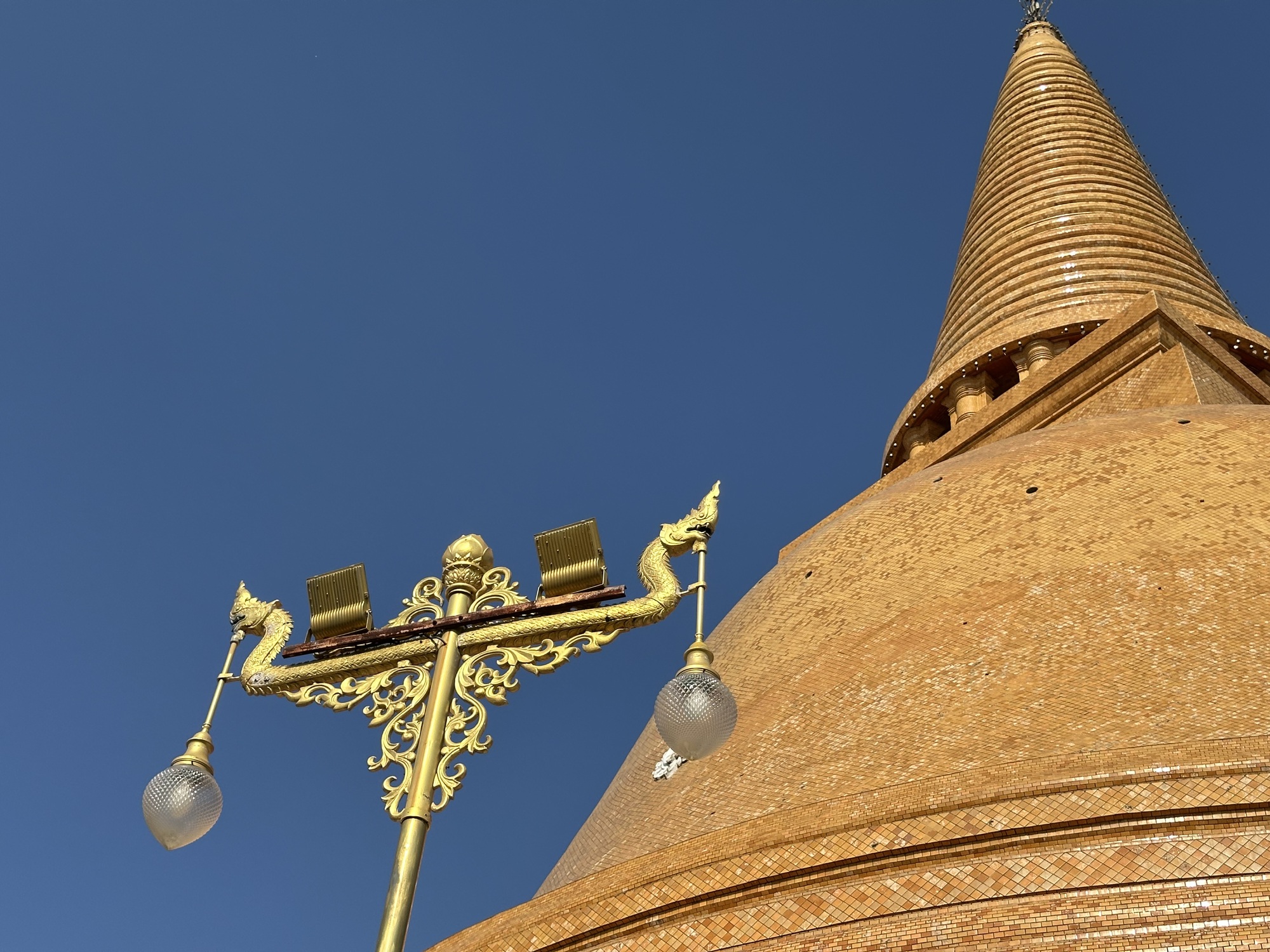Relieved, or sort of relieved, we took off for a nearby temple area. It was a giant chedi, Pra Prathom Chedi. Massive. With two loaded bikes, I opted for hanging with those in the shade of a giant bodhi tree on the temple grounds while Bruce walked up the chedi and explored and took photos. I love bodhi trees, the rustle of the leaves, the comfort of them. The weather was amazing, 78 degrees, lovely breeze, I was perfectly comfortable and content to hang out and people watch.