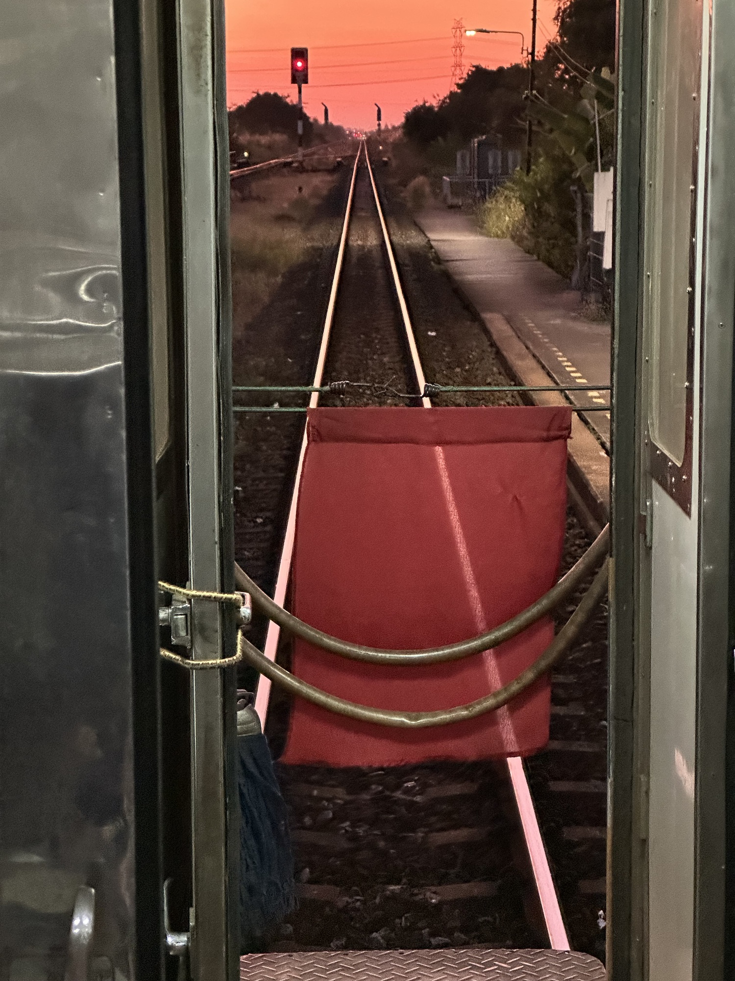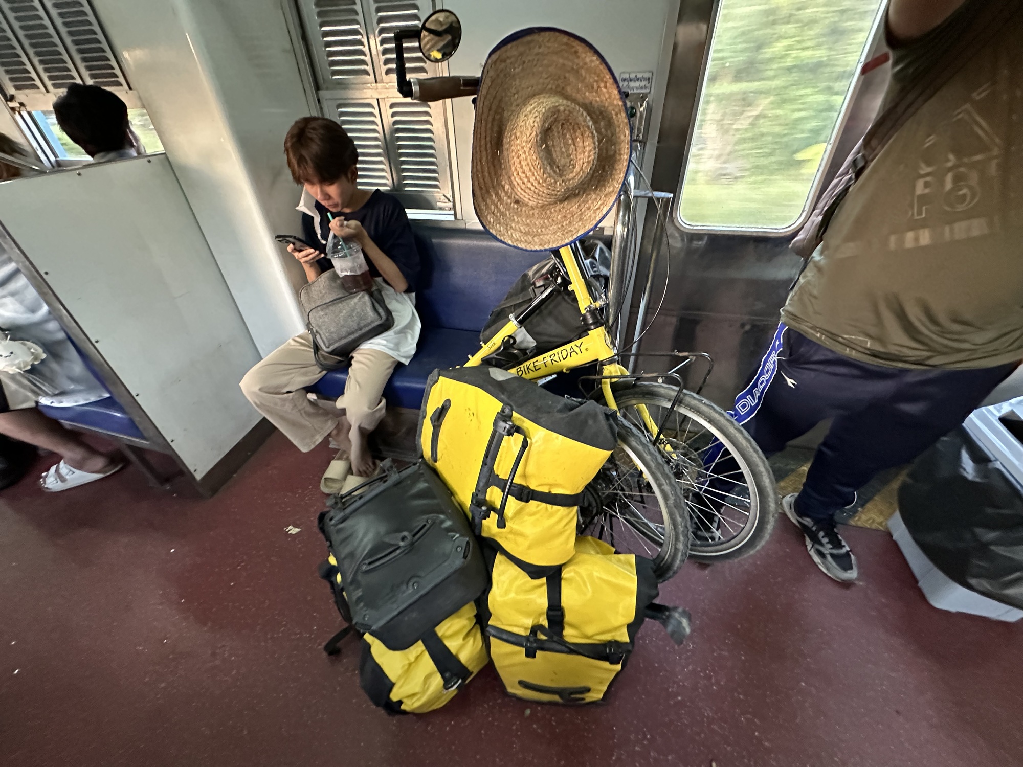 A railway employee came by and showed us where to put the bikes and bags, and insisted we fold them. Dang. So we folded them, sort of. When we boarded he helped chuck everything in, and we dragged them down an aisle to an area with double doors that didn’t ever open. But the entry he had told us to use was not as narrow as the other doors so we were in, and standing near our bikes for awhile until people got off.