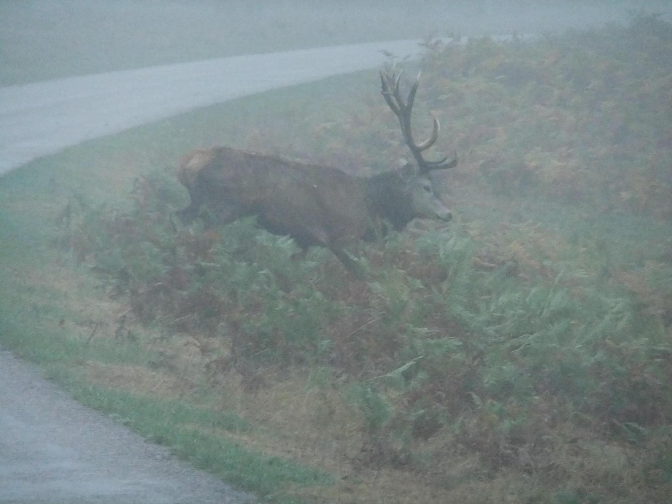 It was an early start this morning and although it was light I had to put the lights on as it was a misty morning. In fact they stayed on most of the day for the same reason. I decided to go through the Windsor Great Park again, and was rewarded by a magnificent close up view of a stag. Whilst fumbling to take my camera out he started to move away, but I managed to catch him on film (or silicon).