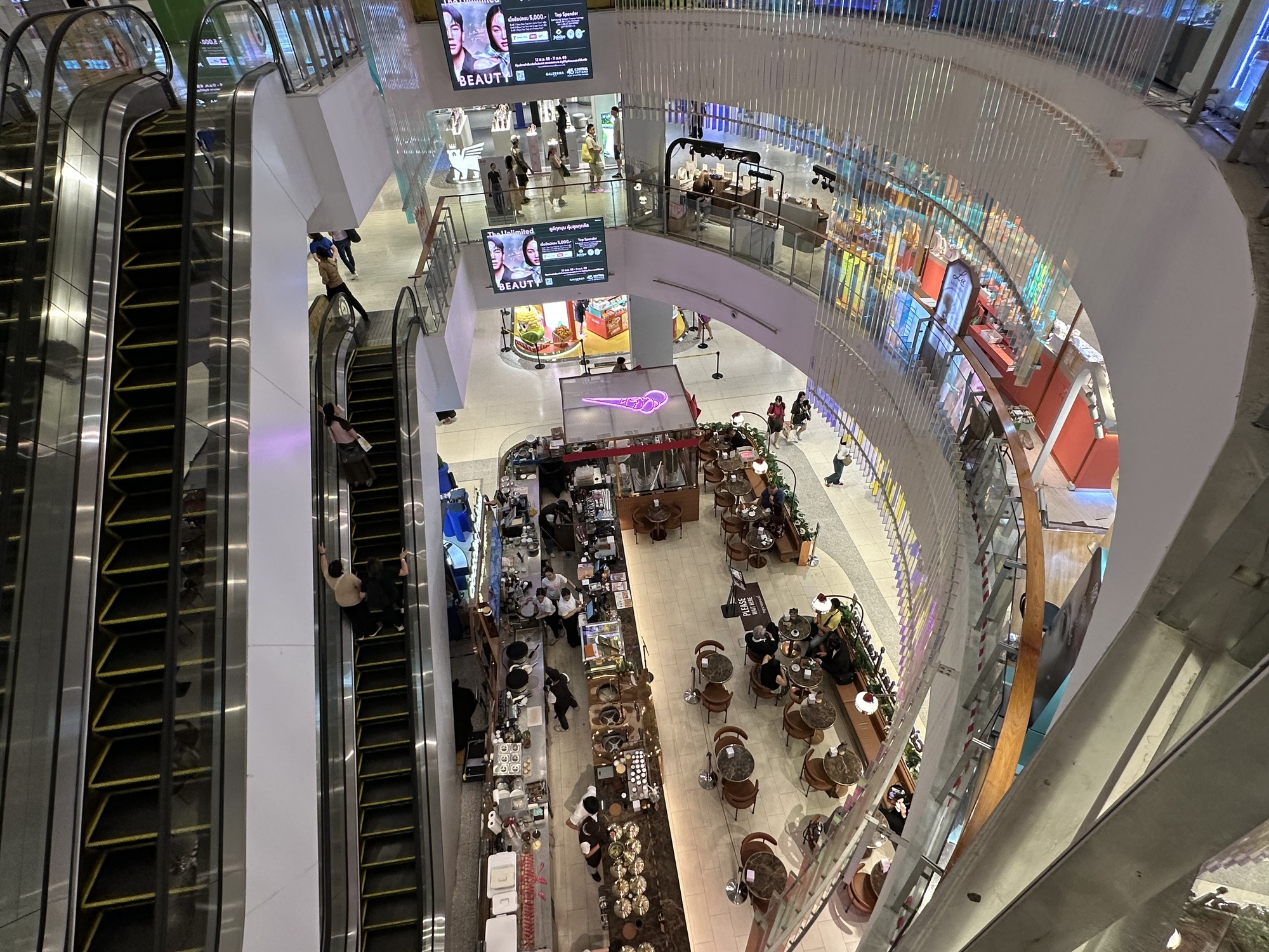 Mission one after our deluxe brekkie, was to use our new transportation skills to get out to The Mall. Now, there are tons of malls in Bangkok, and unlike the sad echoing caverns of American malls, they are busy, busy places. For one thing, they are air-conditioned, and the hotter it is outside, the more people go to the mall. For another, we hear that their food courts are very good, which we haven’t had the heart to try because losing street food in Bangkok would be murder to life there and to all the tiny mom-and-pop kiosks that make one or two things and make them superbly, the people who can’t afford to rent a kitchen at a mall.