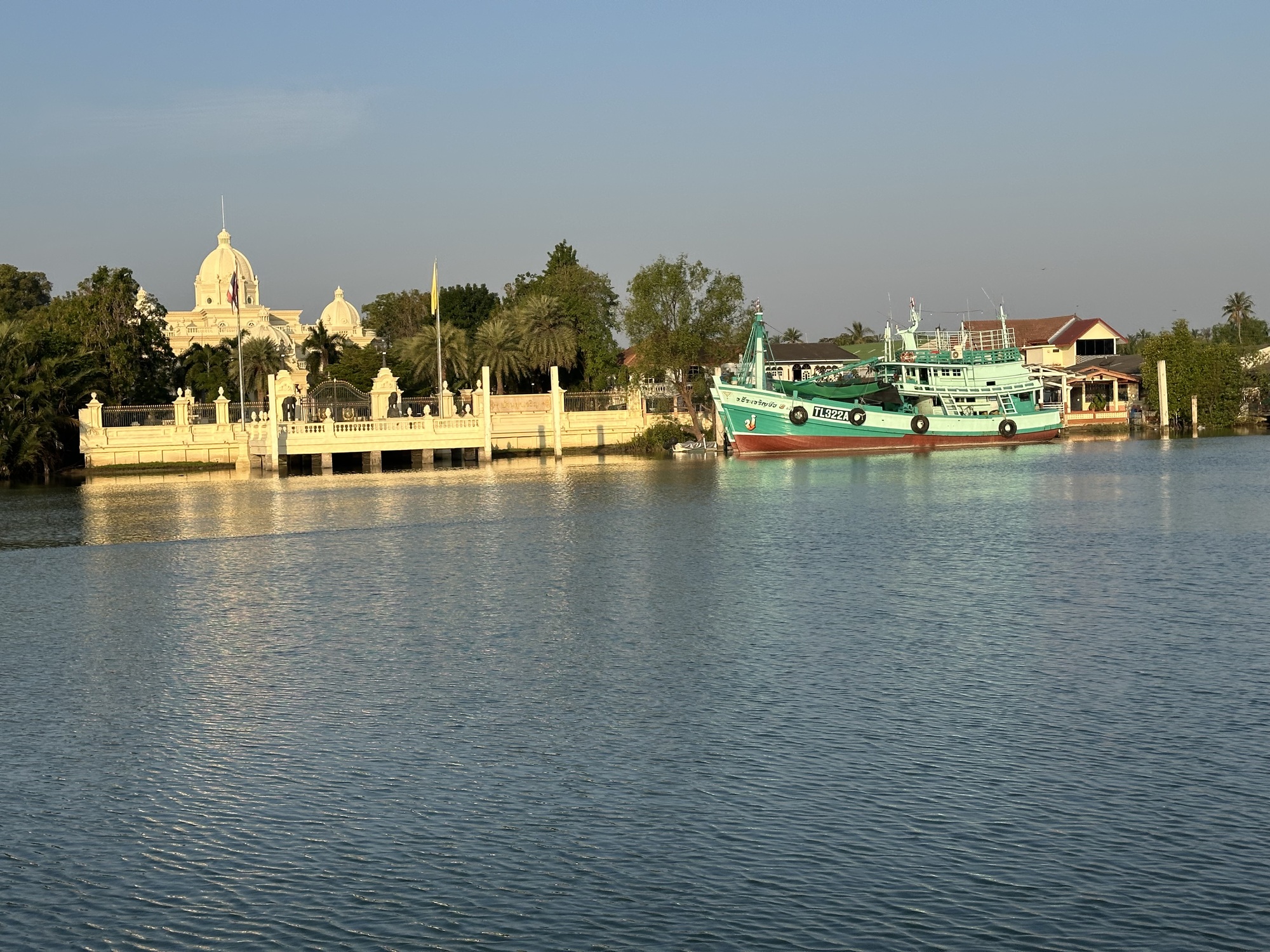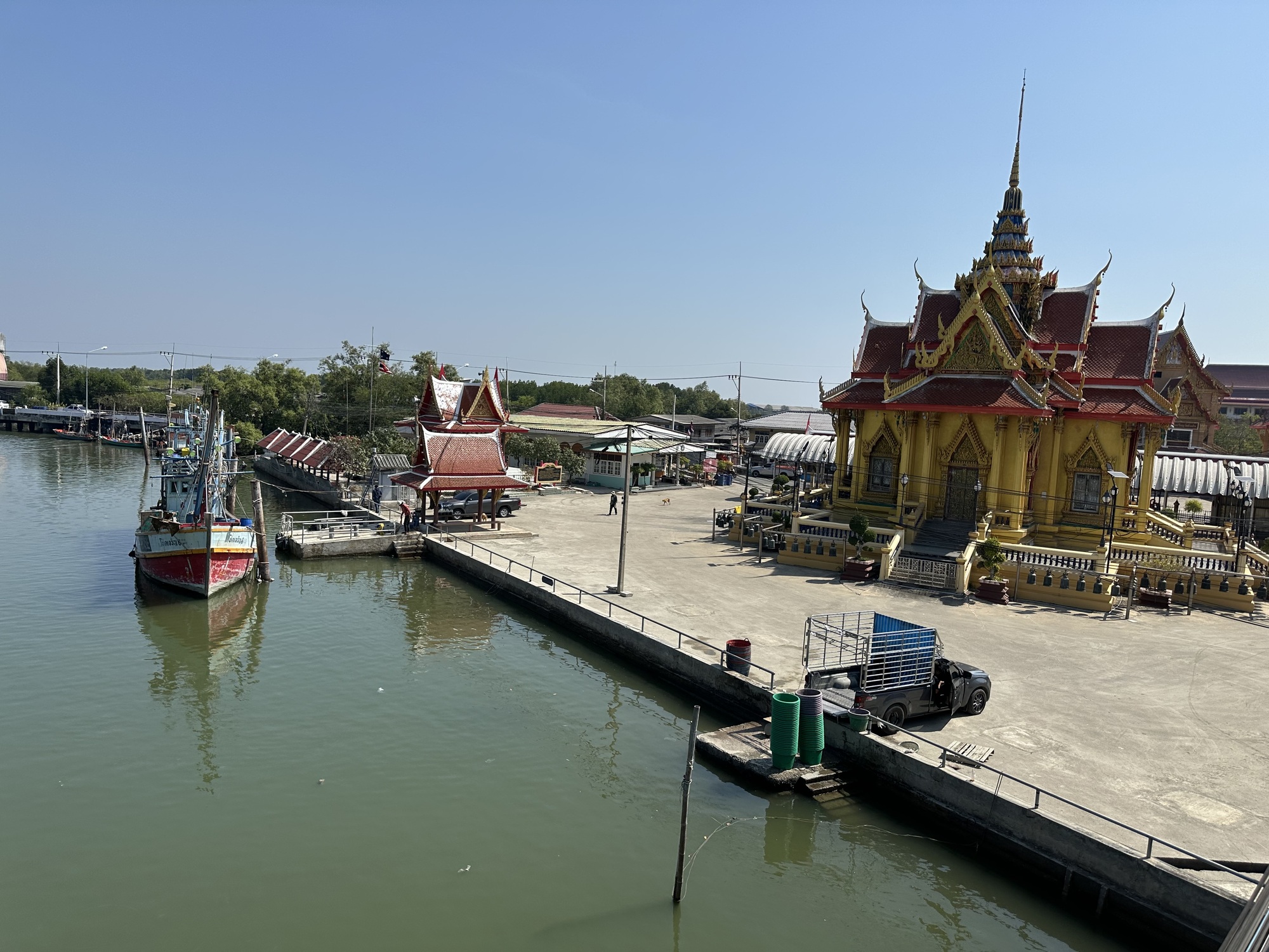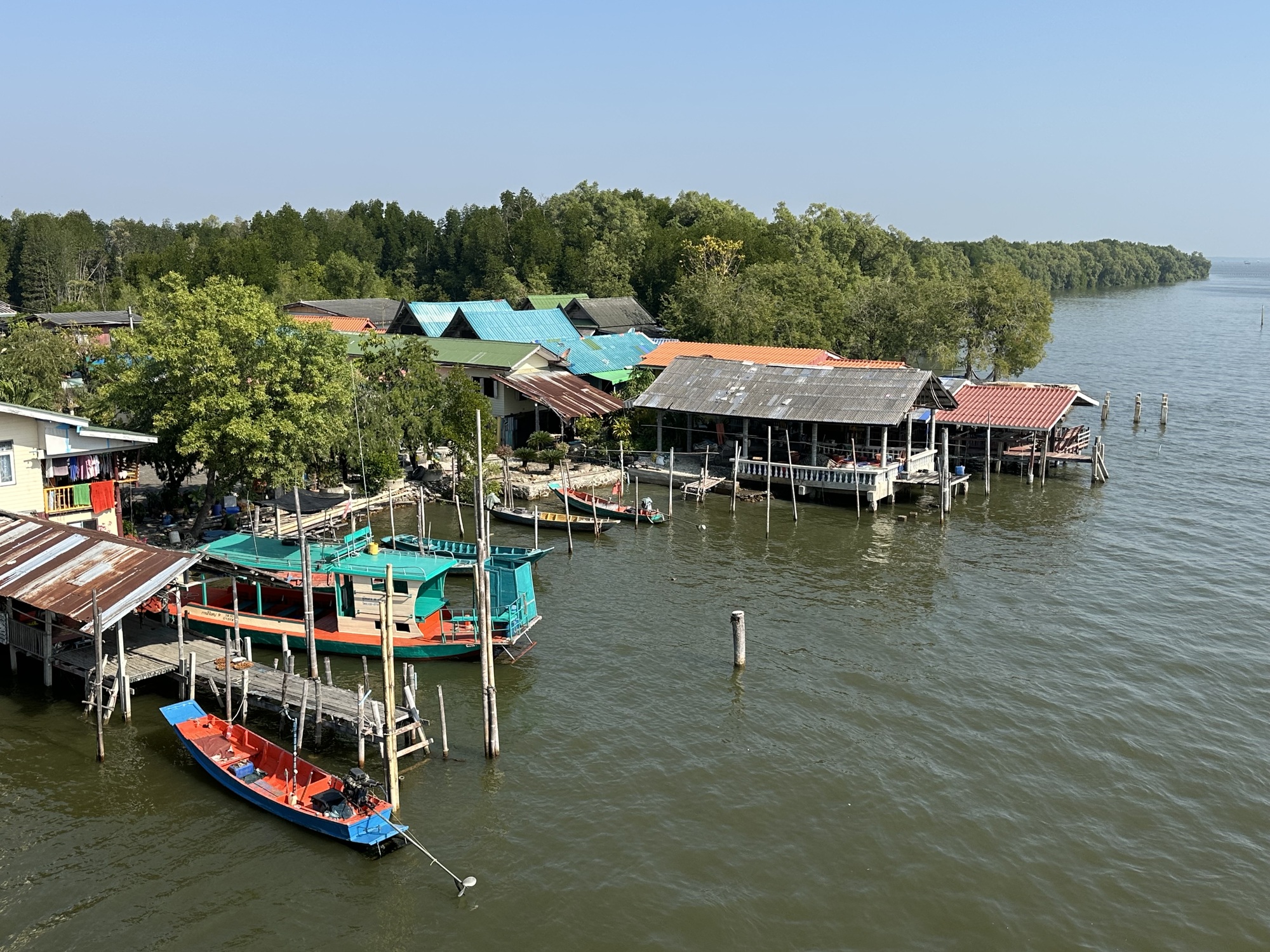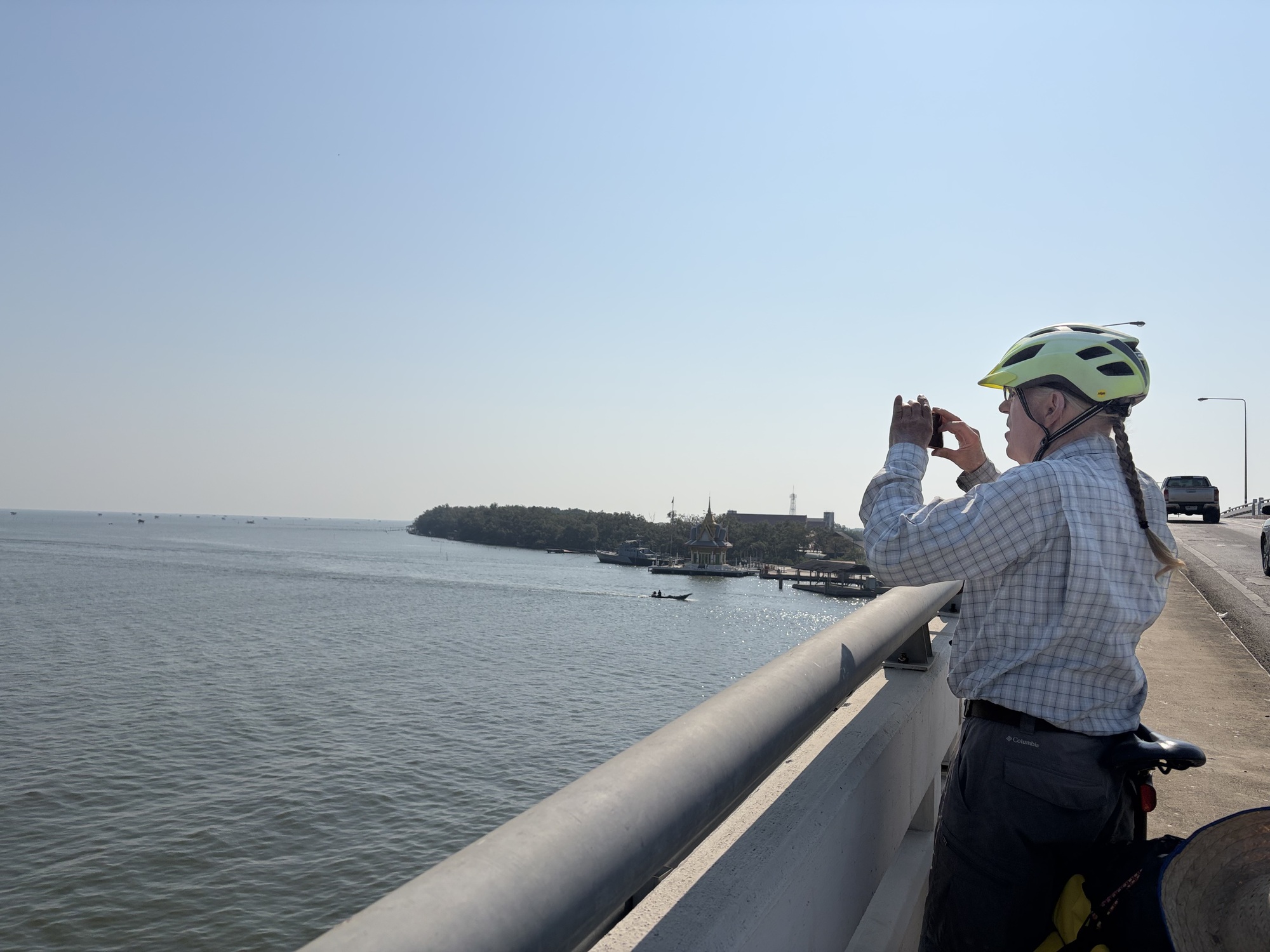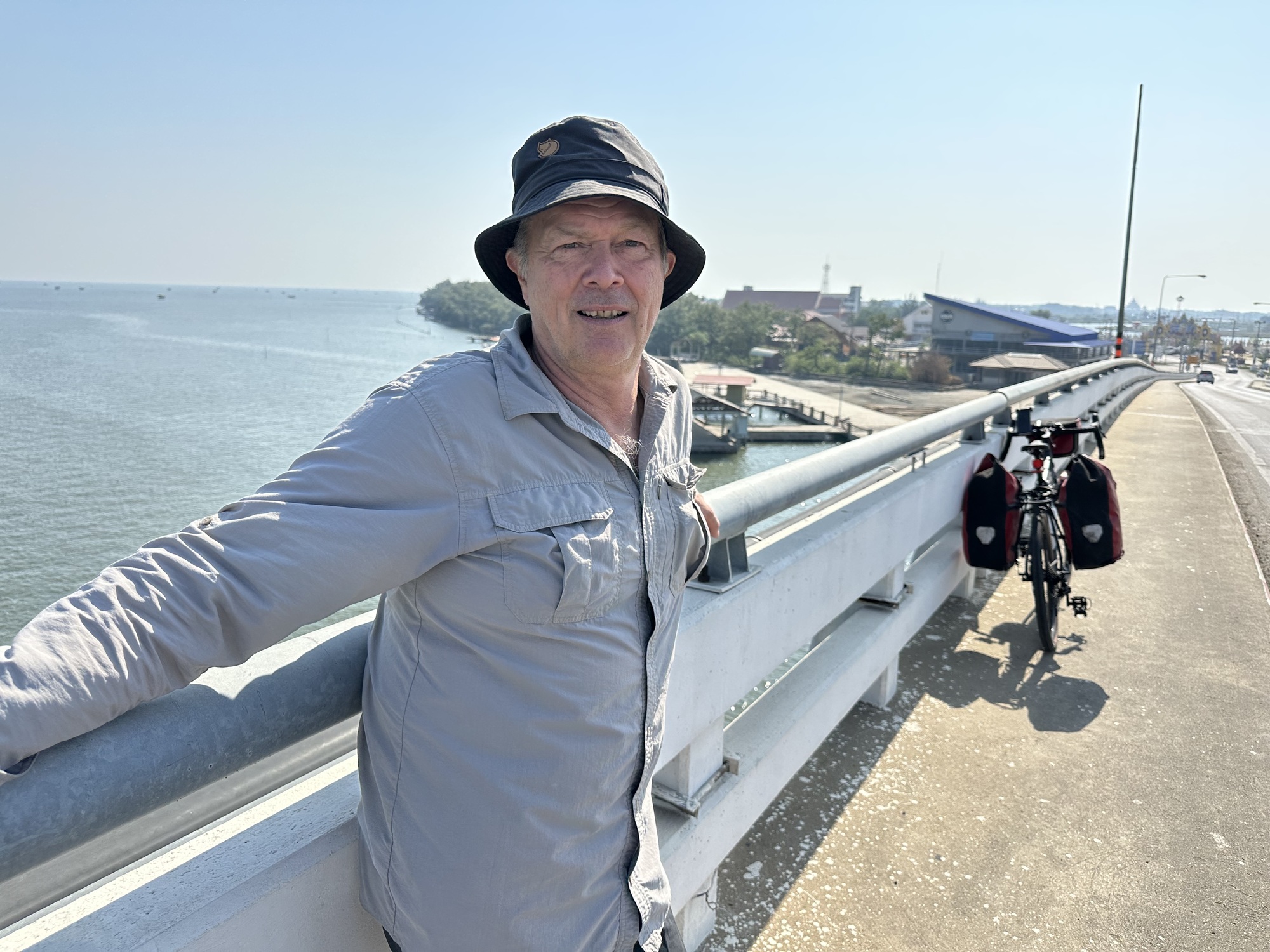 At one largeish inlet was a bridge so steep it could have been in Vietnam, so steep that we walked our bikes and at the top was a lone bike tourer, a Brit that lives in Denmark. We had a fun conversation with him but the sun was beating down on us all, and our goal was Phetchaburi or bust.