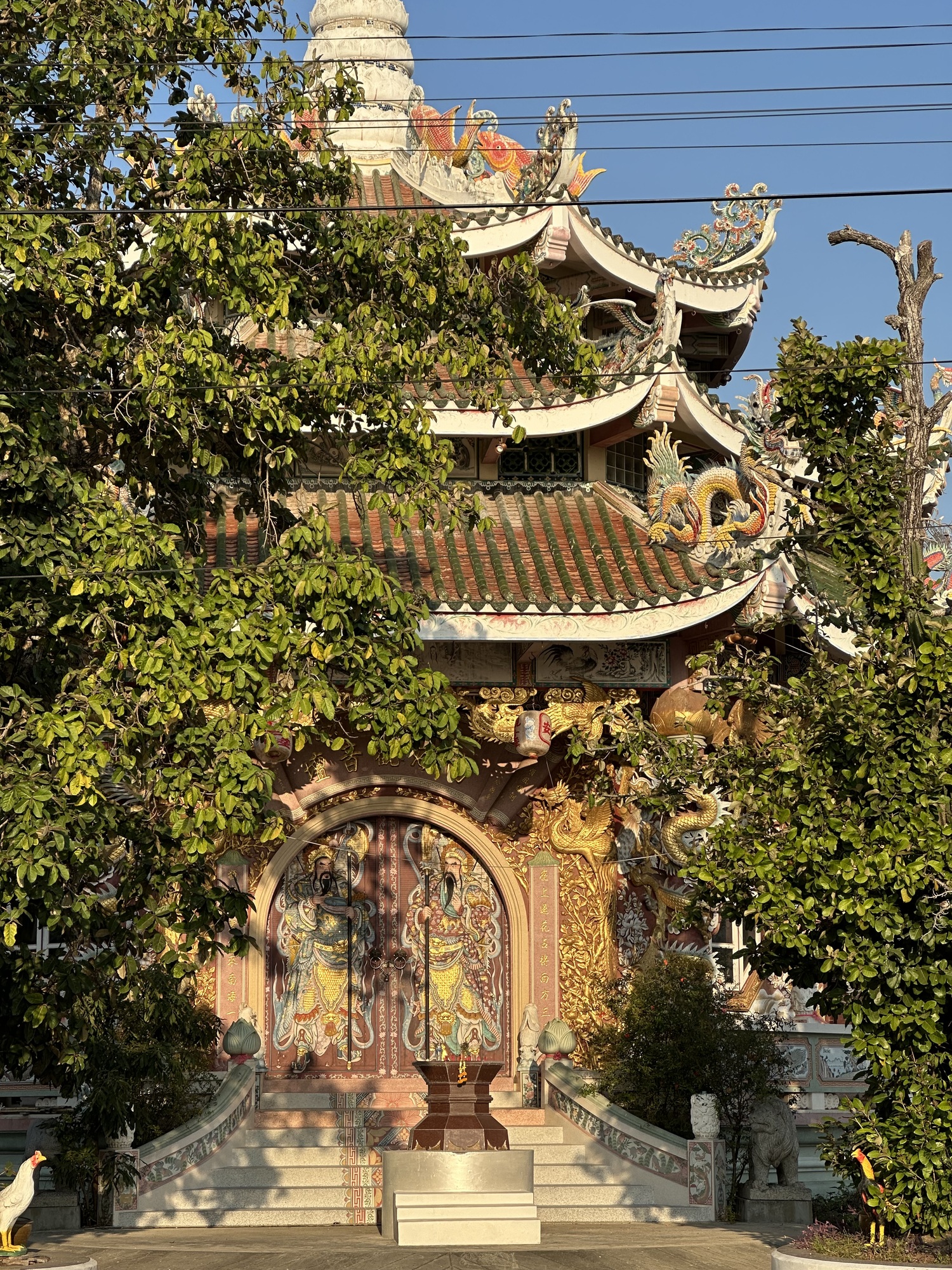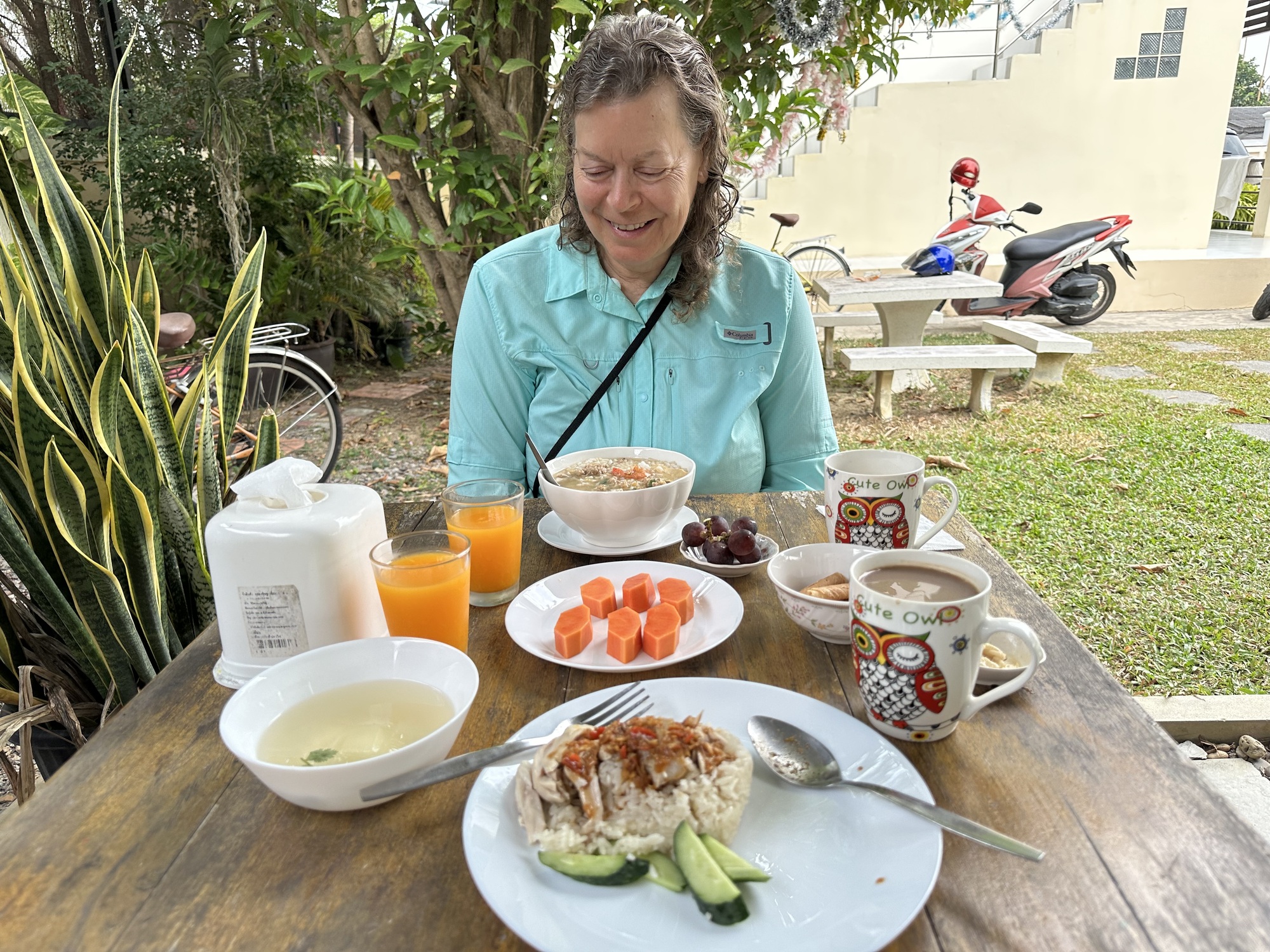 So the next morning, we strolled out into the yard and sat down to an absolutely lovely little breakfast provided by the owners. We had khao man gai (chicken rice) and khao tom (rice soup), fruit, orange juice, and coffee. Delightful and restorative. Two Czech guests came down and ate alongside us and we ended up yakking with them for a couple of hours.