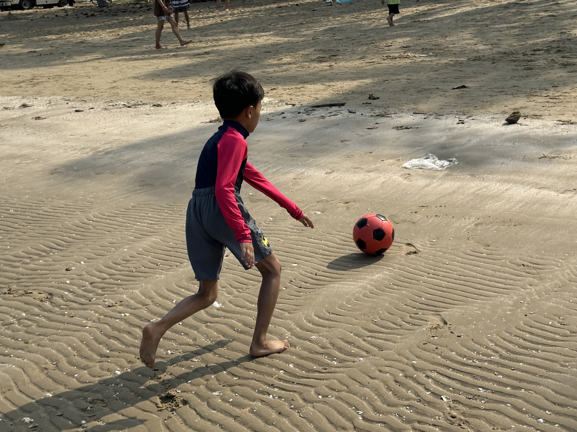 The next beach also has a lot of resorts but they’re on the opposite side of the road from the beach, which is composed of huge flat rocks and here and there on the rocks are little kiosks and tables and such. A walking/bike path wends its way through all this, and it’s shady and cool from the Australian pines. There’s a spot where a clutch of stray dogs lives, completely mellow and presumably fed by the neighbors, each pup having dug a little resting hole in the sand. No problems with these complacent dogs.
