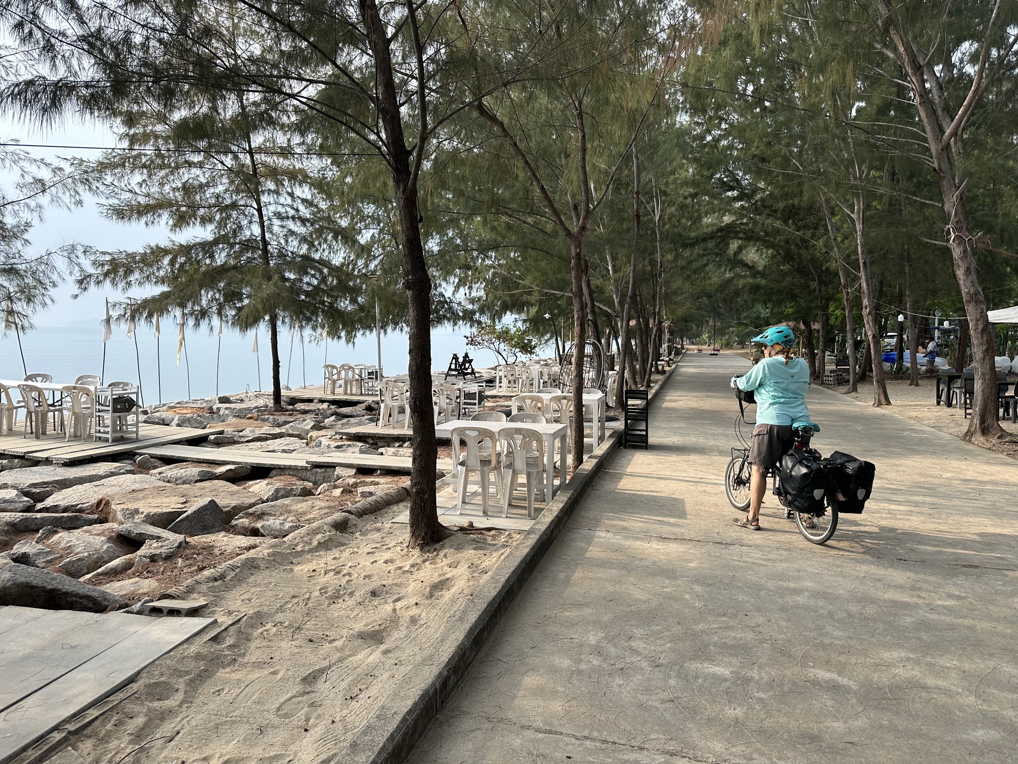 And there are spots worth seeing along this coast that we have missed in the past. Sam Roi Yod Beach is a lovely beach and we’re headed there today, but it’s also part of a plan to visit a cave temple that we’ve wanted to see for a long time. So today, an easy 12 mile ride to the aforementioned beach town, and then use it as a jumping off spot for further adventures.
