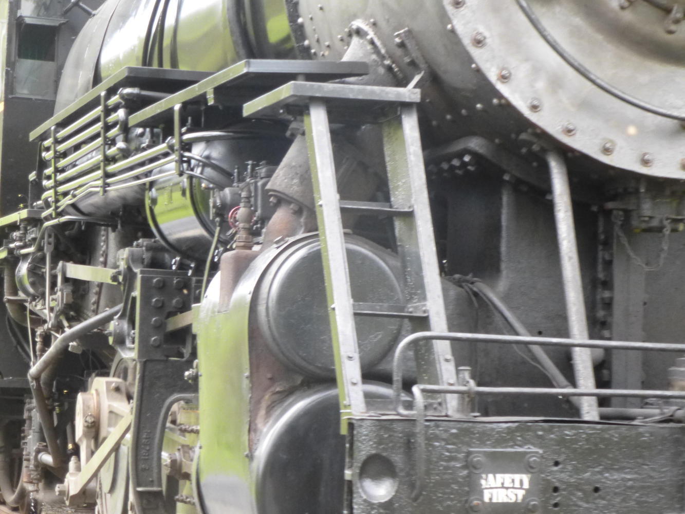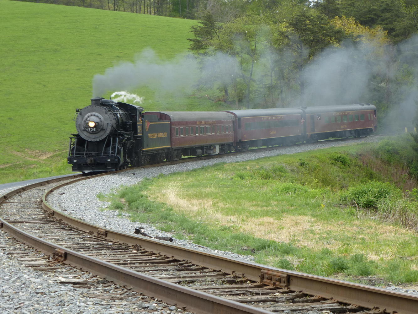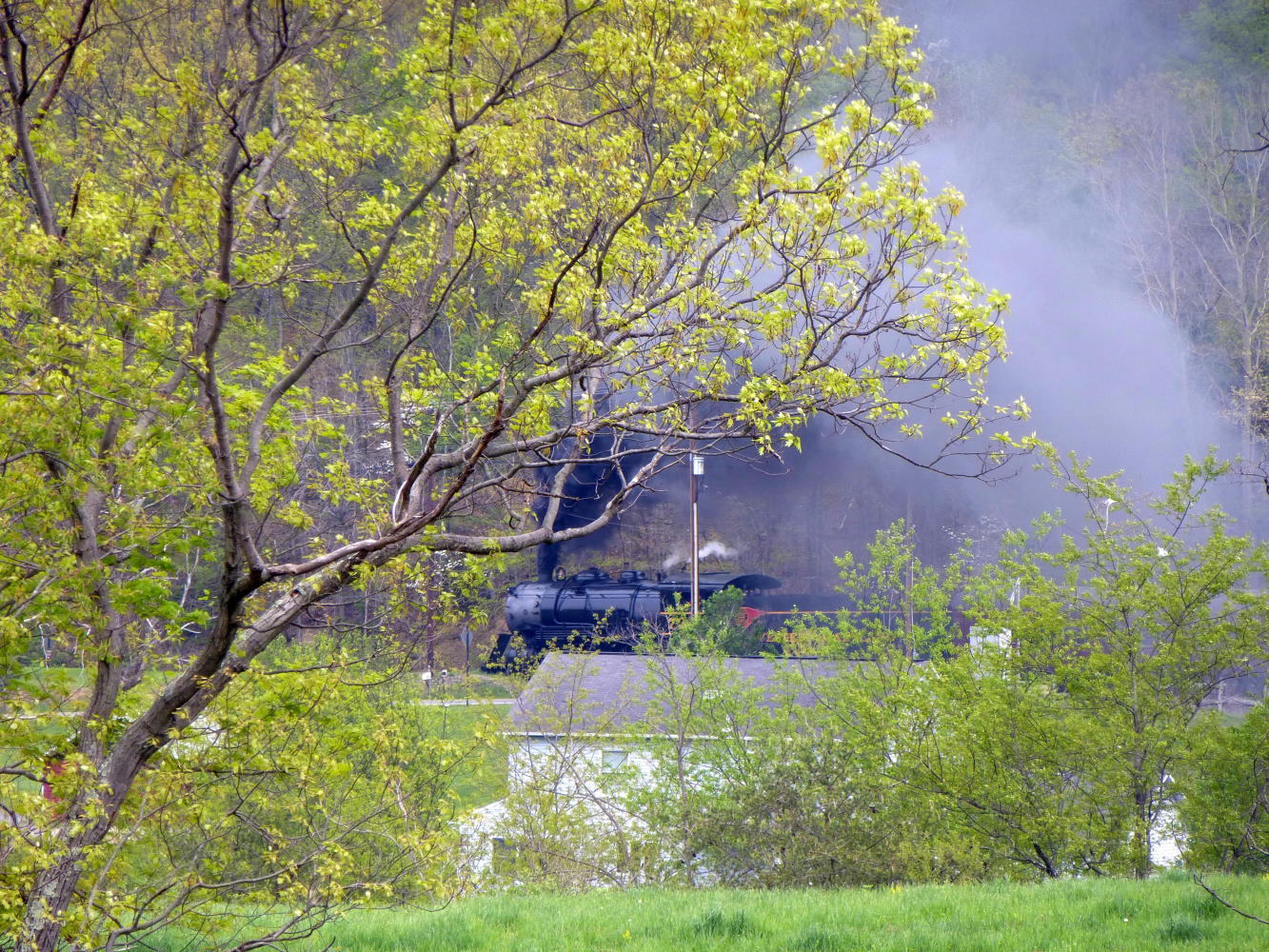 But it all changed as we left. The clouds gathered and the air grew heavy and occasional rain fell as we crunched up beside the railway, pausing at a curve to watch the preserved black and immensely mechanical steam engine thunder towards us on its return from Frostburg (named, Chris told me, not after mountain weather but an old mining family).