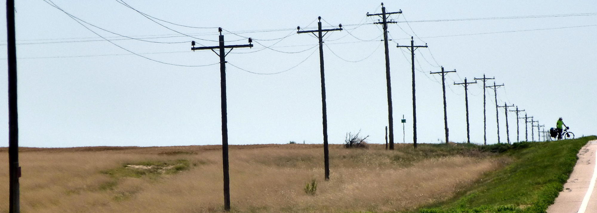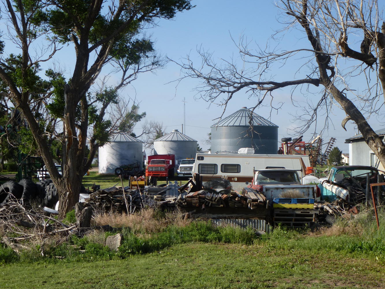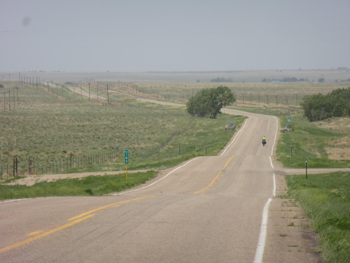 We got to Sheridan Lake after crossing into Colorado early this morning. The wind hadn't been as hard against us as we'd feared but it still blew dust clouds across the road and filled our nostrils with soil. This was a century after the Dust Bowl and nothing like what the region experienced then but it was easy to imagine how it had been. And how people fled. Especially when, out of one billow, chugged a man on a tractor little larger than a lawnmower, pulling two home-made wooden trailers, the first like a pigeon hut and the second bearing a board painted "Jesus Saves."