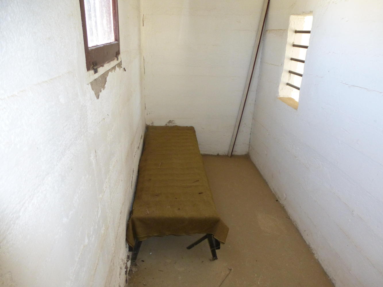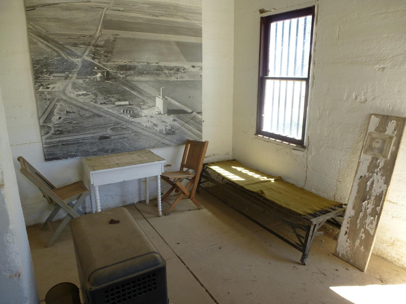 All this took unusual significance today because the wind howled in our faces, even after a 6am start, and the road climbed through unprotected, barren fields as we struggled to maintain 12kmh. By Haswell, the only community - I won't even say town - we were on our knees, dry, drained and ready for the little gas station and junk collection ("antiques" to be precise). And there we sat and drank and felt sorry for ourselves before stiffening the sinew again and setting off through the wilderness after a brief visit to the village's jail, described on a weather-beaten sign as the nation's smallest.