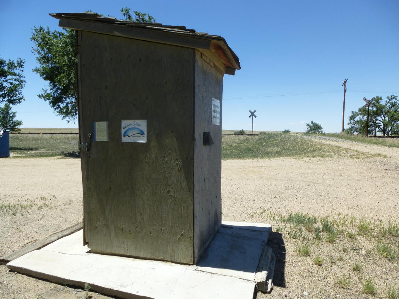 THERE ARE, at Arlington, no more than two houses, one with posters asking for votes for Mitt Romney, and a patch of sandy soil with a bench, a few trees and a wooden outhouse described as a "comfort station." There used to be a guest book inside in which passing cyclists could register their passage geographical and anatomical and there still is a sign bidding them welcome.