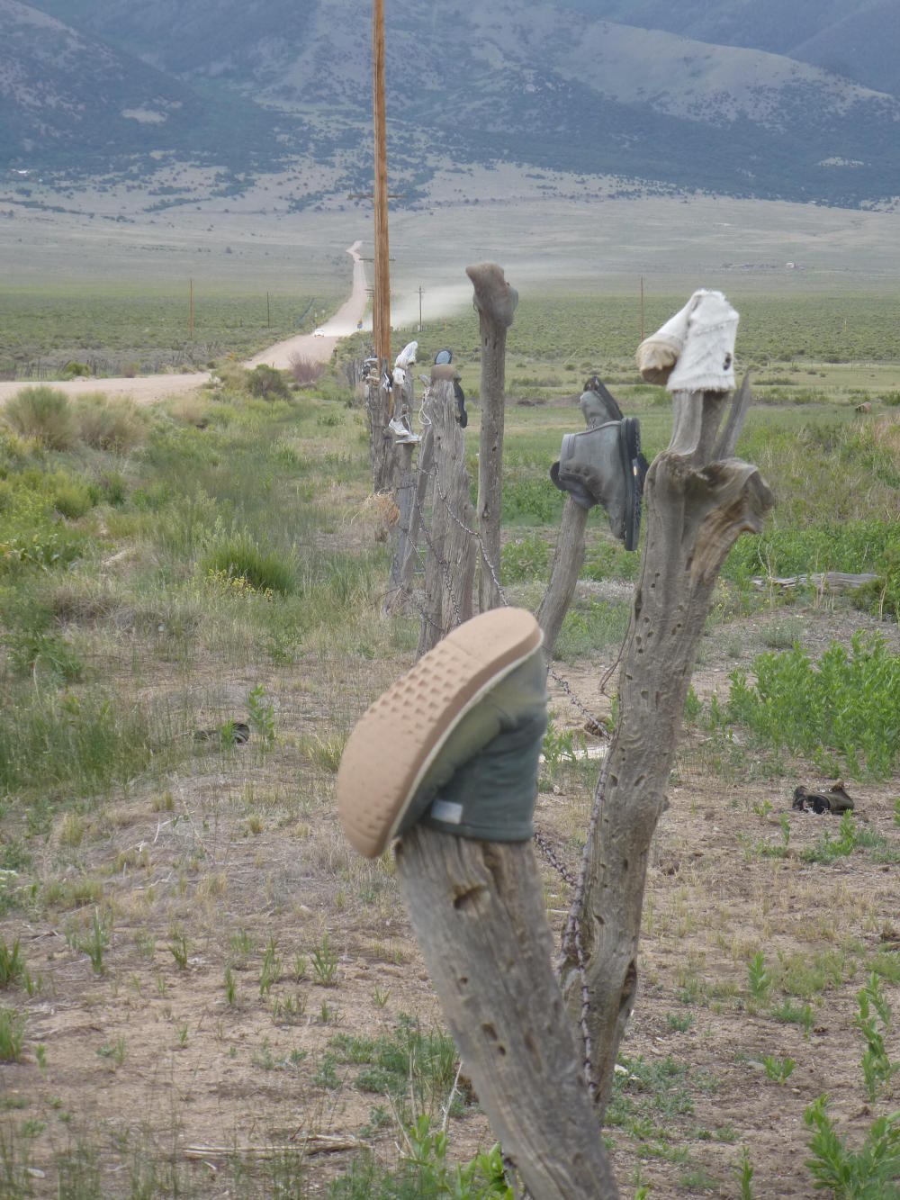 Since there's little else to look at, perhaps one day someone spotted an old shoe or a boot and hooked it over one of the wooden fenceposts. And then, the boot unclaimed and eyes now peeled, more old boots were found and hung on the next posts in line. So that, now, there are harvests of boots even if there's no harvest of anything else.
